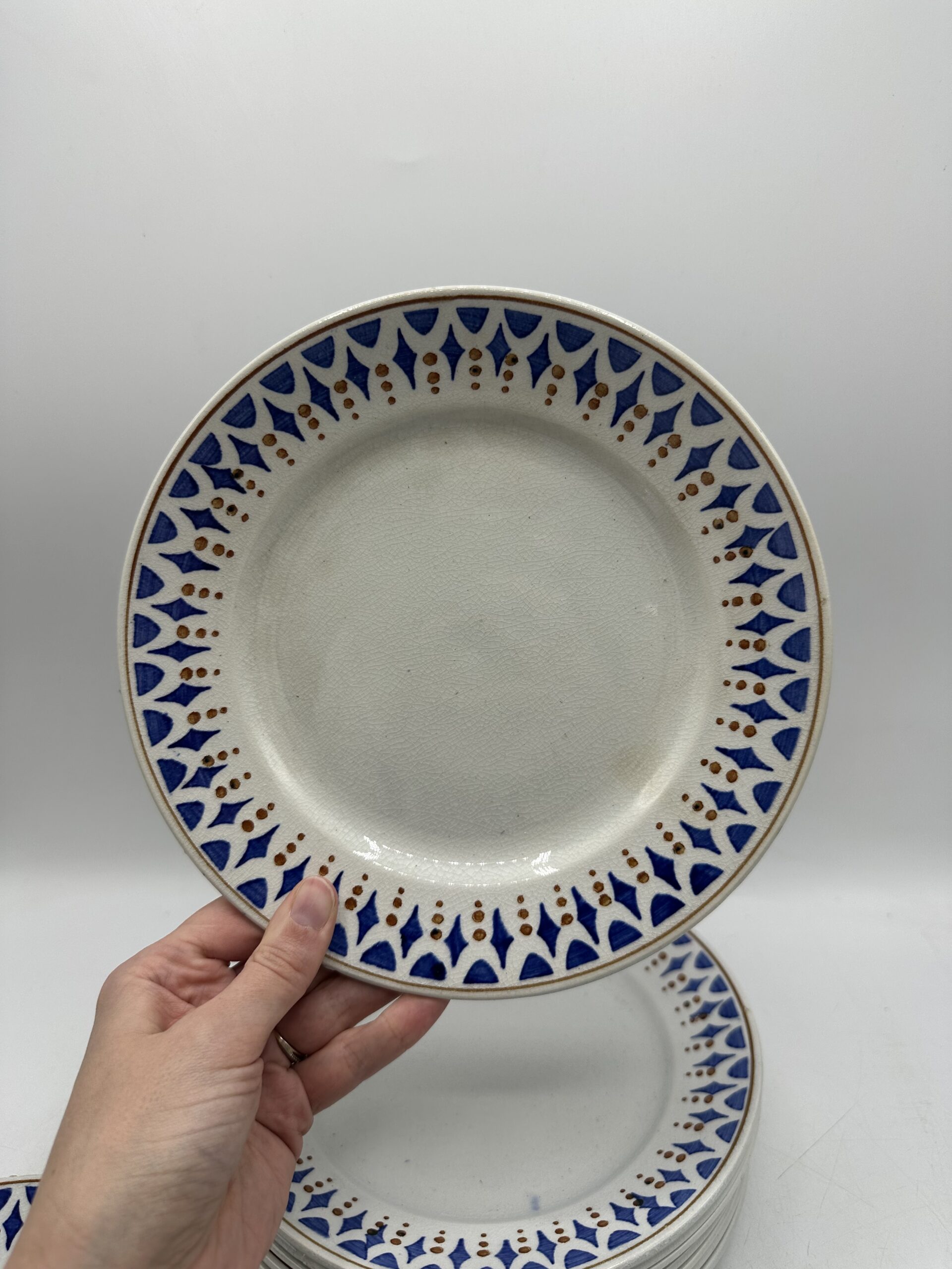 Ces jolies assiettes signées Luneville laissent apparaitre une frise aux motifs géométriques de couleur bleu et marron. A la fois simple et travaillées, ces assiettes s’accorderont dans n’importe quelle déco de table.