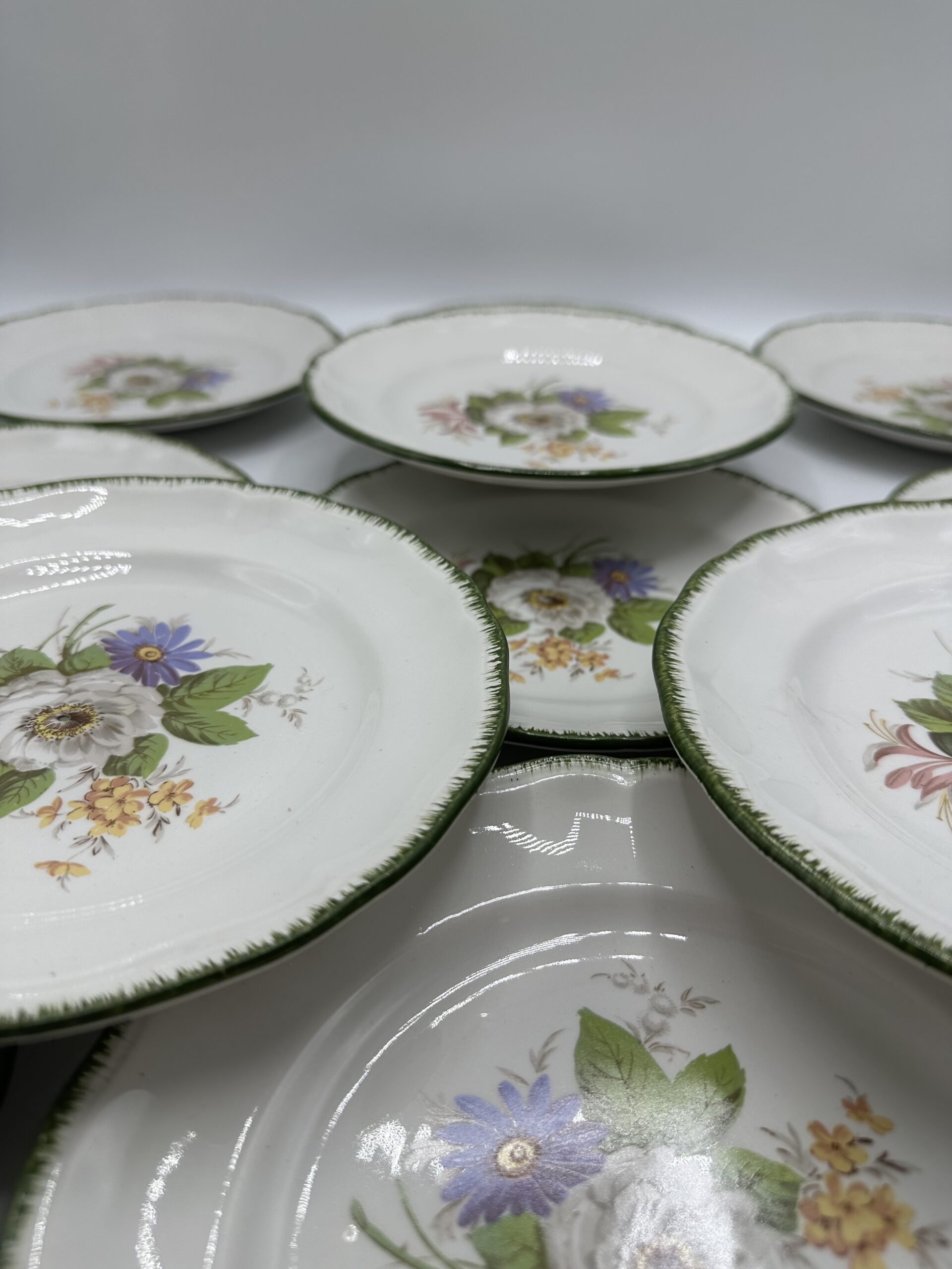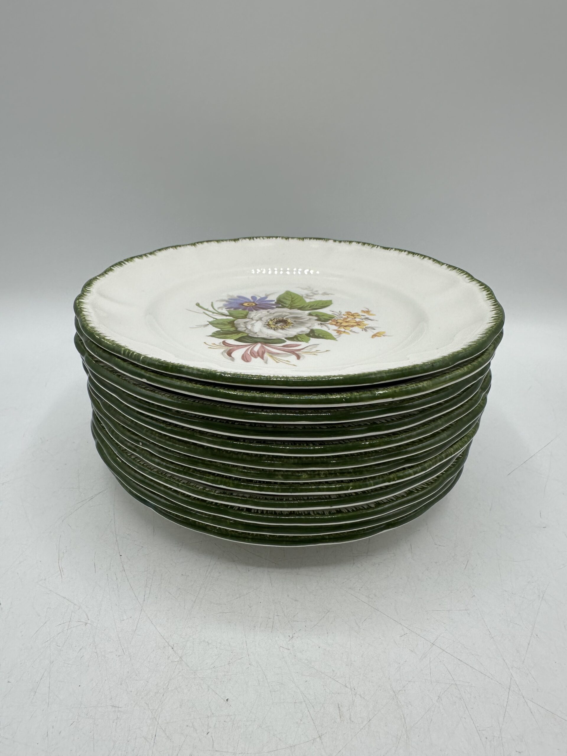 Ces jolies assiettes arborent un motif fleuri au centre en un beau liseré vert sur tout le tour de l’assiette. Les 12 assiettes sont estampillées KG Lunéville.