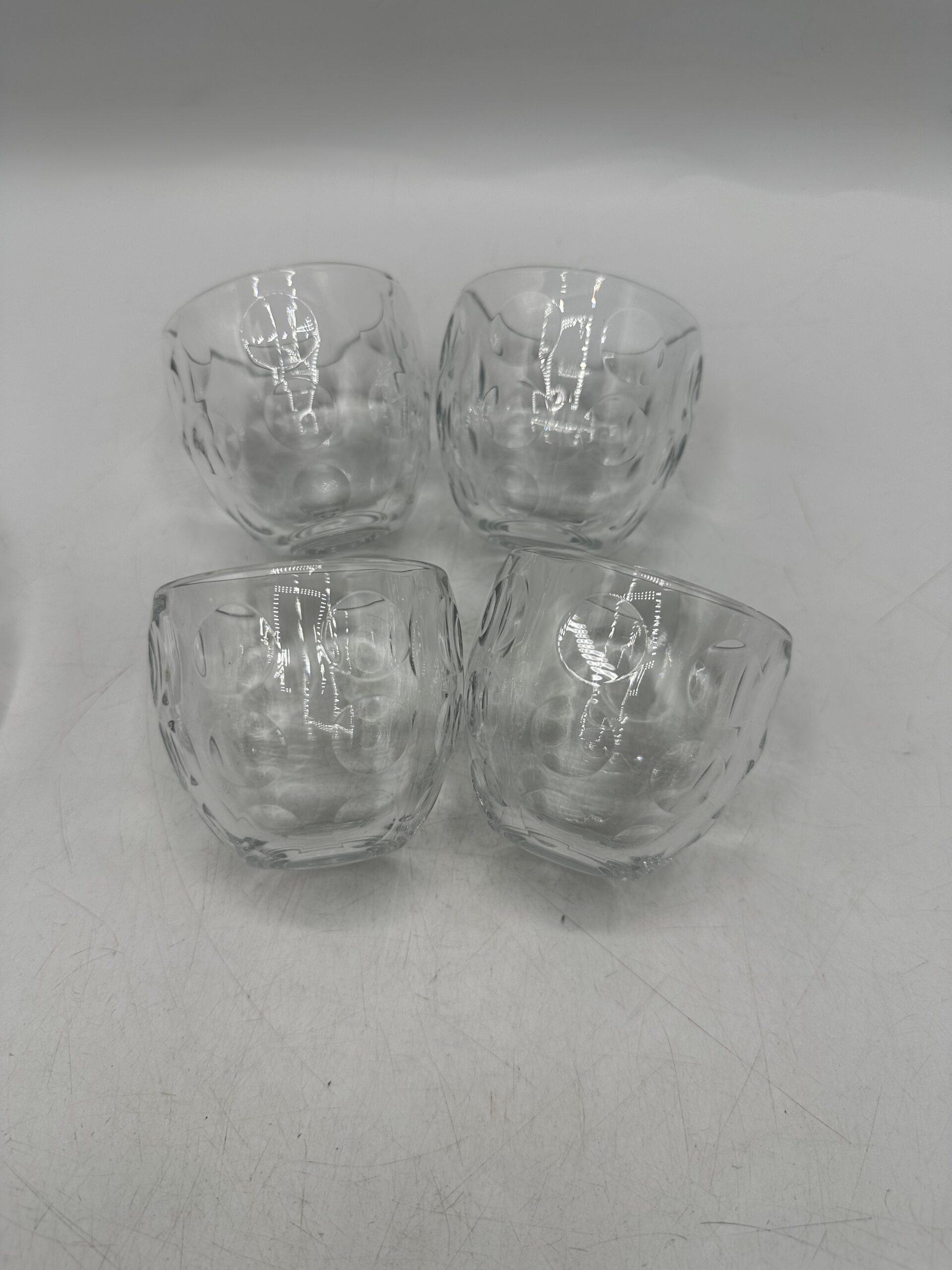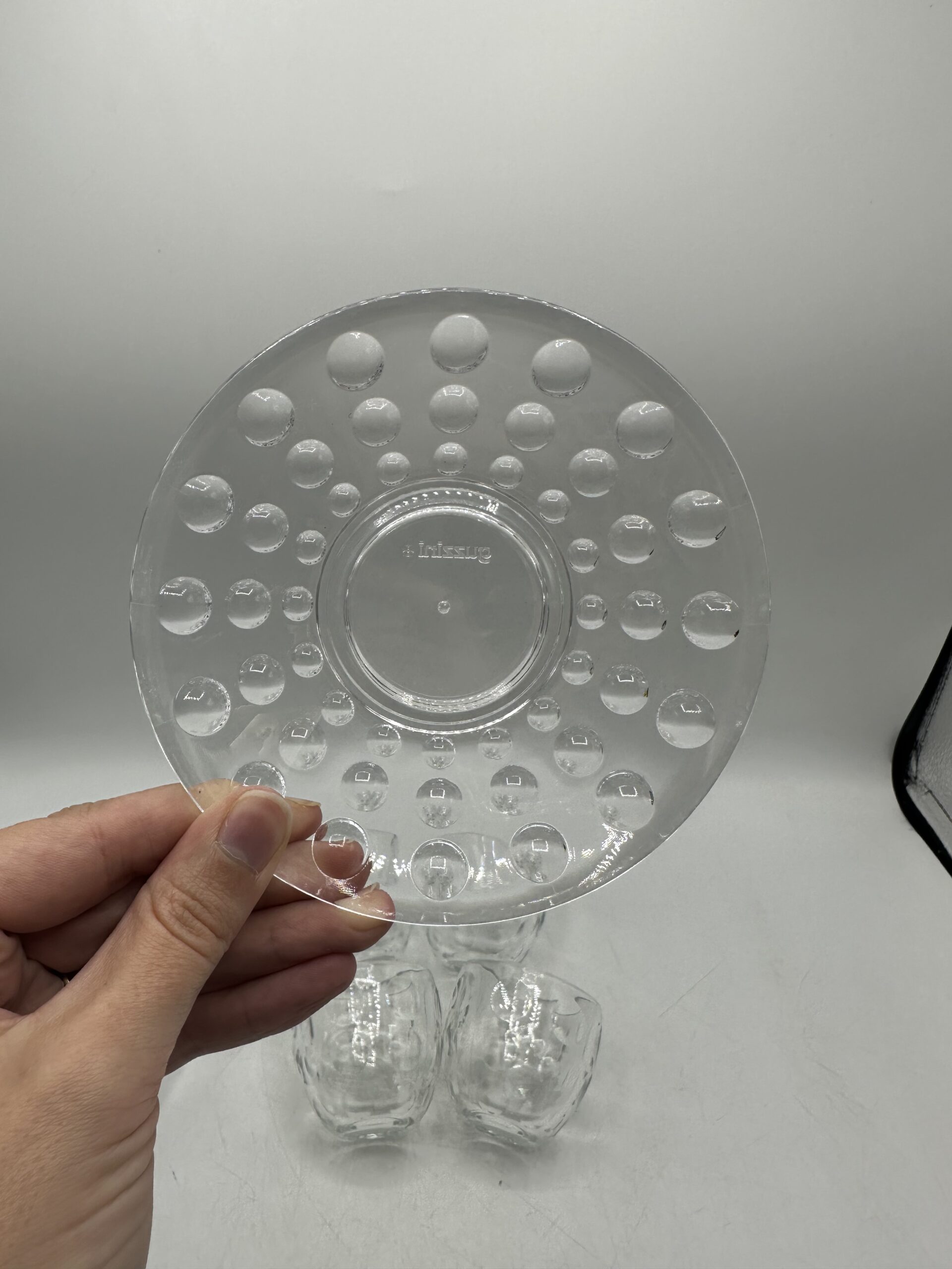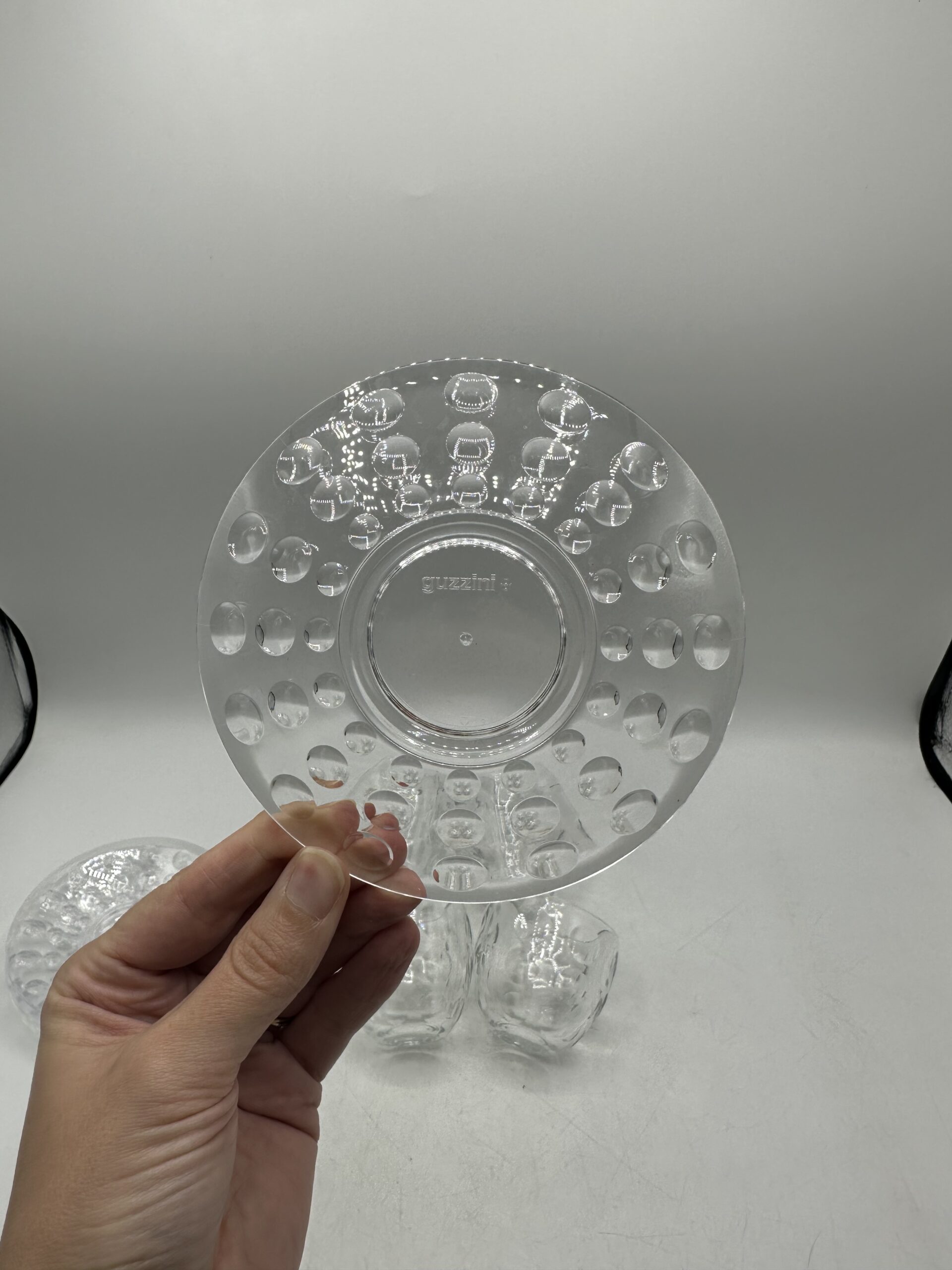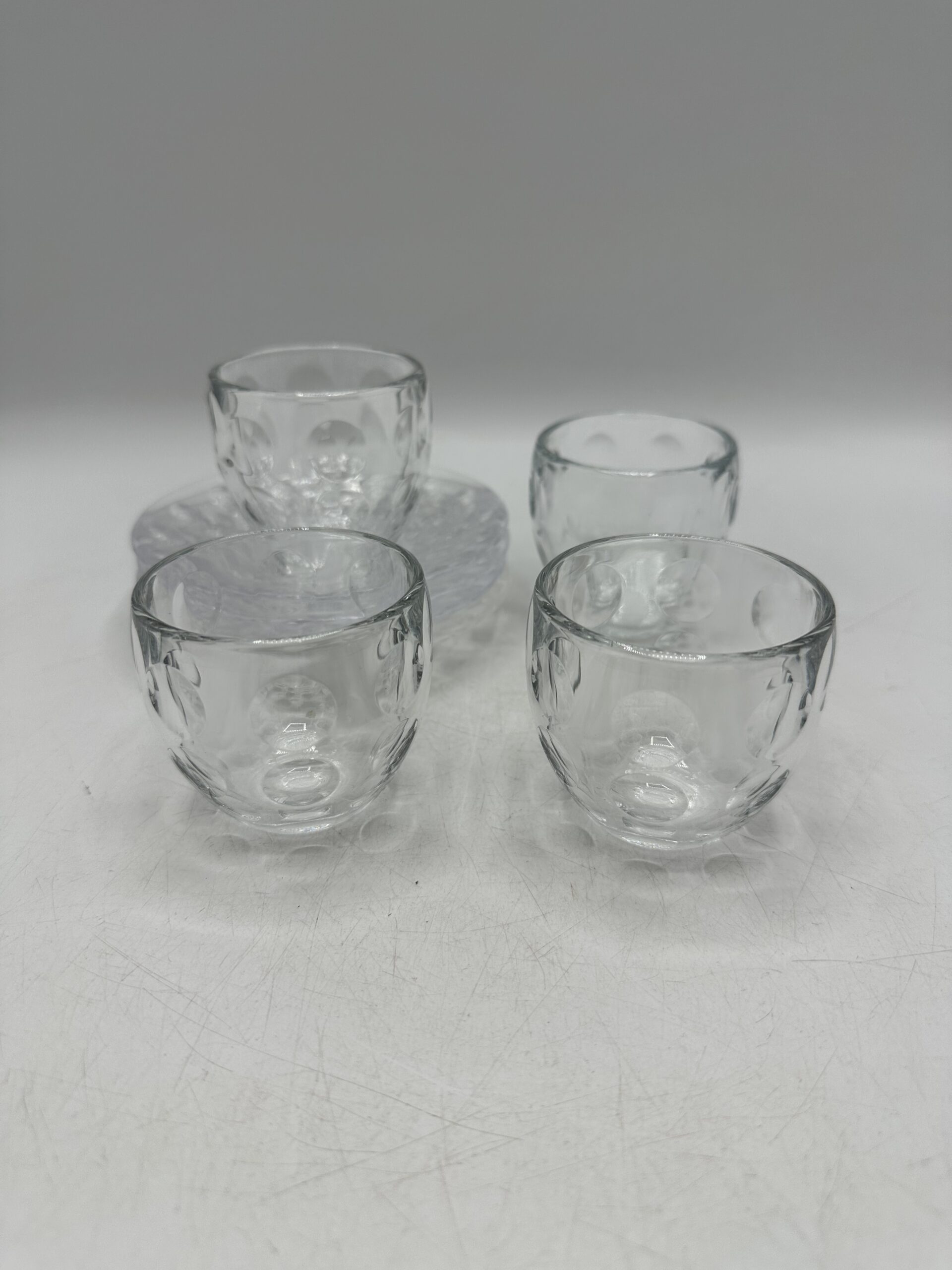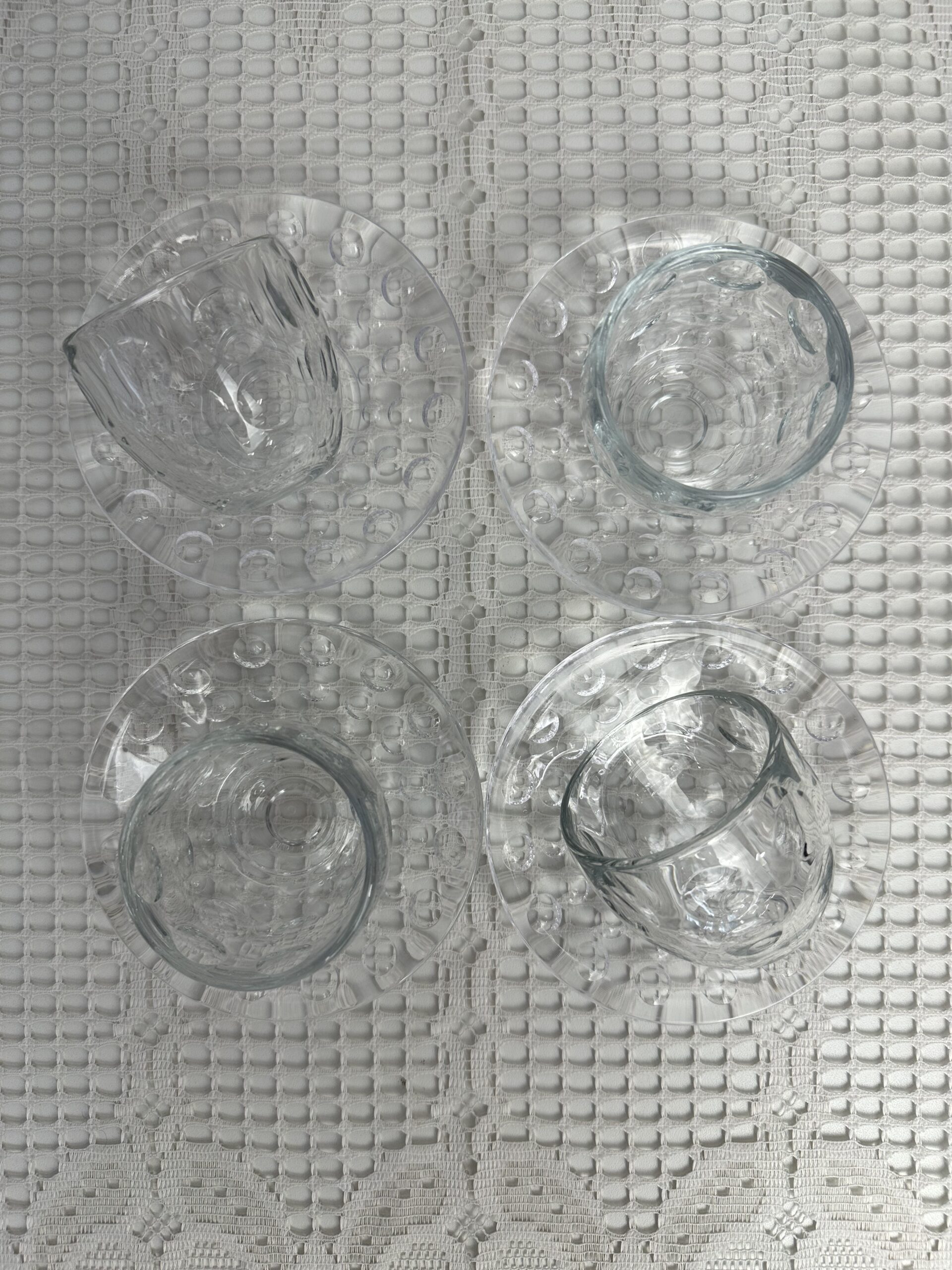 L’ensemble se compose de 4 tasses en verre transparent et leurs soucoupes en plastique. Avec des motifs de ronds en reliefs, c’est un look rétro gagnant !