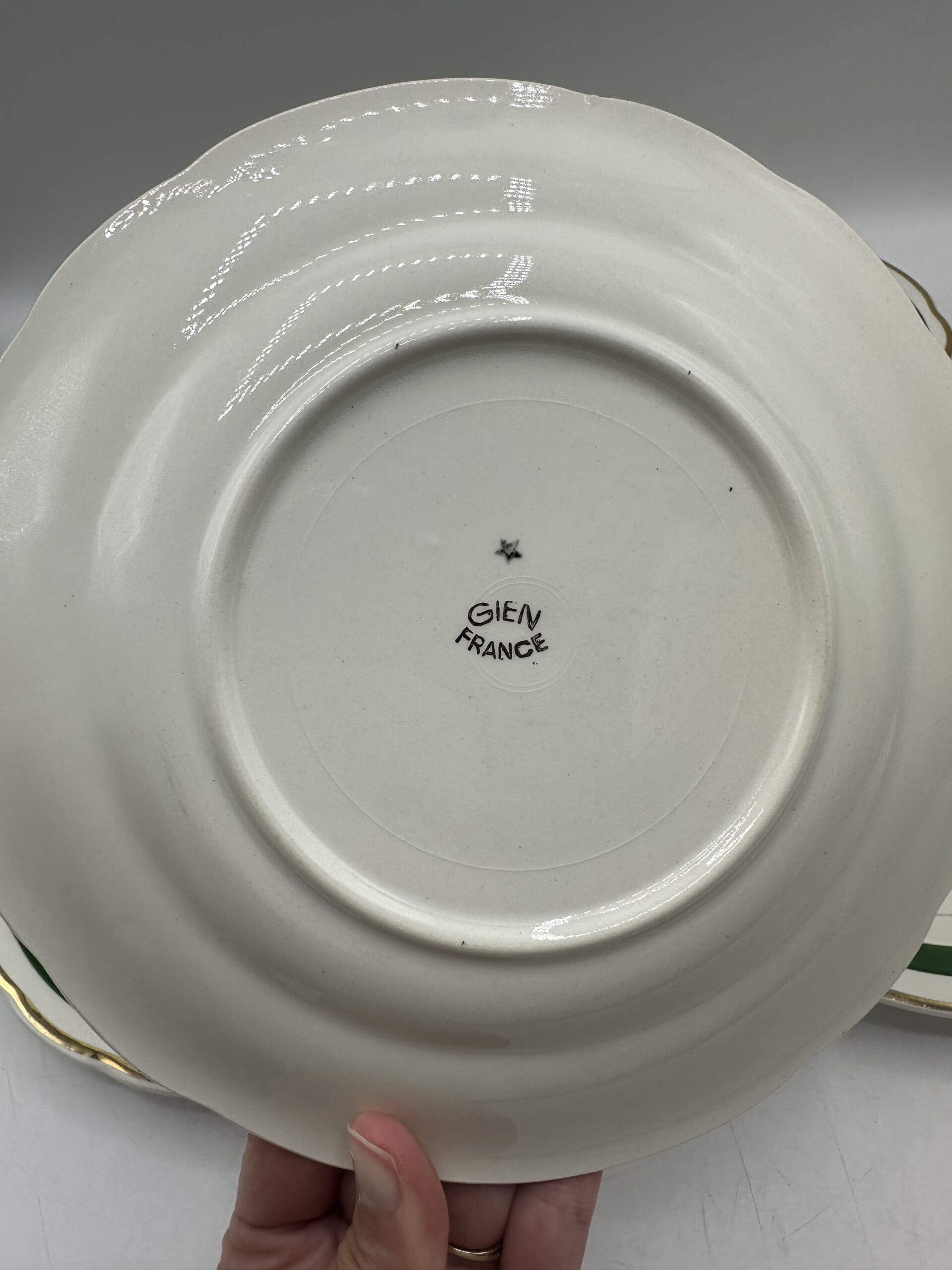 Estampillées Gien France, les assiettes sont blanches, avec une dorure sur les bords, une large bande verte à l’intérieur ainsi qu’une illustration de train avec la mention « Le chemin de fer ».