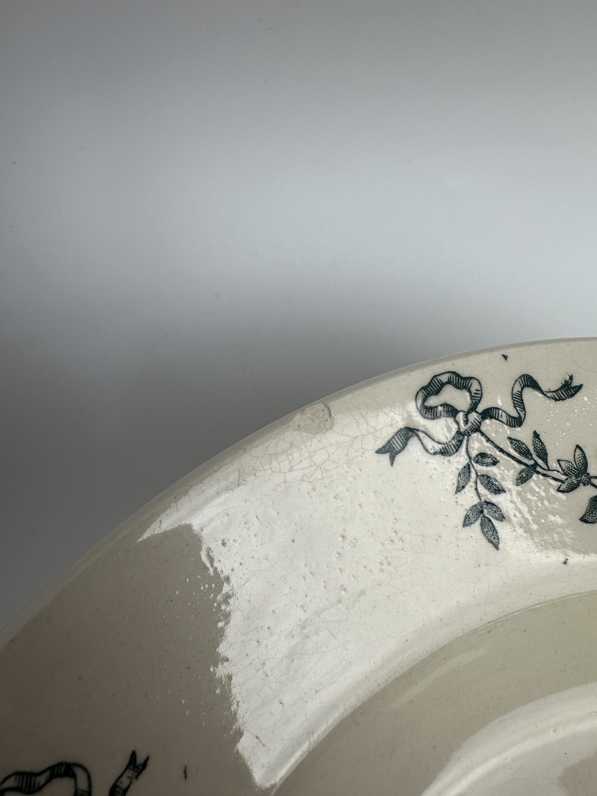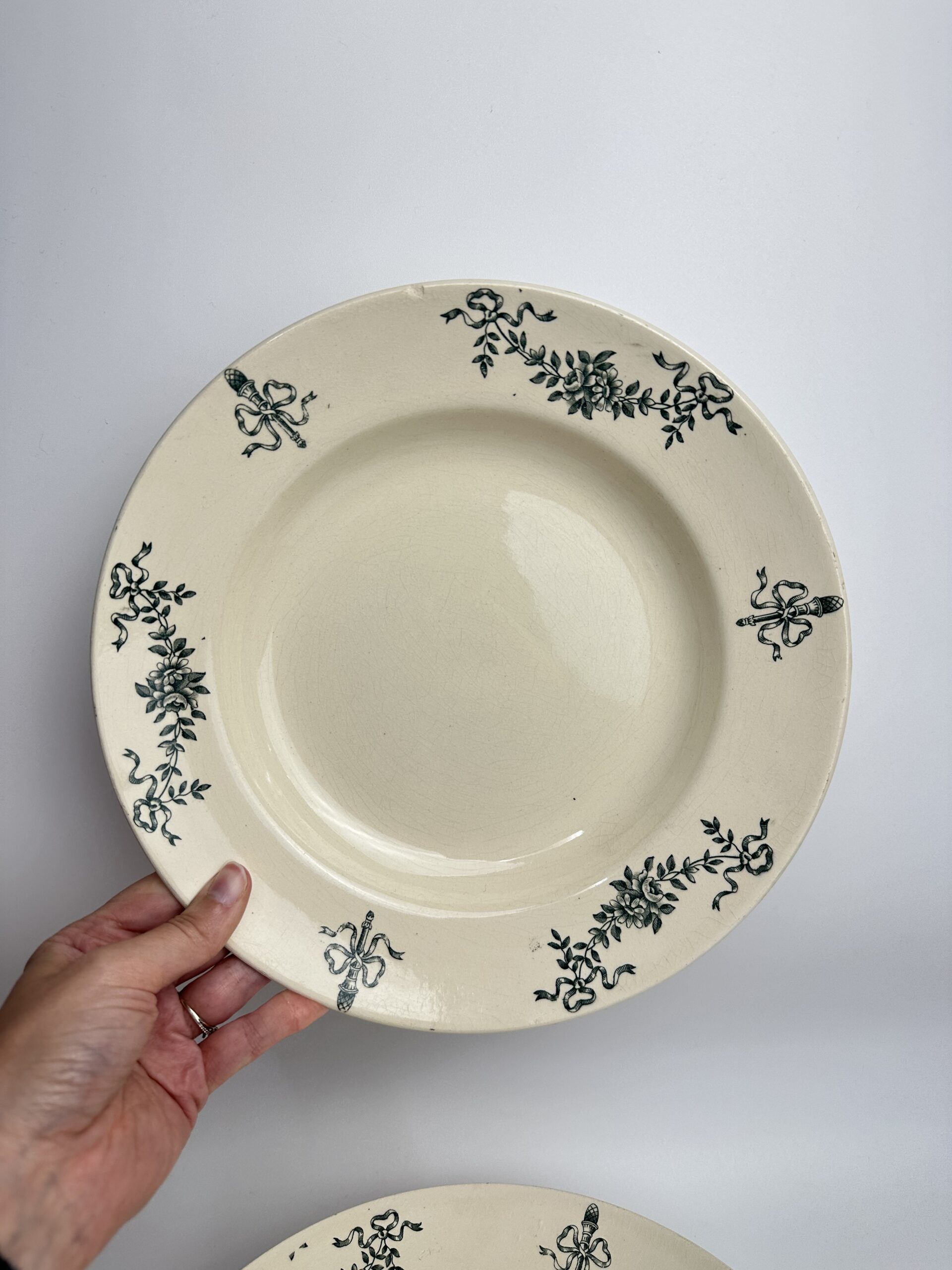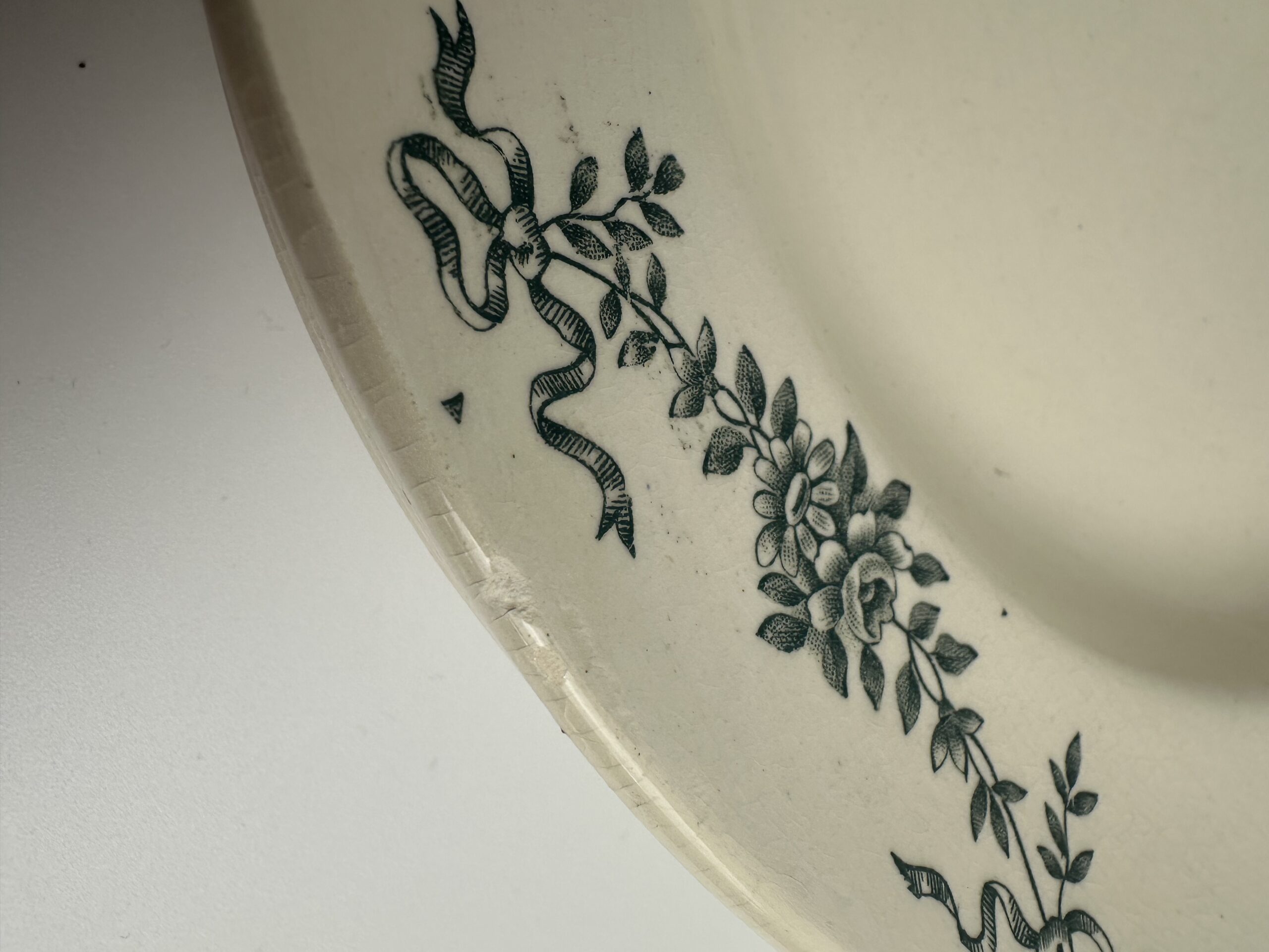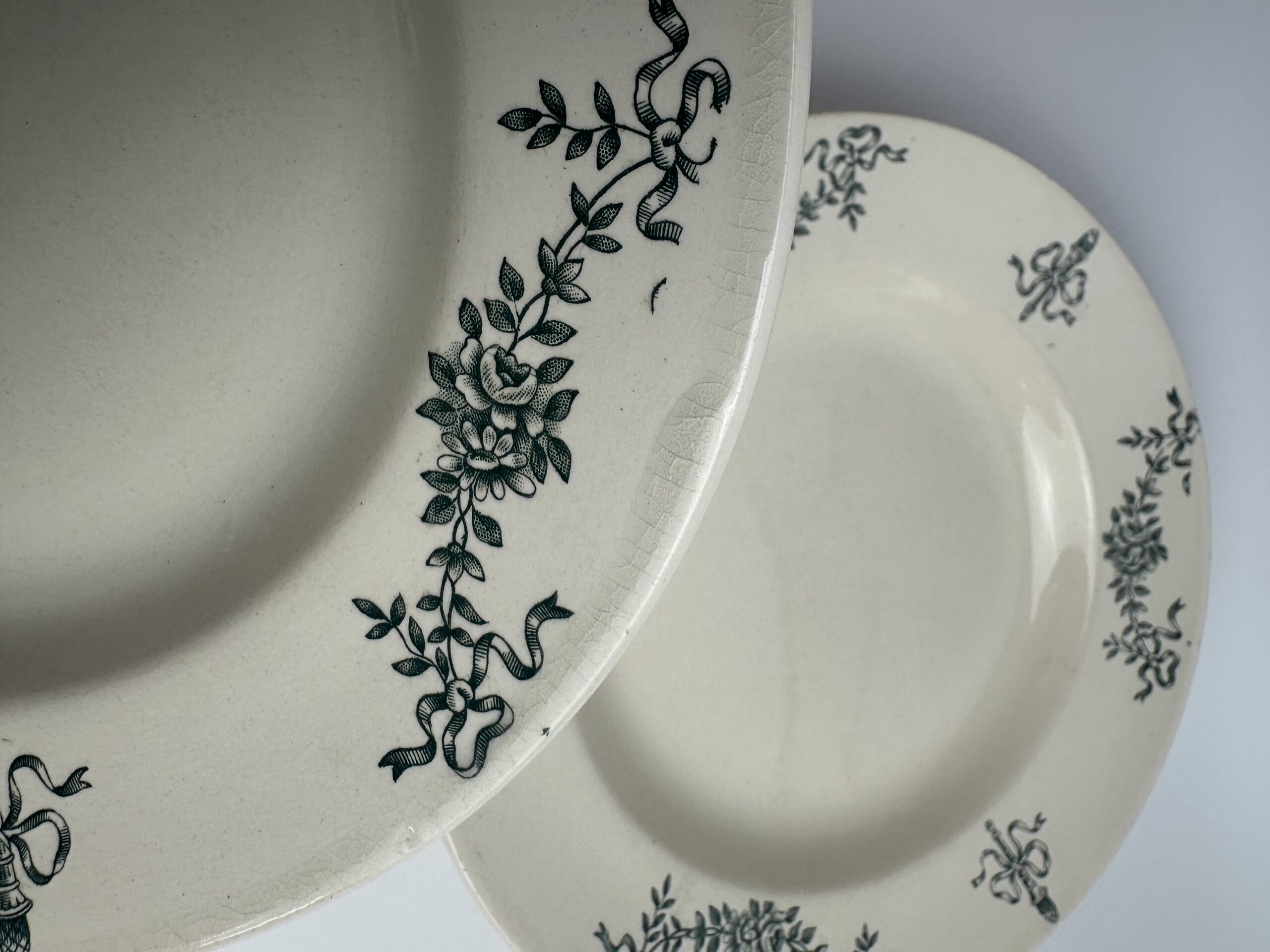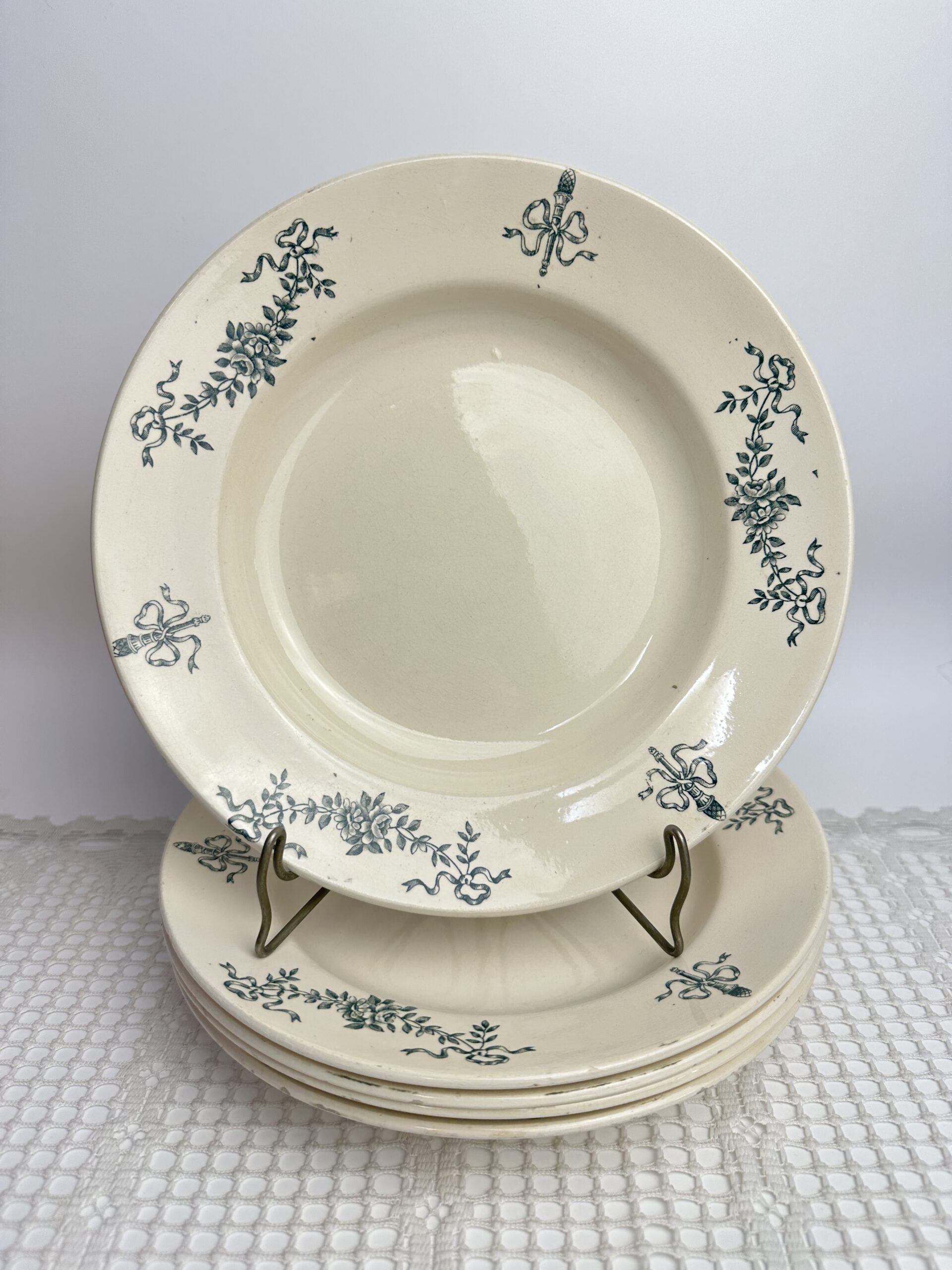 Sur un fond blanc crème, le pourtour des assiettes laisse apparaitre de très délicats motifs fleuri avec de jolis noeuds.