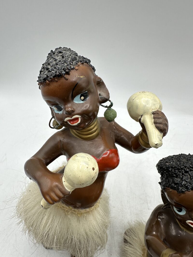 Ces statuettes africaines signées Royal Japan sont en céramique, avec des détails de bijoux des jupes traditionnelles et des couleurs chaudes.