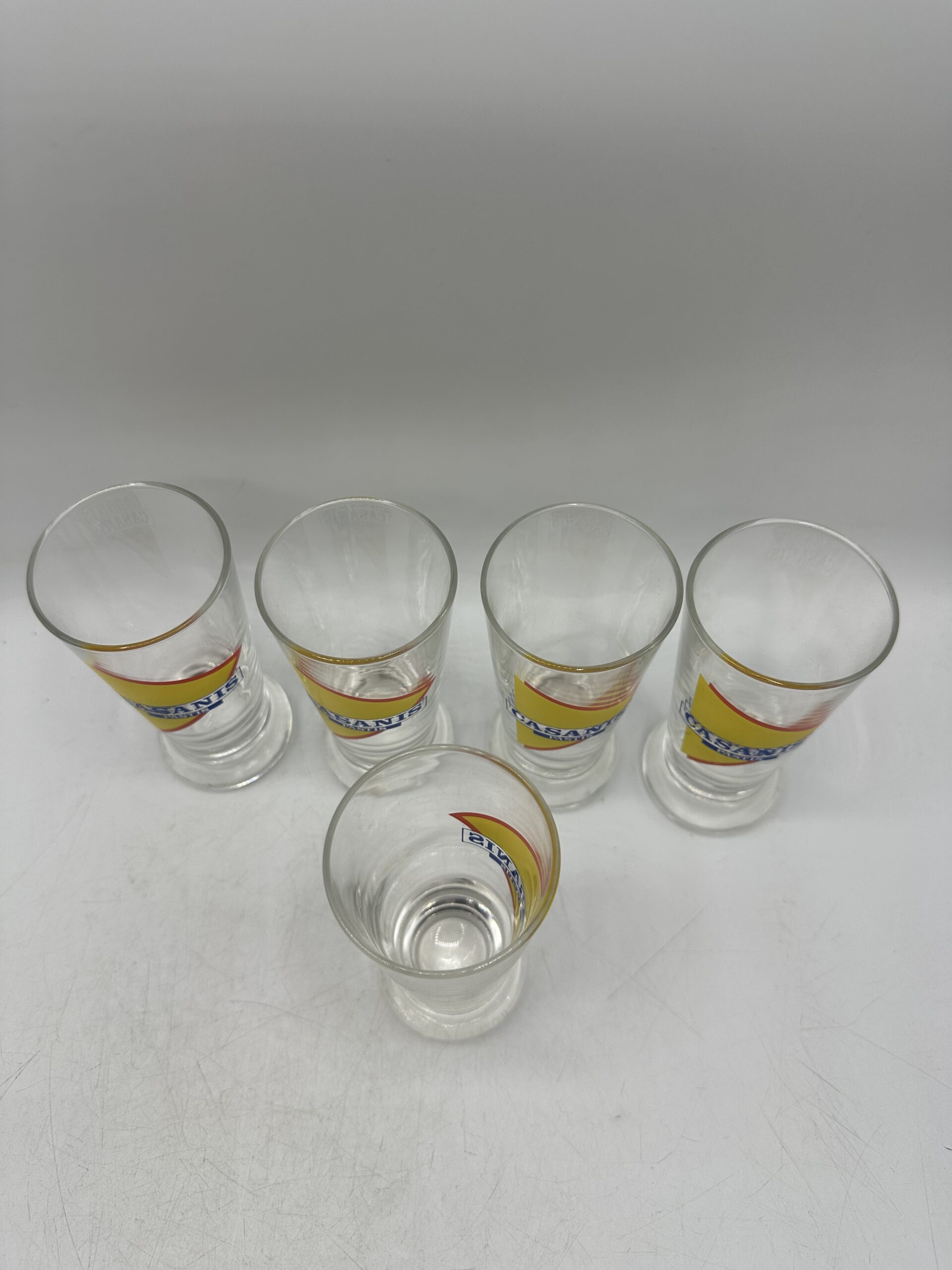 Les 5 verres sont en très bon état. Avec un motif triangulaire jaune et rouge et l’écriture Casanis Pastis en bleu. Une forme originale avec son pied large et lourd.