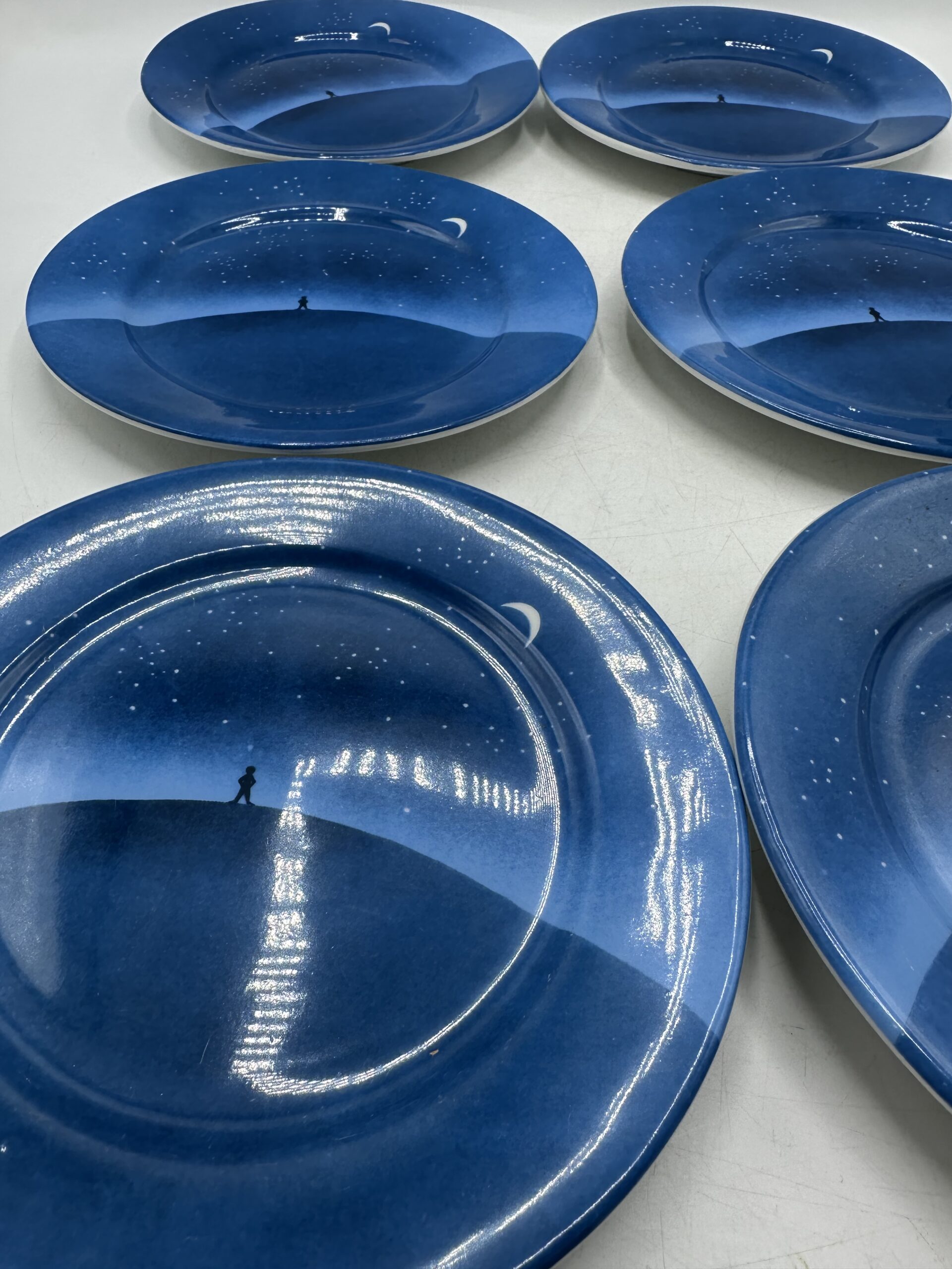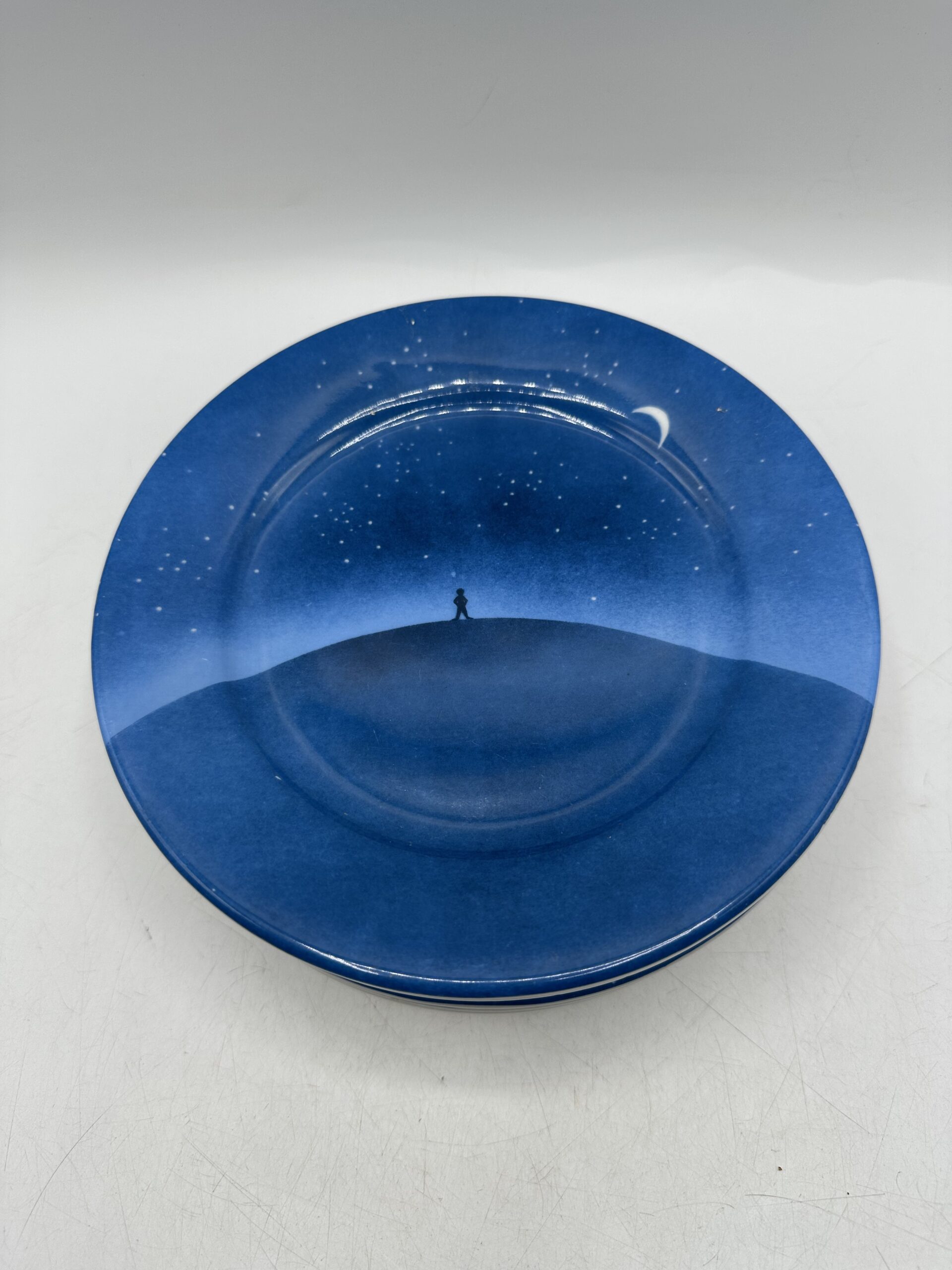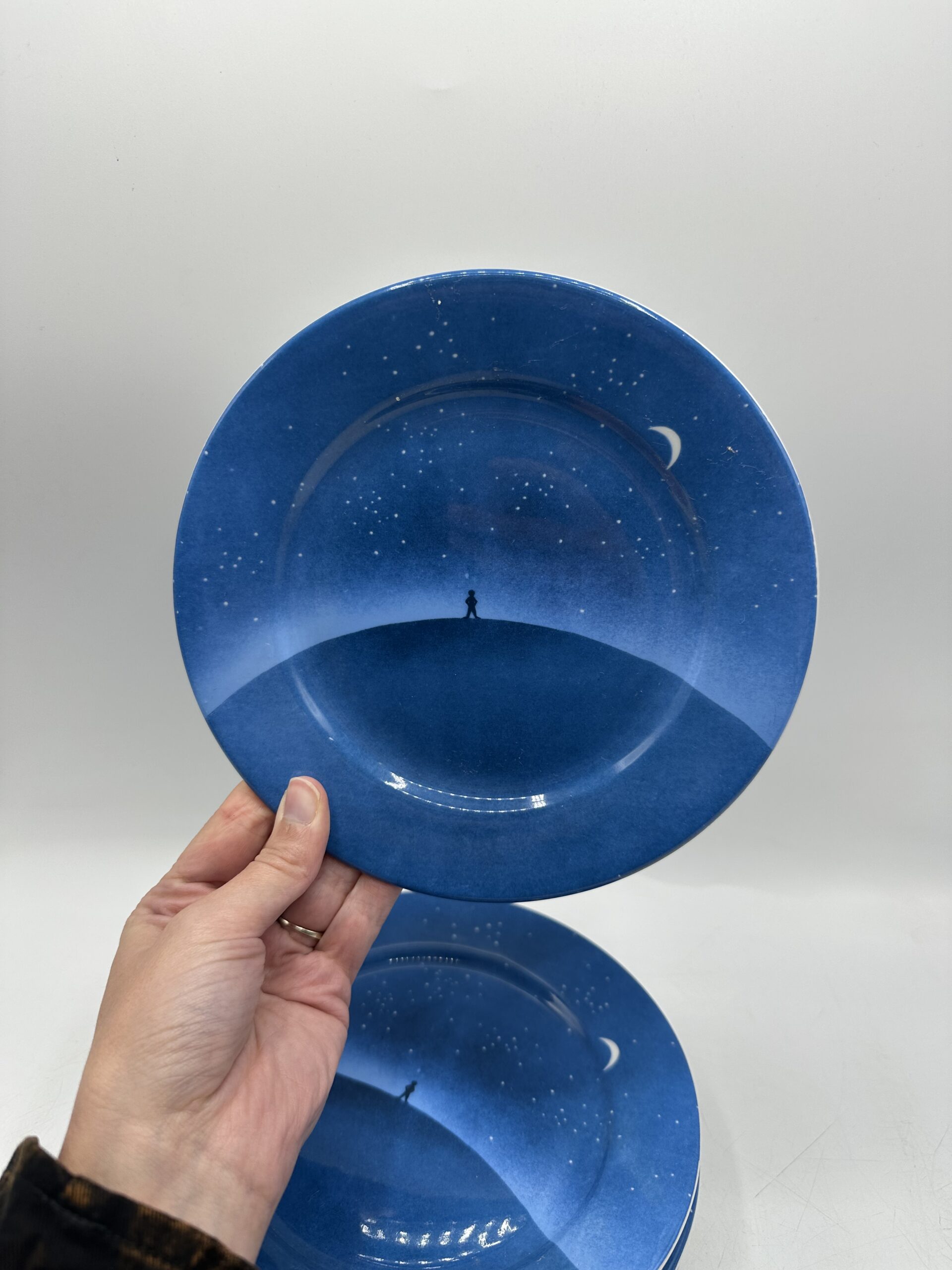 Ces assiettes en porcelaine ont un décor rare. Un décor aux allures du Petit Prince, les assiettes sont bleu nuit, avec des points blancs en guise d’étoiles, un croissant de lune et un petit personnage noir.