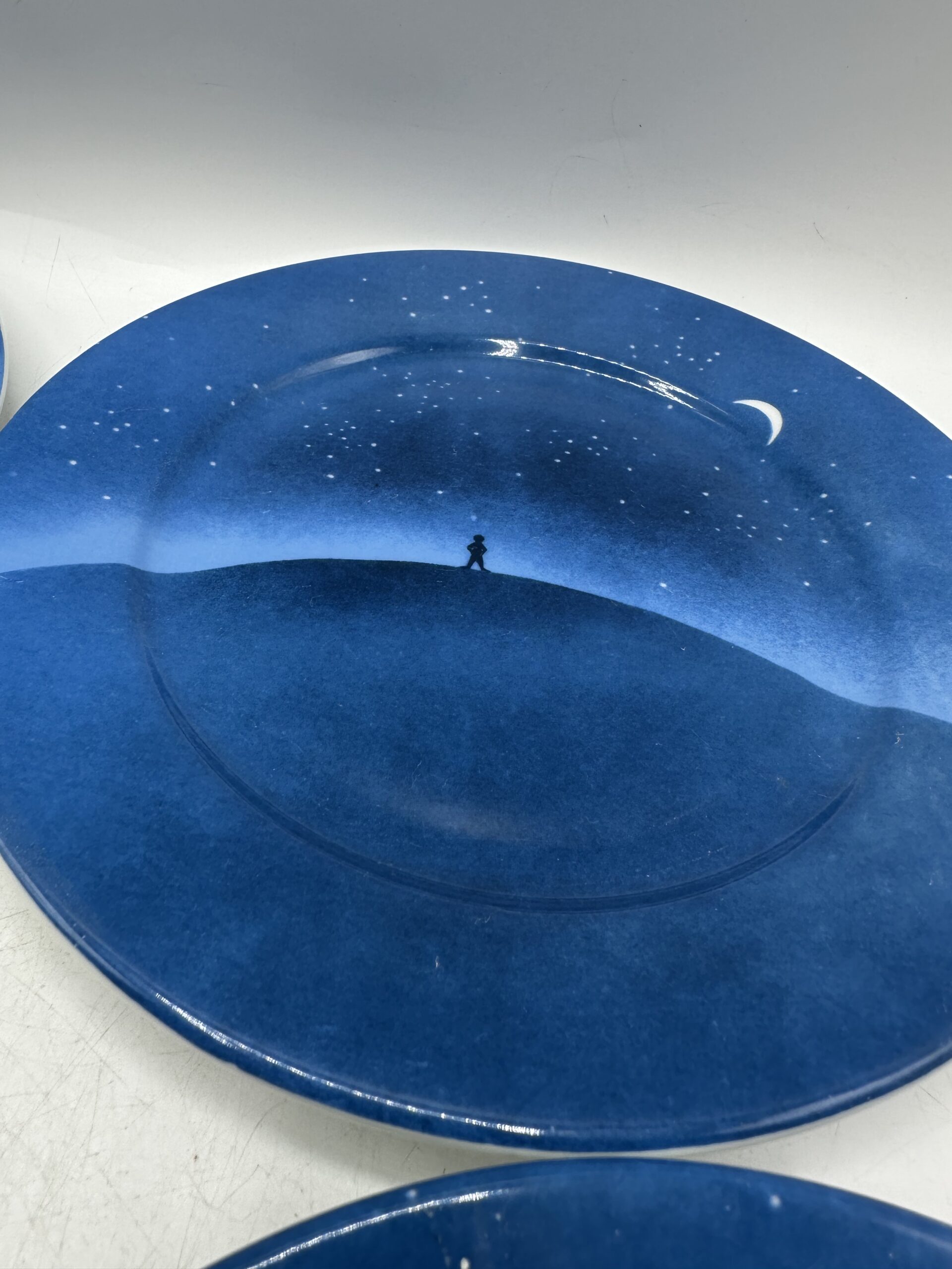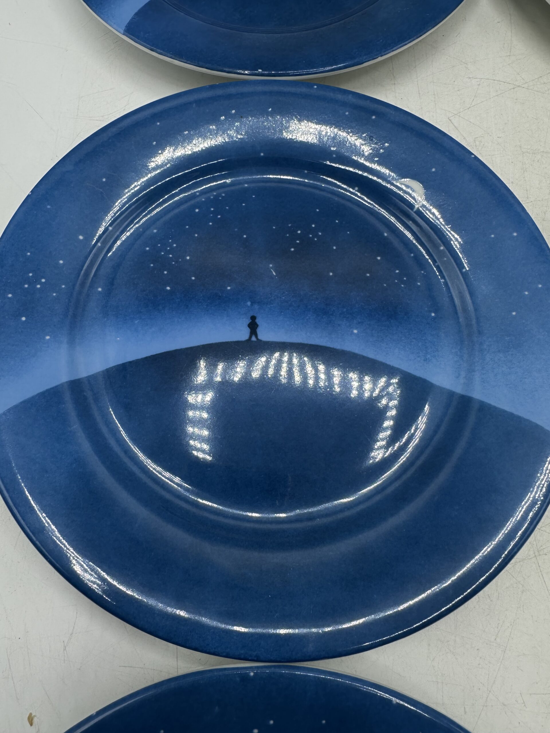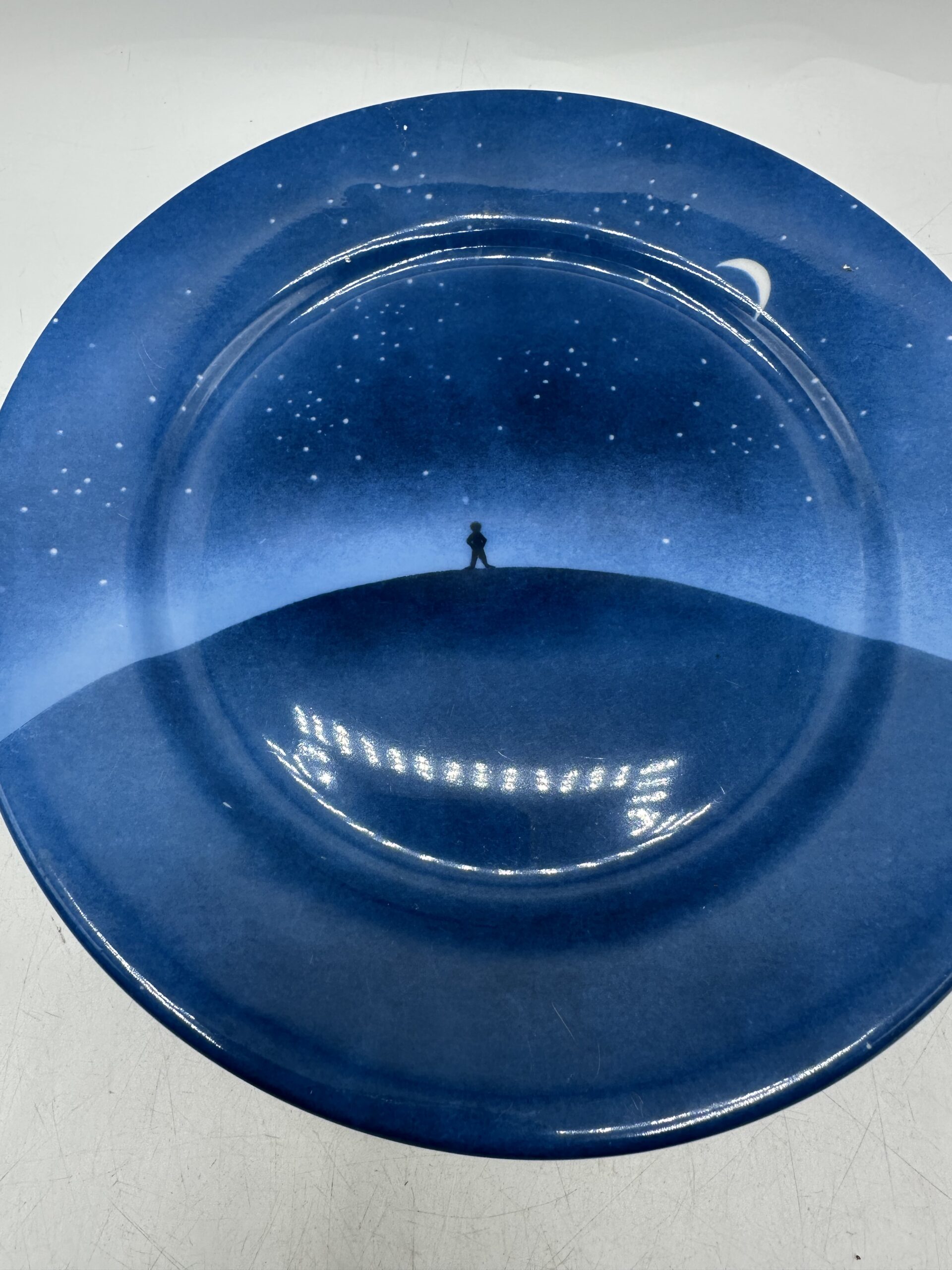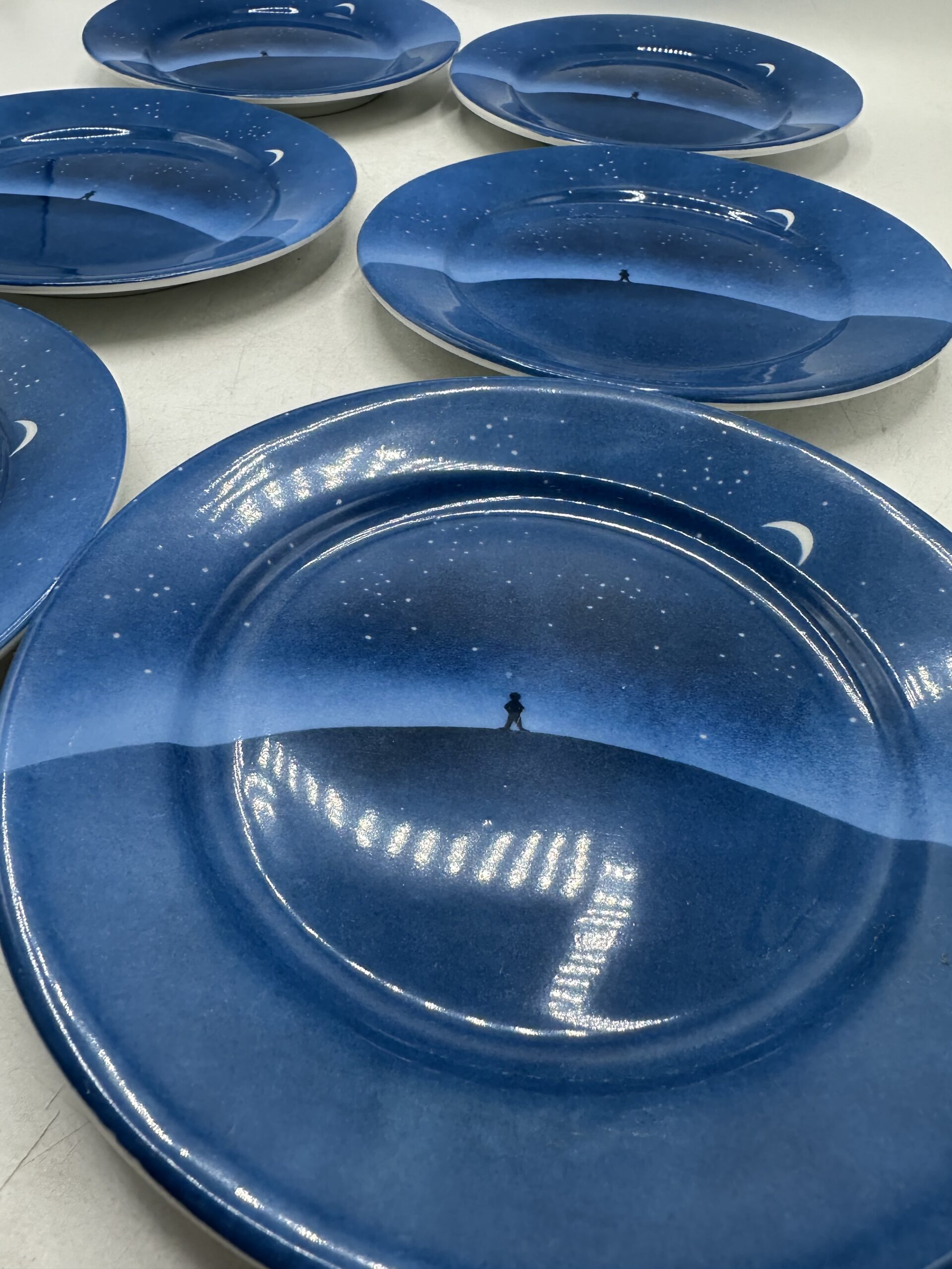 Ces assiettes en porcelaine ont un décor rare. Un décor aux allures du Petit Prince, les assiettes sont bleu nuit, avec des points blancs en guise d’étoiles, un croissant de lune et un petit personnage noir.