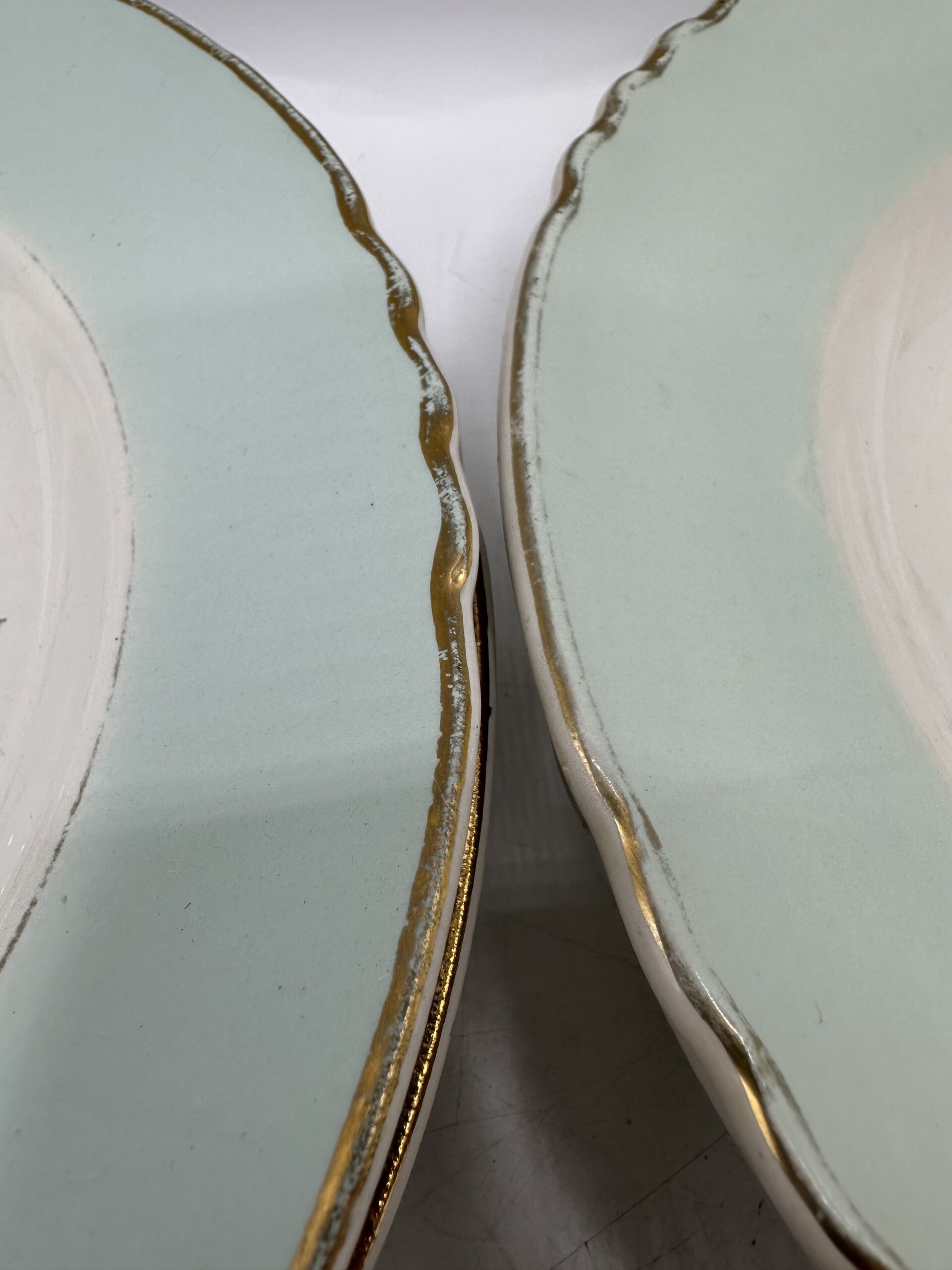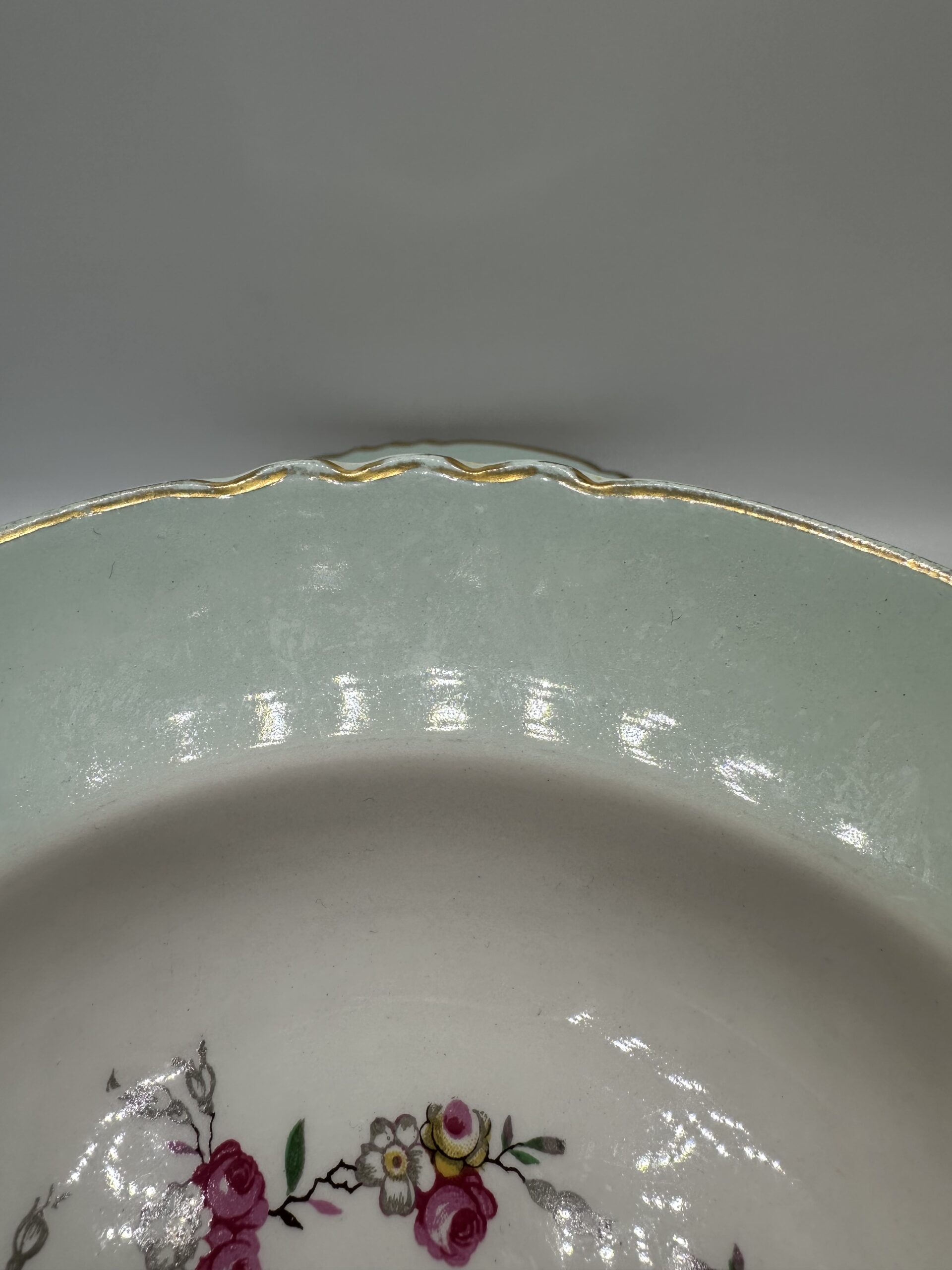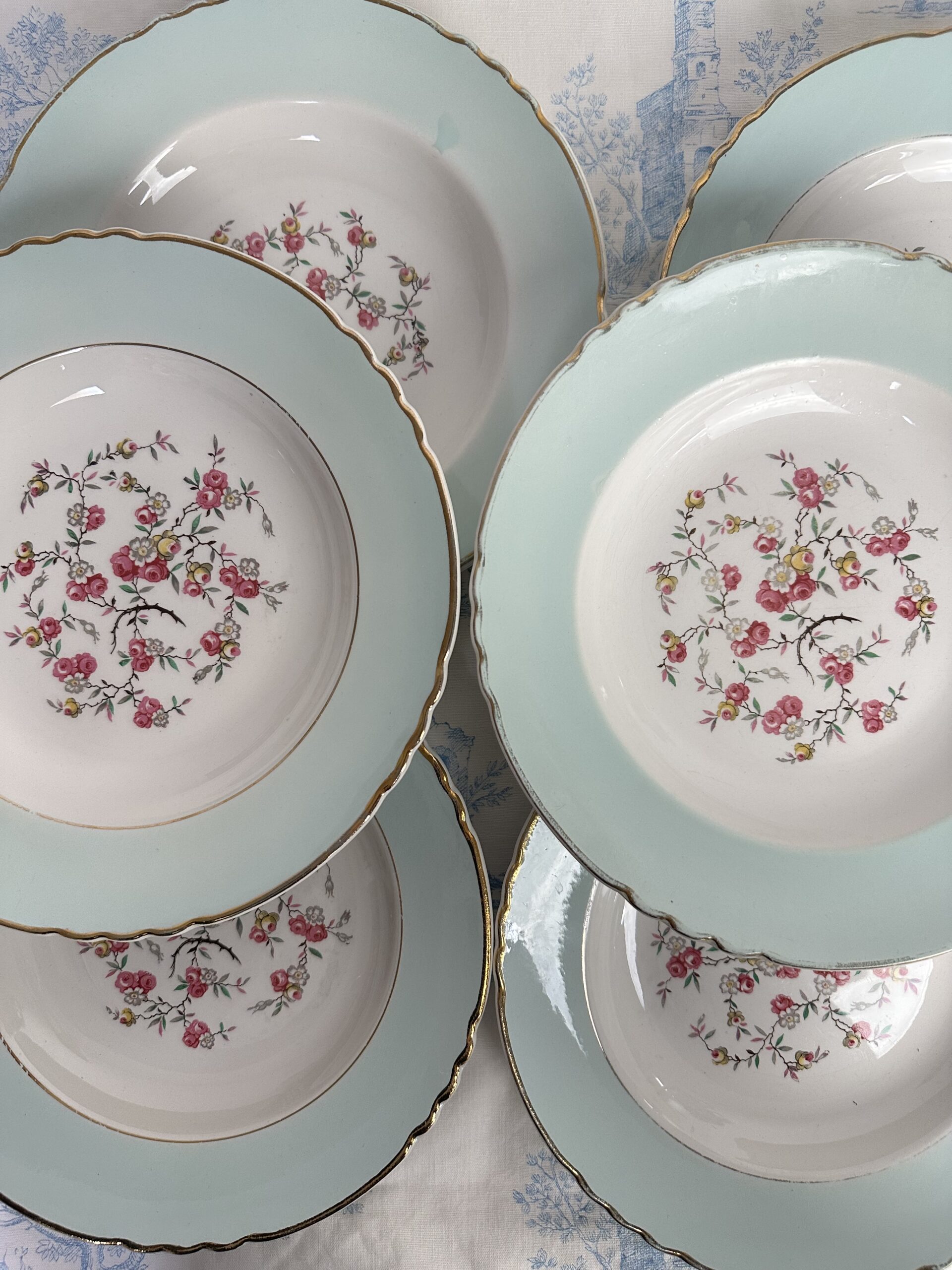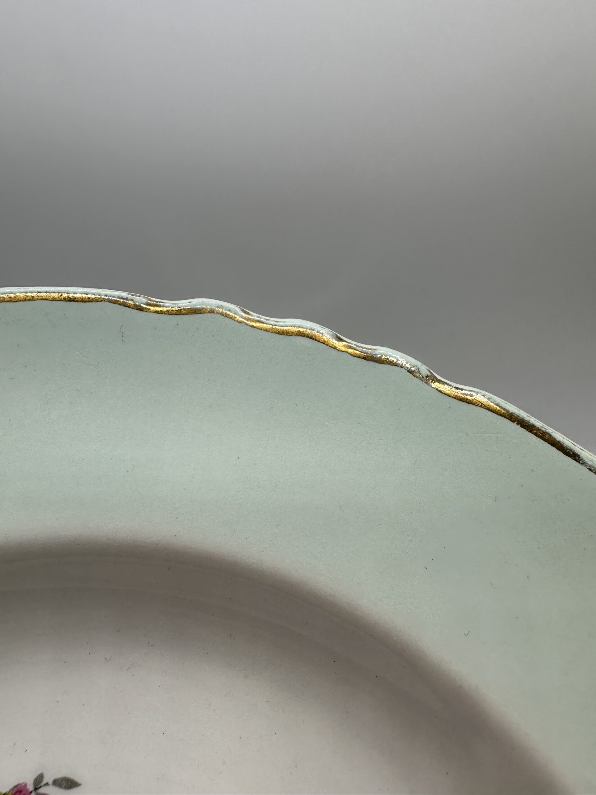 Ces assiettes creuses sont à la fois douces et romantiques. Elles présentent une large bande vert pastel, un motif fleuri au centre et deux liserés dorés qui encadrent avec élégance le décor. Elles sont en bon état général, avec quelques légères usures sur les liserés dorés à signaler (bien regarder les photos).