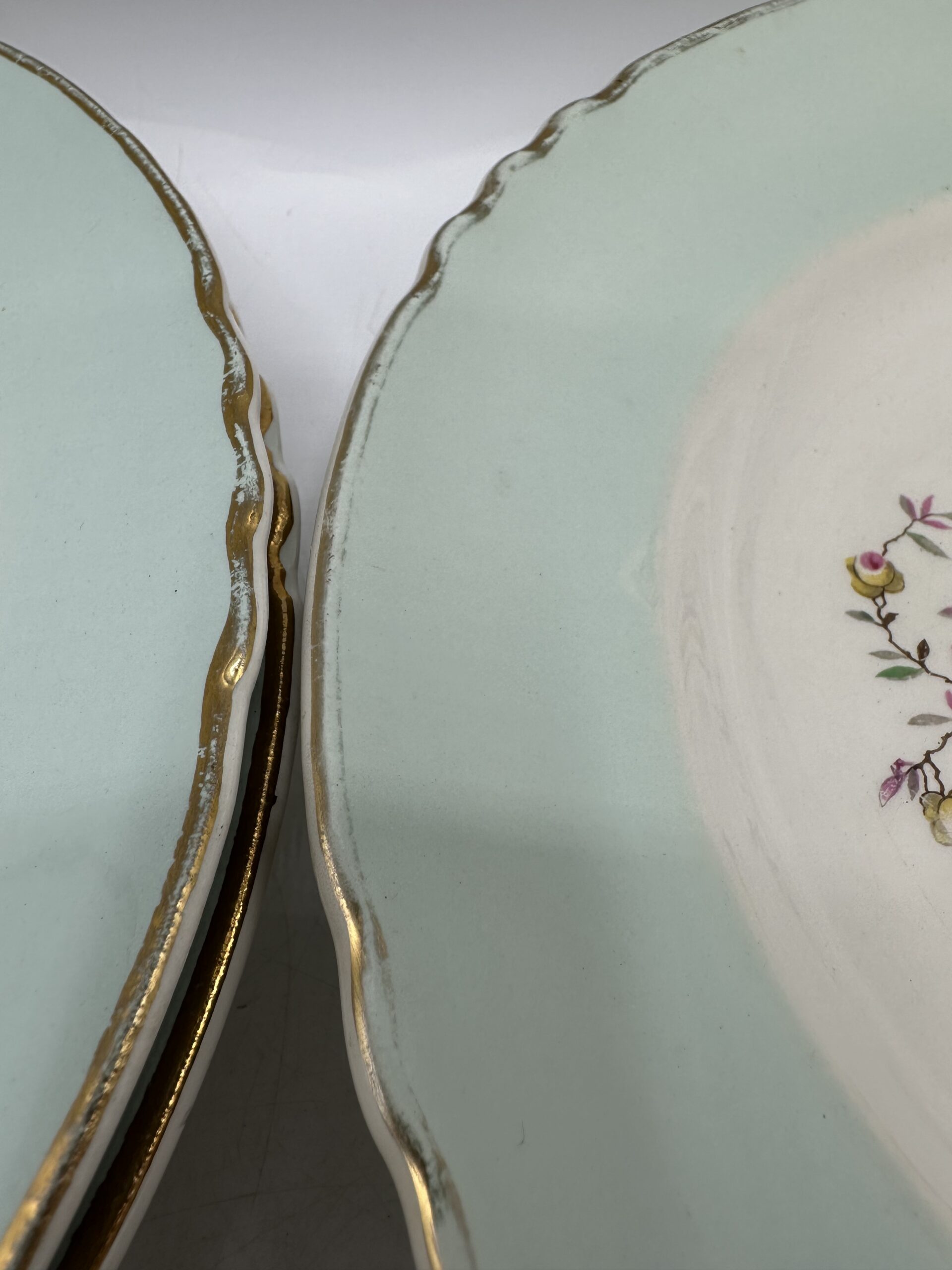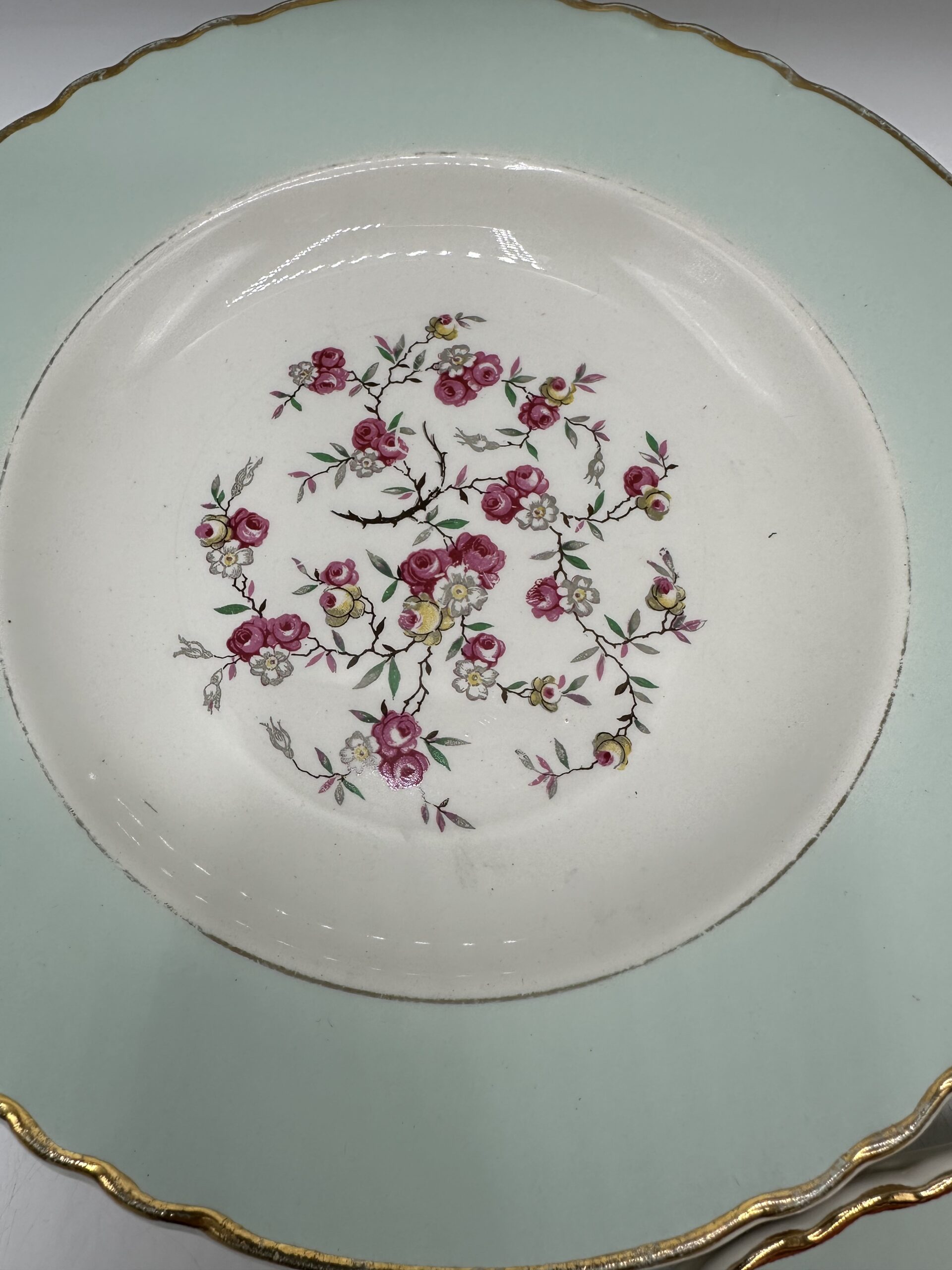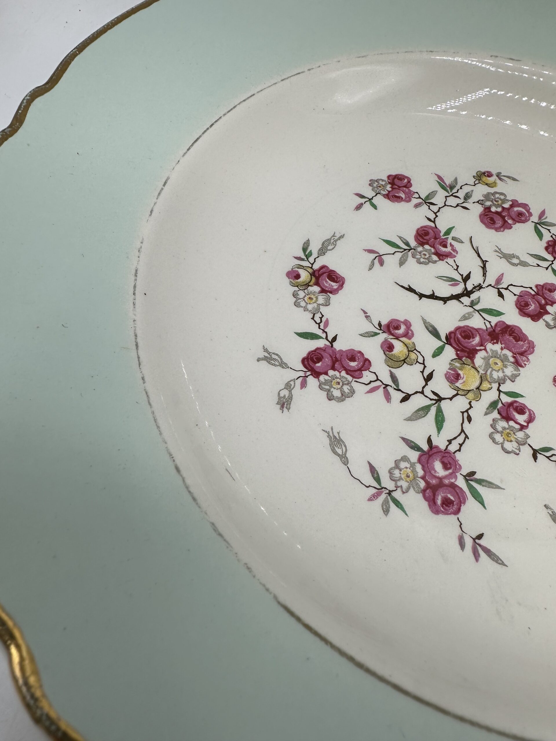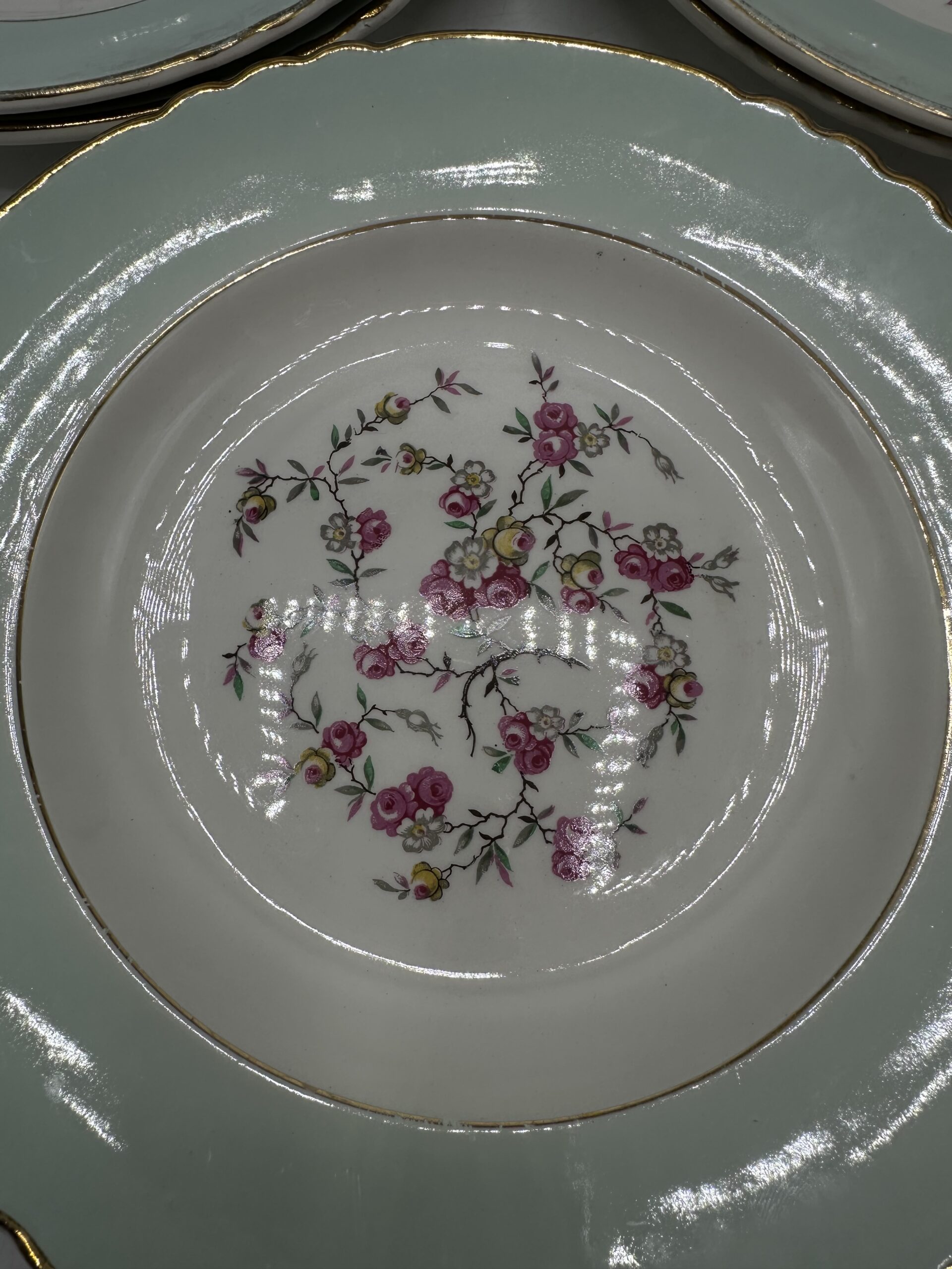 Ces assiettes creuses sont à la fois douces et romantiques. Elles présentent une large bande vert pastel, un motif fleuri au centre et deux liserés dorés qui encadrent avec élégance le décor. Elles sont en bon état général, avec quelques légères usures sur les liserés dorés à signaler (bien regarder les photos).