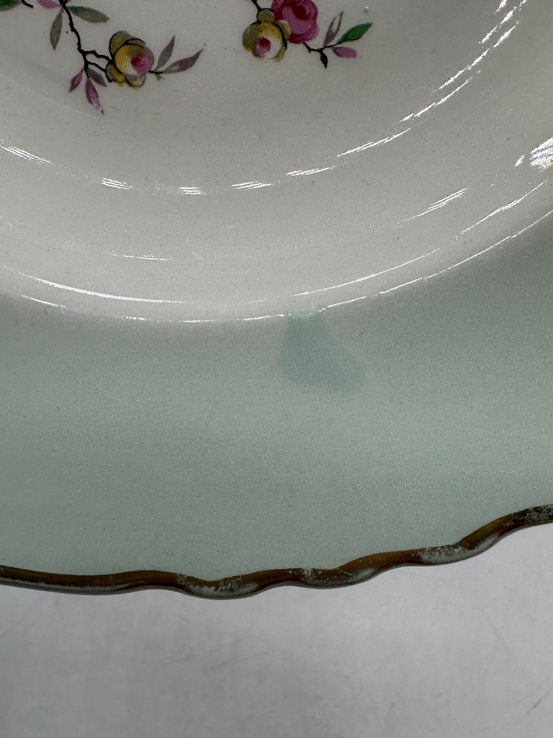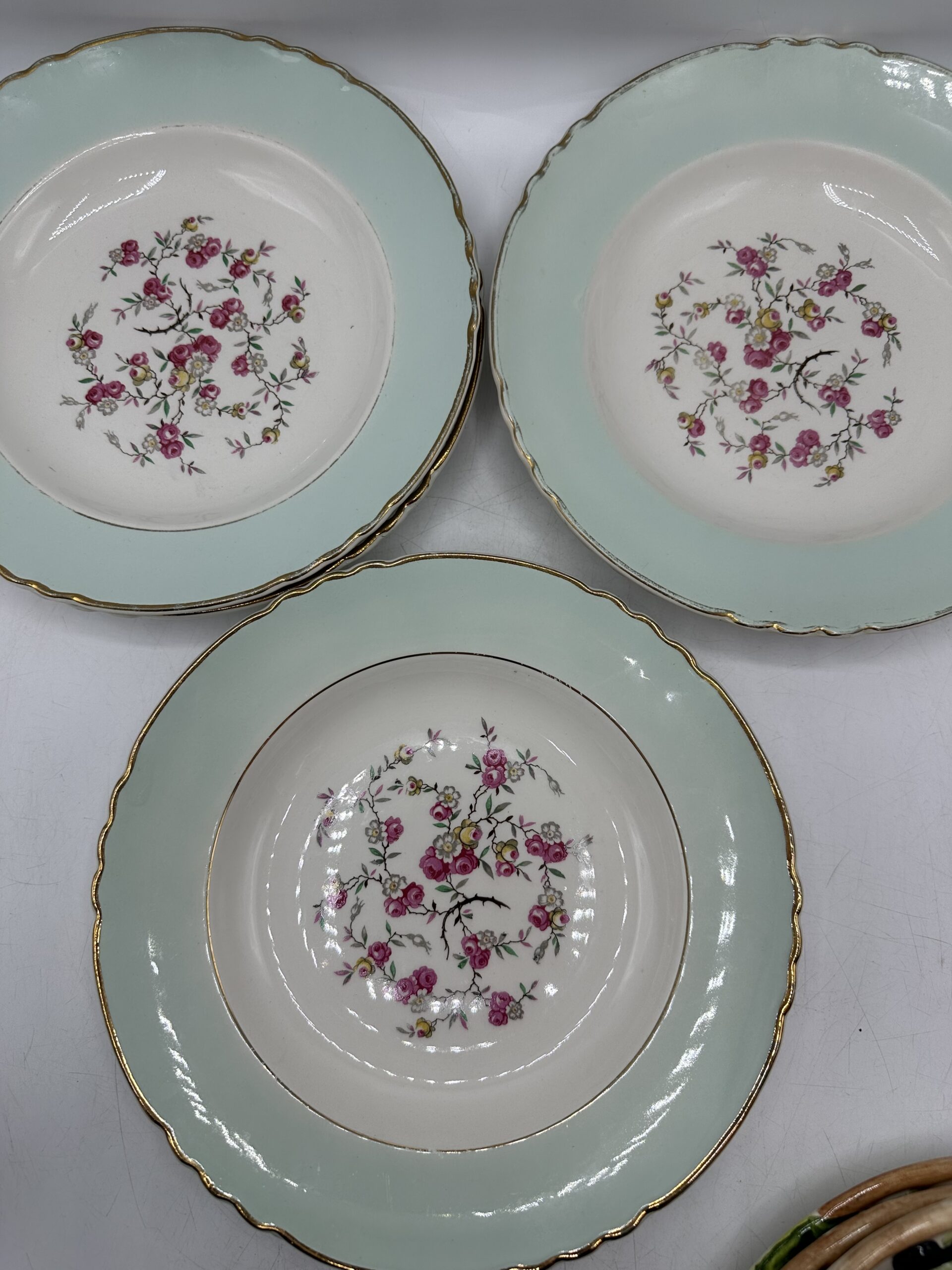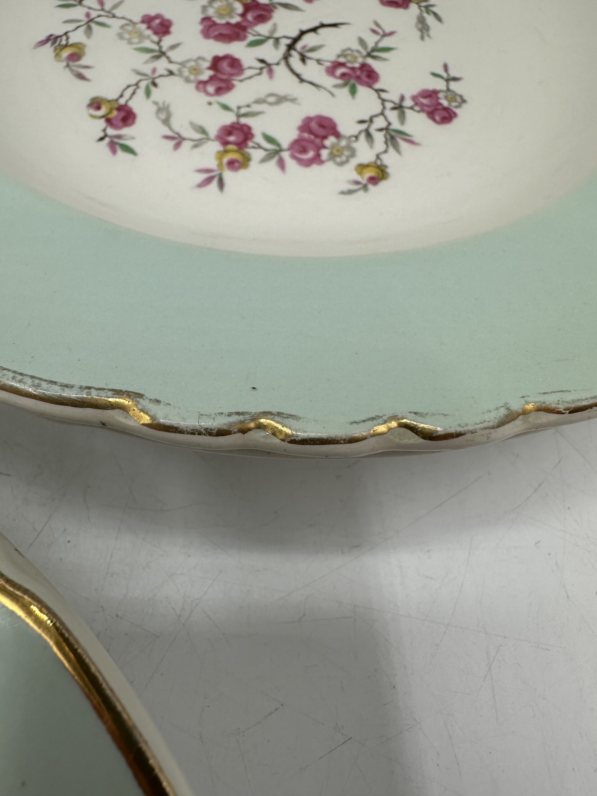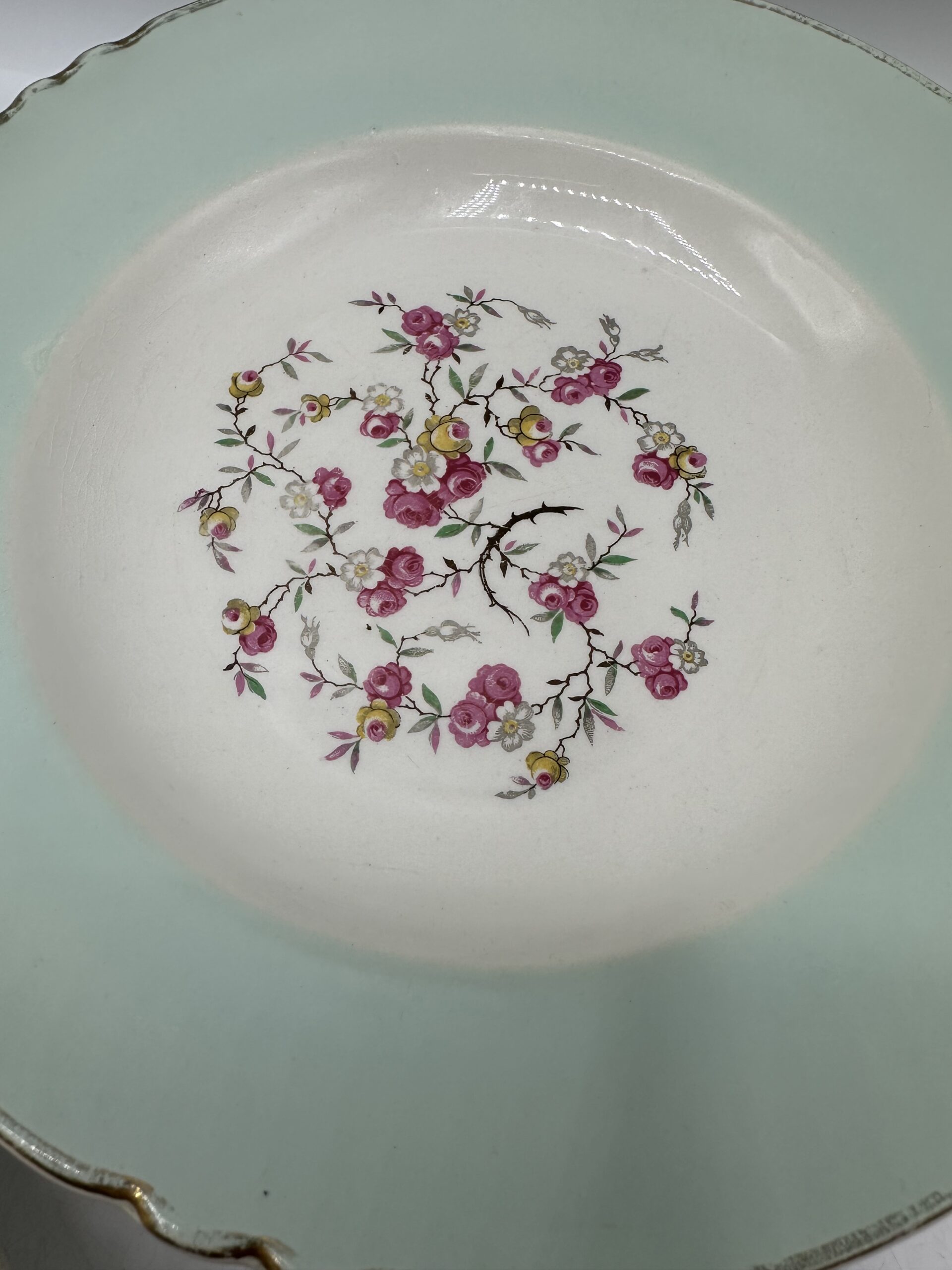 Ces assiettes creuses sont à la fois douces et romantiques. Elles présentent une large bande vert pastel, un motif fleuri au centre et deux liserés dorés qui encadrent avec élégance le décor. Elles sont en bon état général, avec quelques légères usures sur les liserés dorés à signaler (bien regarder les photos).