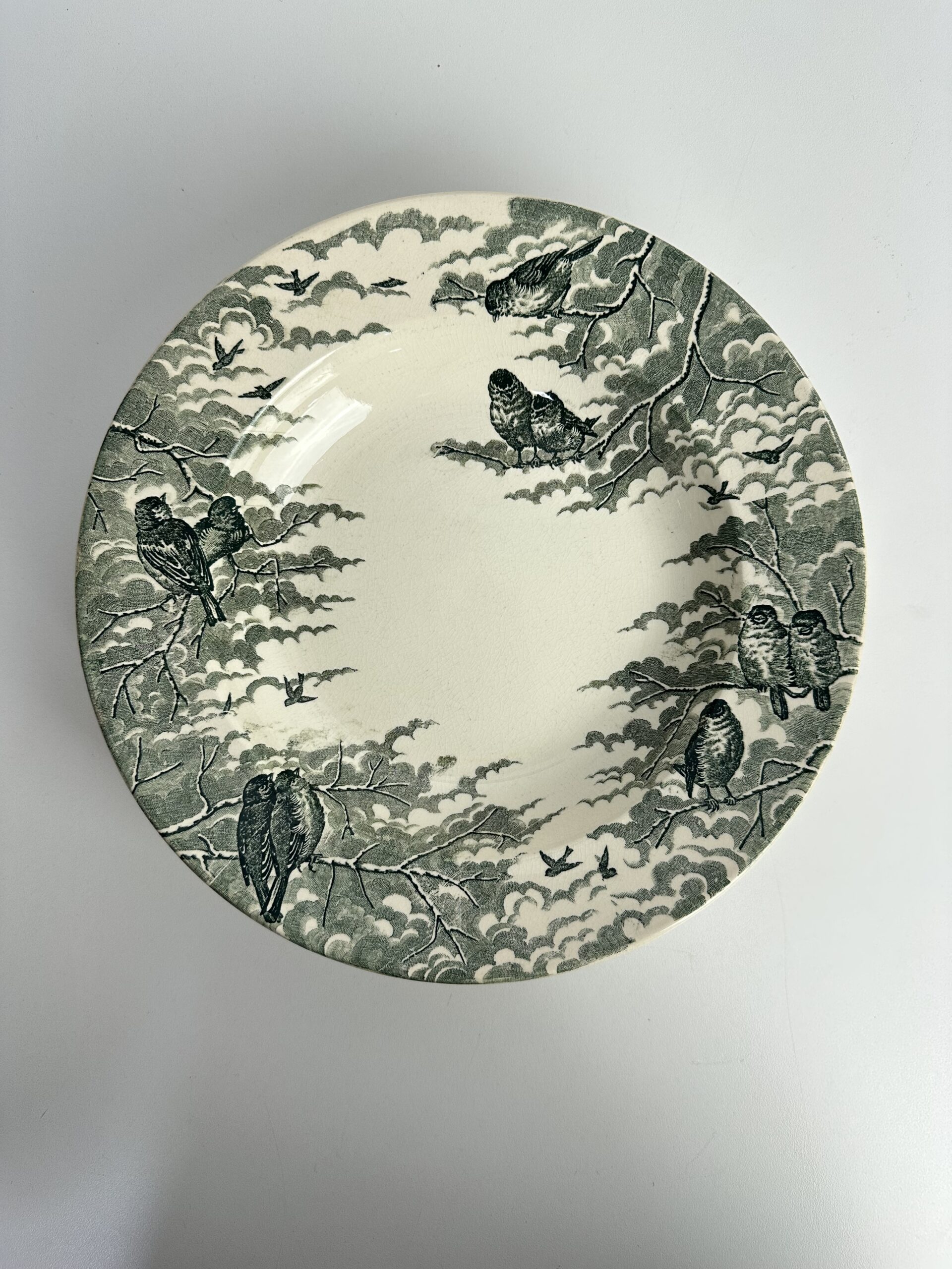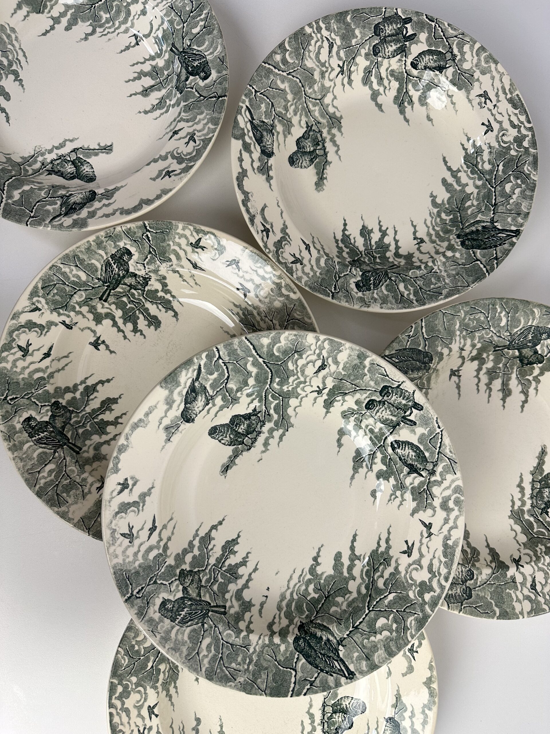Alerte grosse pépite pour les chineurs de vaisselle ancienne ! Voici un lot de 6 assiettes creuses Sarreguemines Neige U&C.