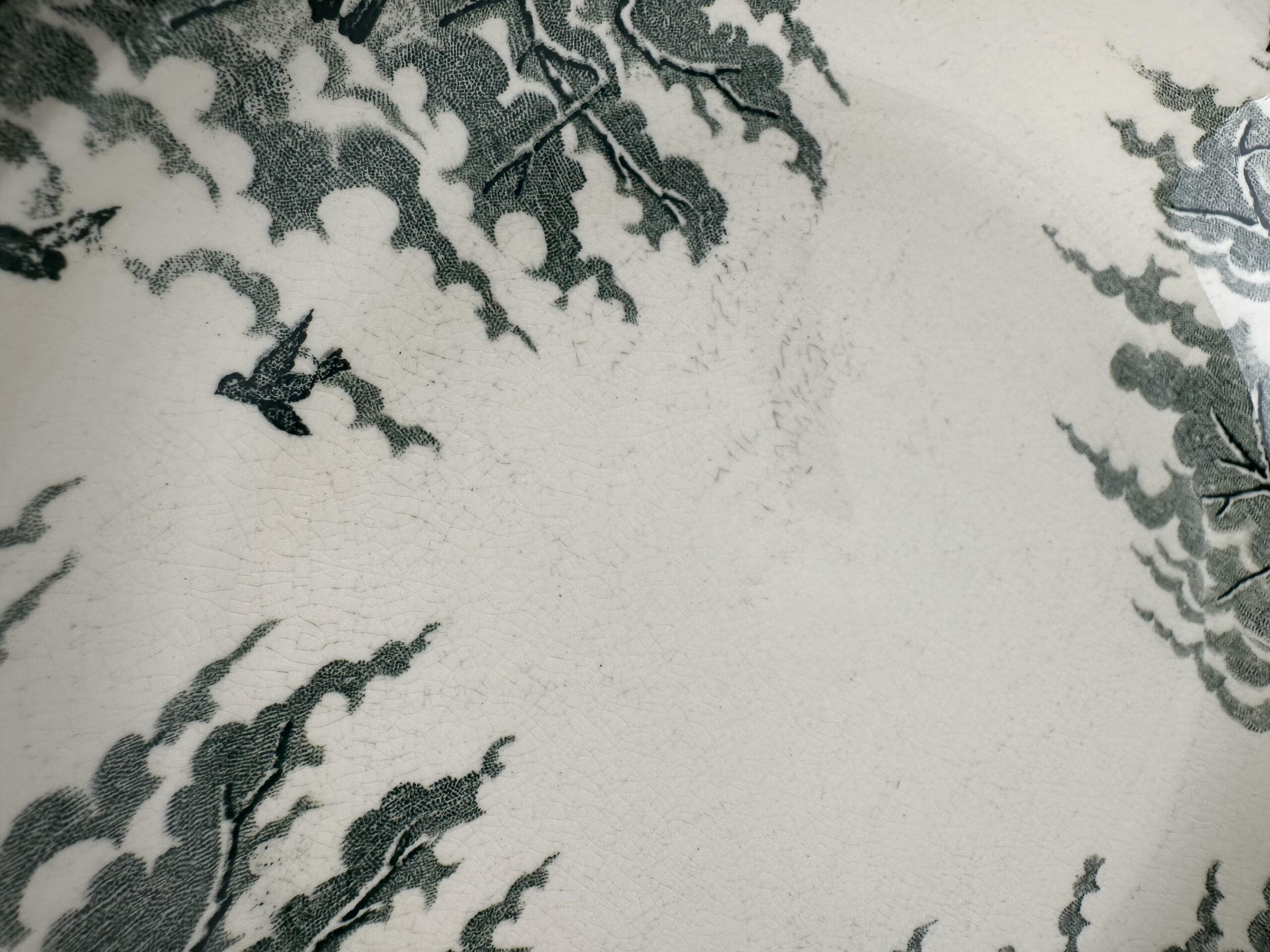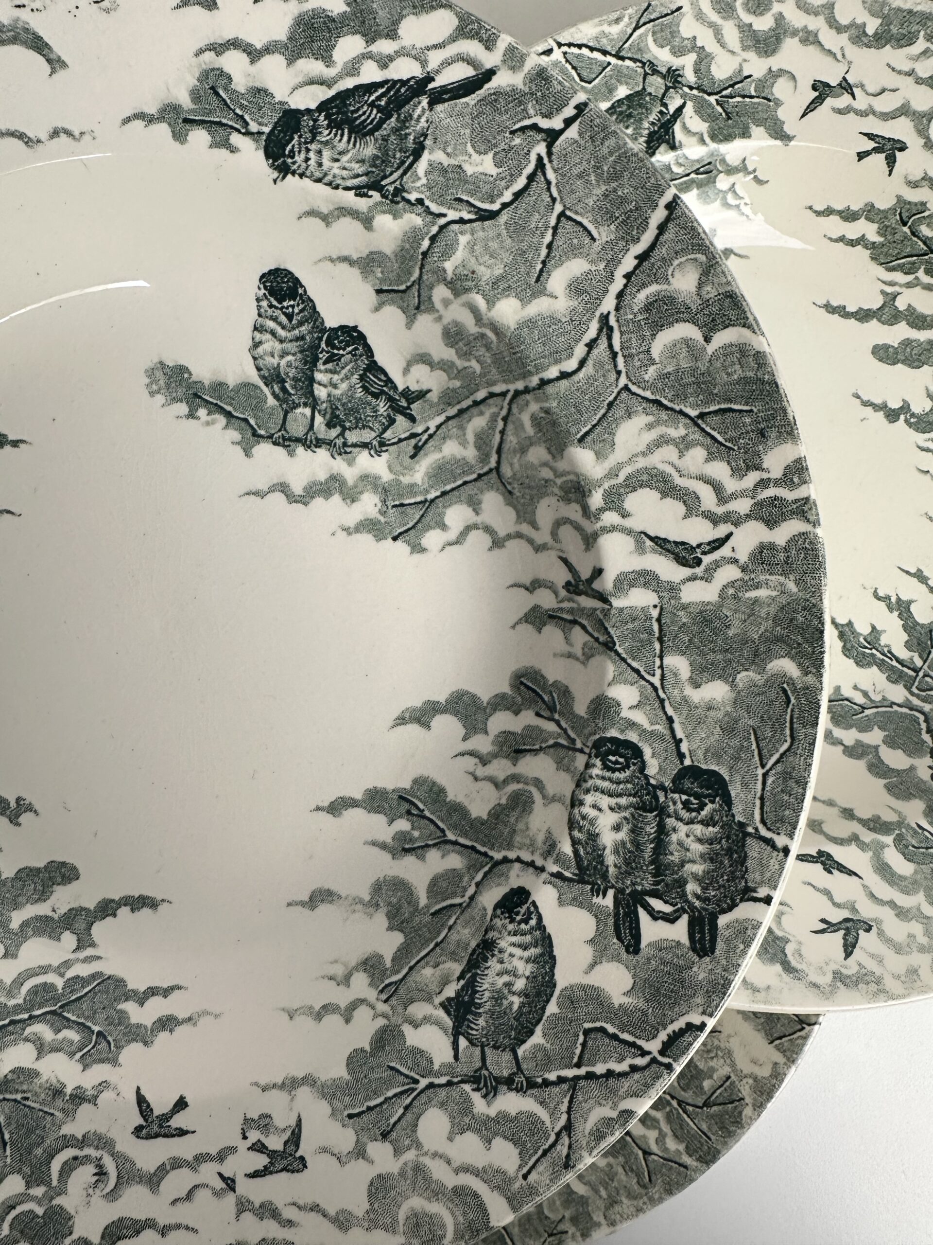 Sur un fond blanc cassé, on y voit un paysage calme et paisible, avec des oiseaux posés sur des branchages. Les motifs d’oiseaux et de branches sont dans un très coloris vert avec des nuances plus claires et plus foncés.