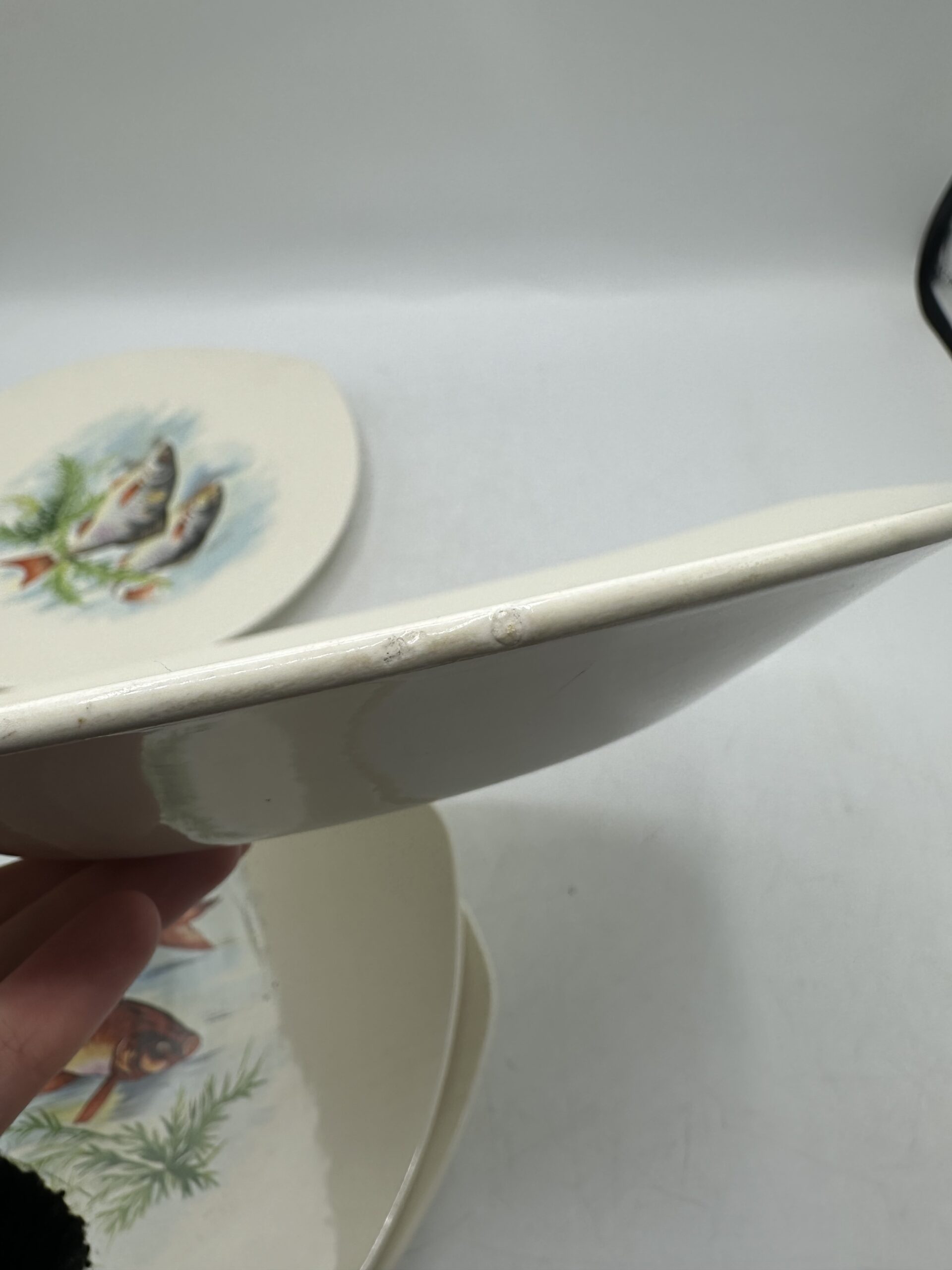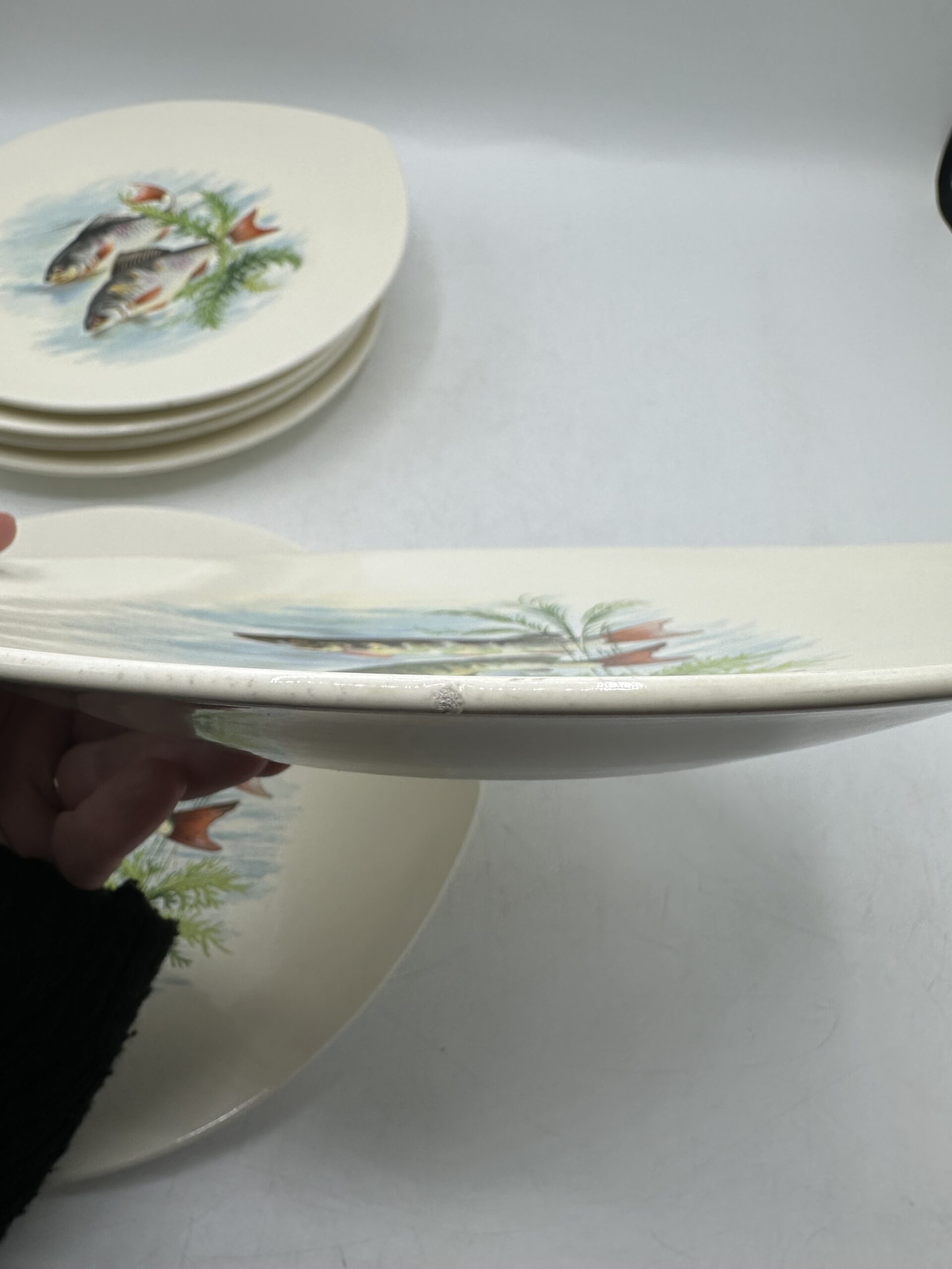Les assiettes laissent apparaitre un motif de poissons au centre. Il y a 3 dessins différents sur 6 assiettes au total. Elles ont aussi une forme originale et peu commune.
