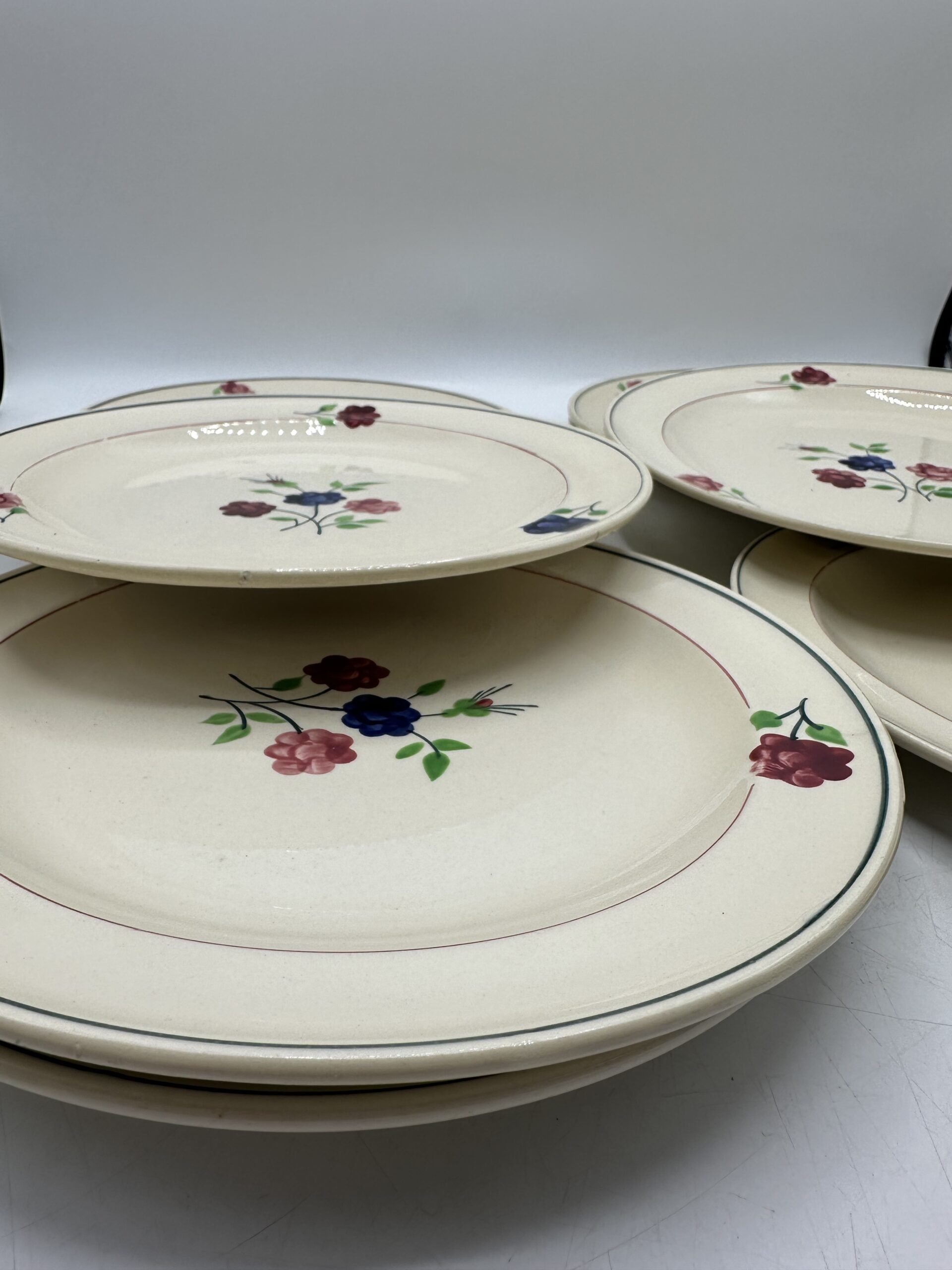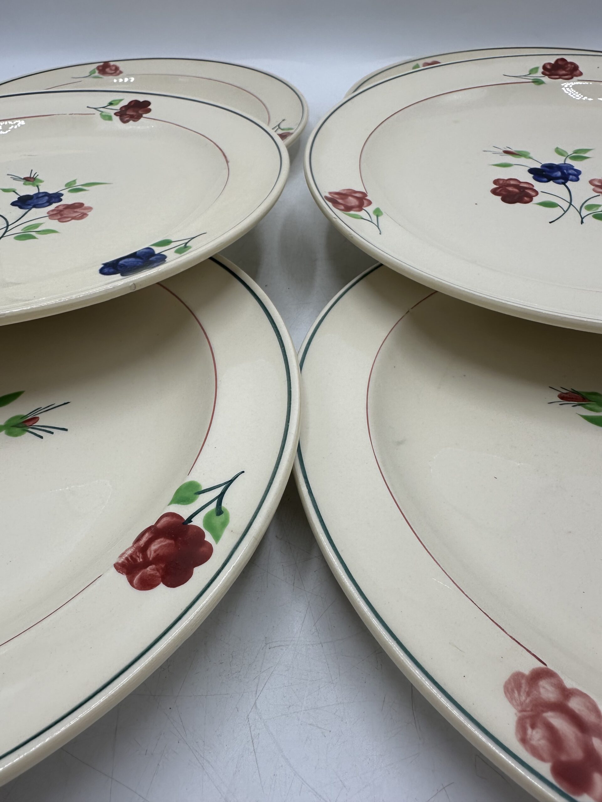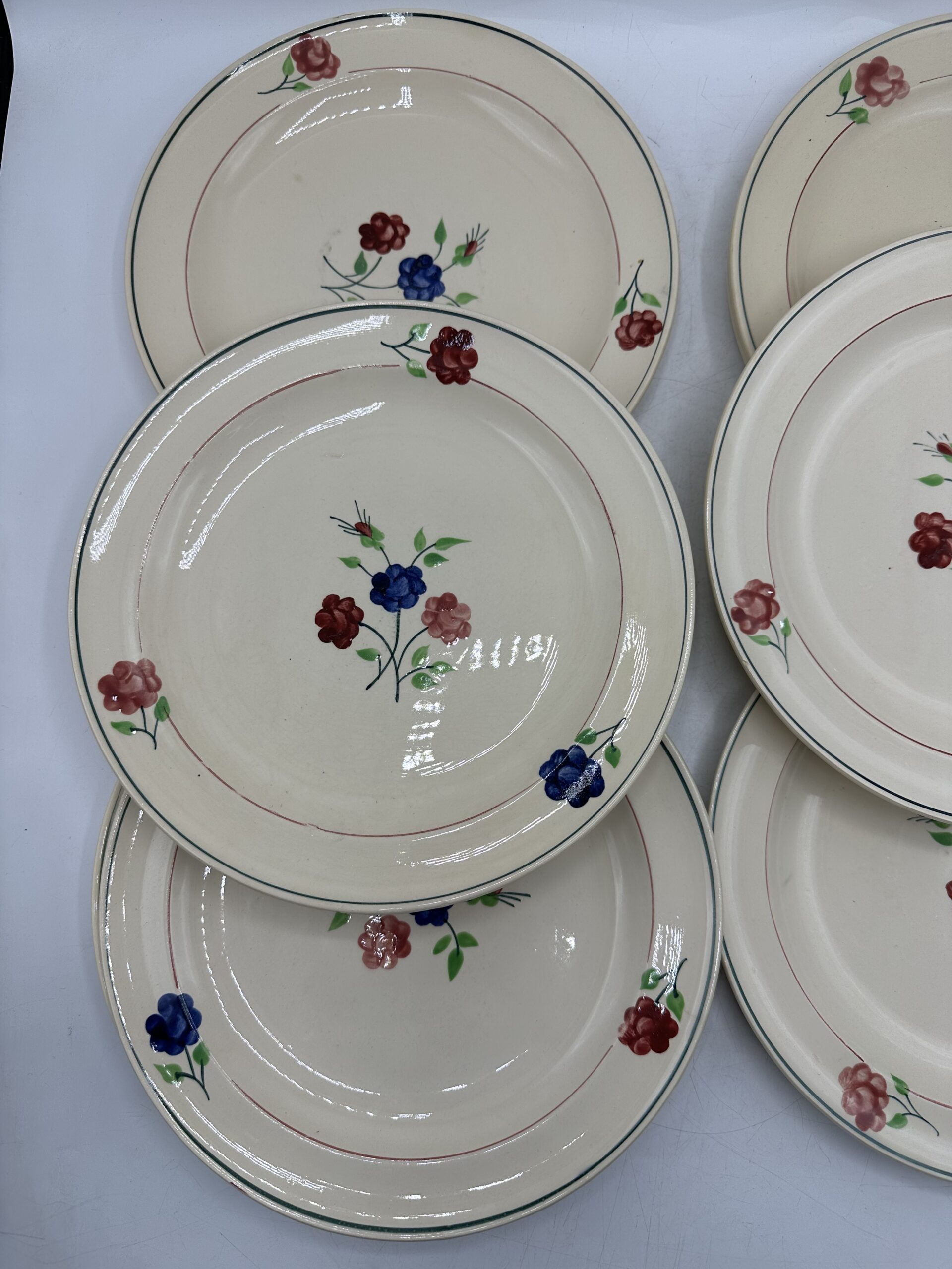 Les assiettes, sur un fond beige, laissent apparaitre au centre un petit bouquet de 3 fleurs, et ces trois même fleurs sont réparties sur le pourtour. Les assiettes sont en bon état général. Deux d’entre elles ont une légère patine. Et des petites marques d’usures normales sont à prévoir. Il n’y a pas de casse ou de fissures !