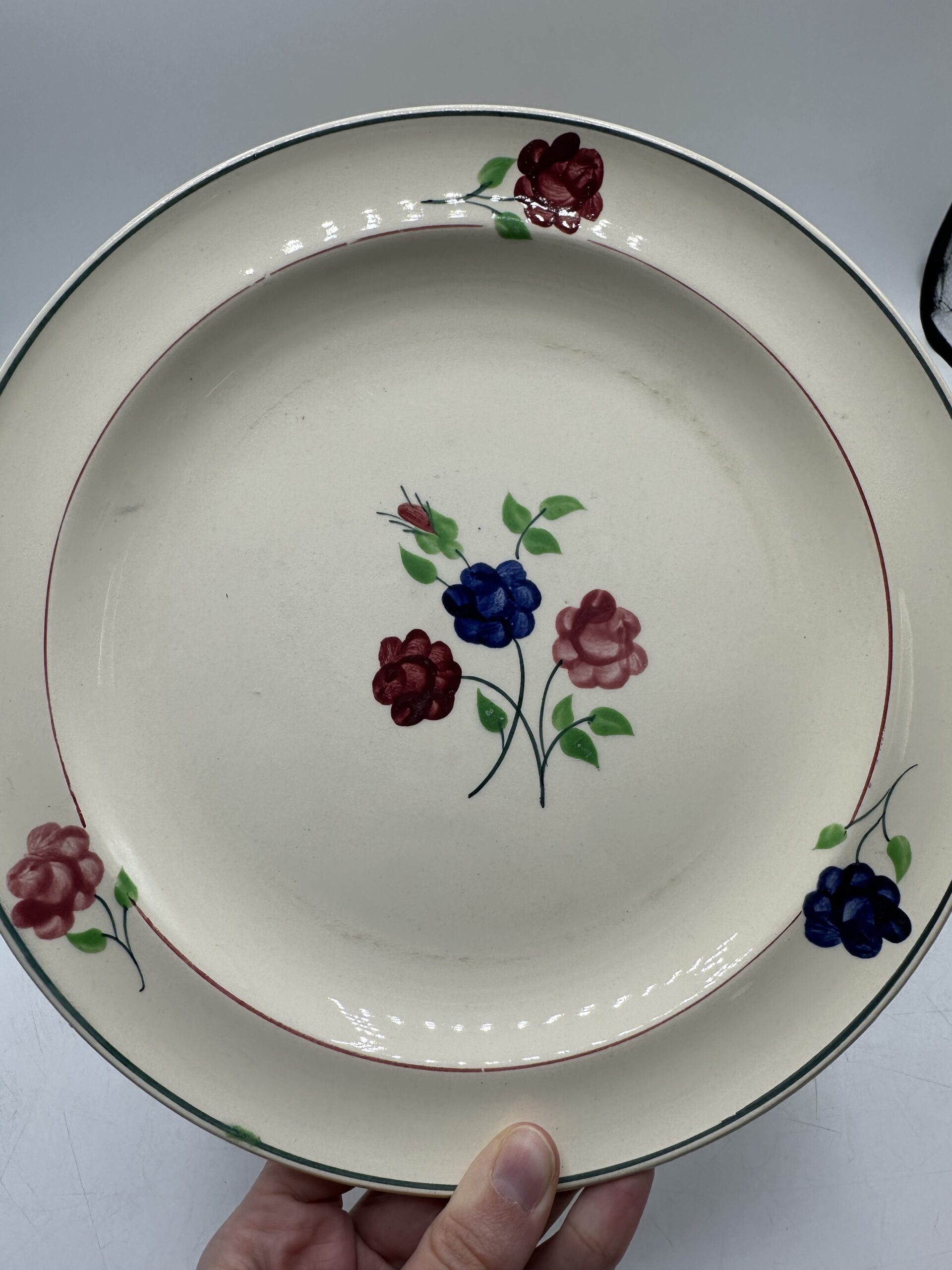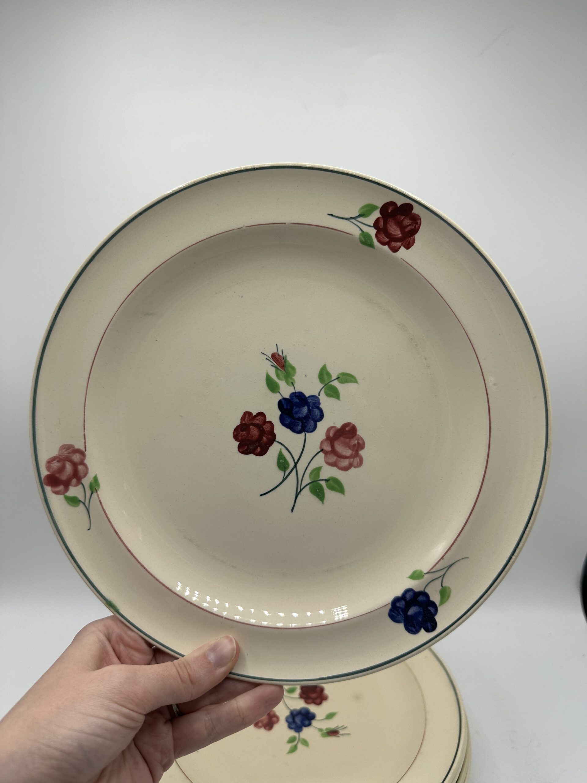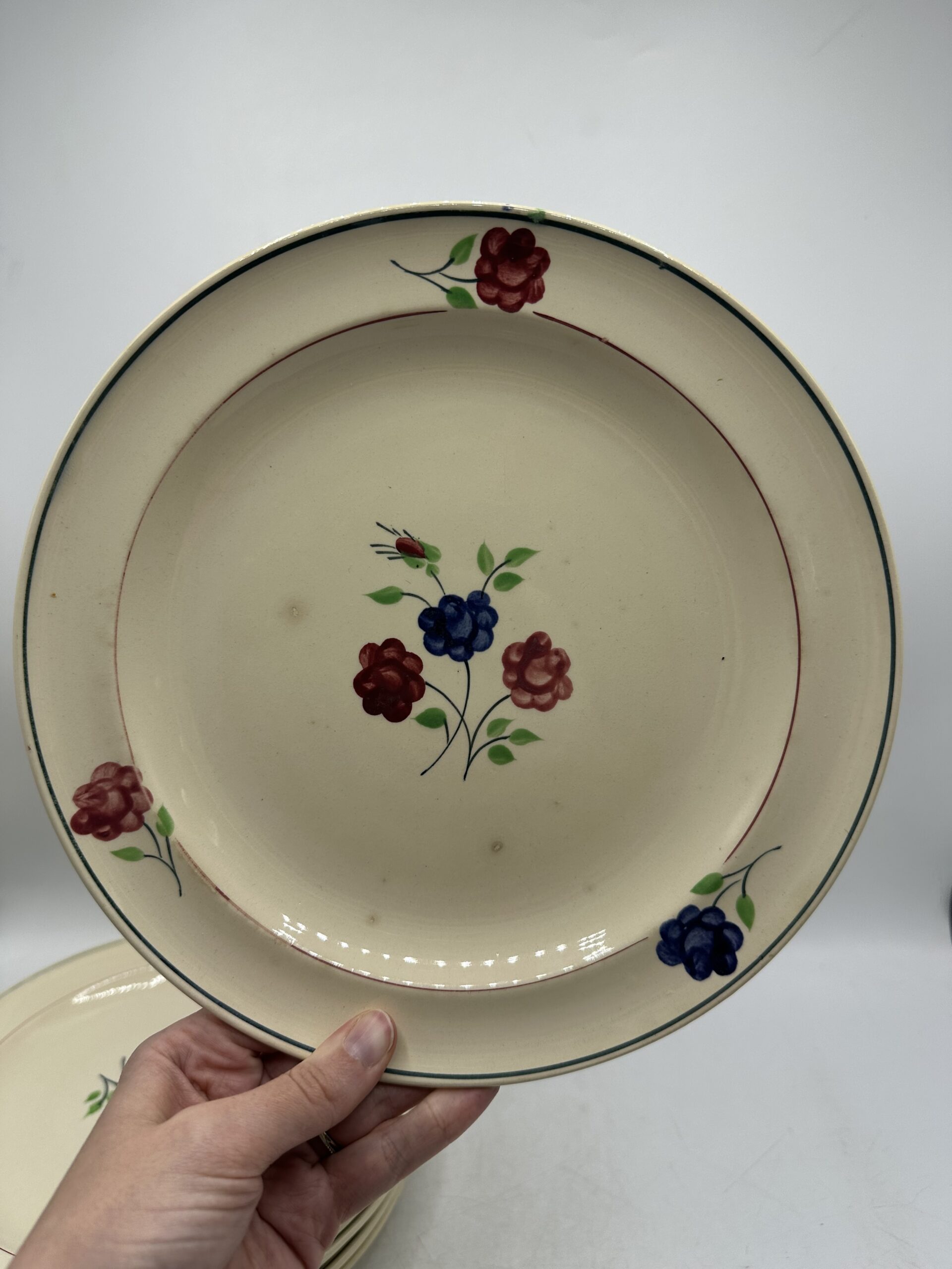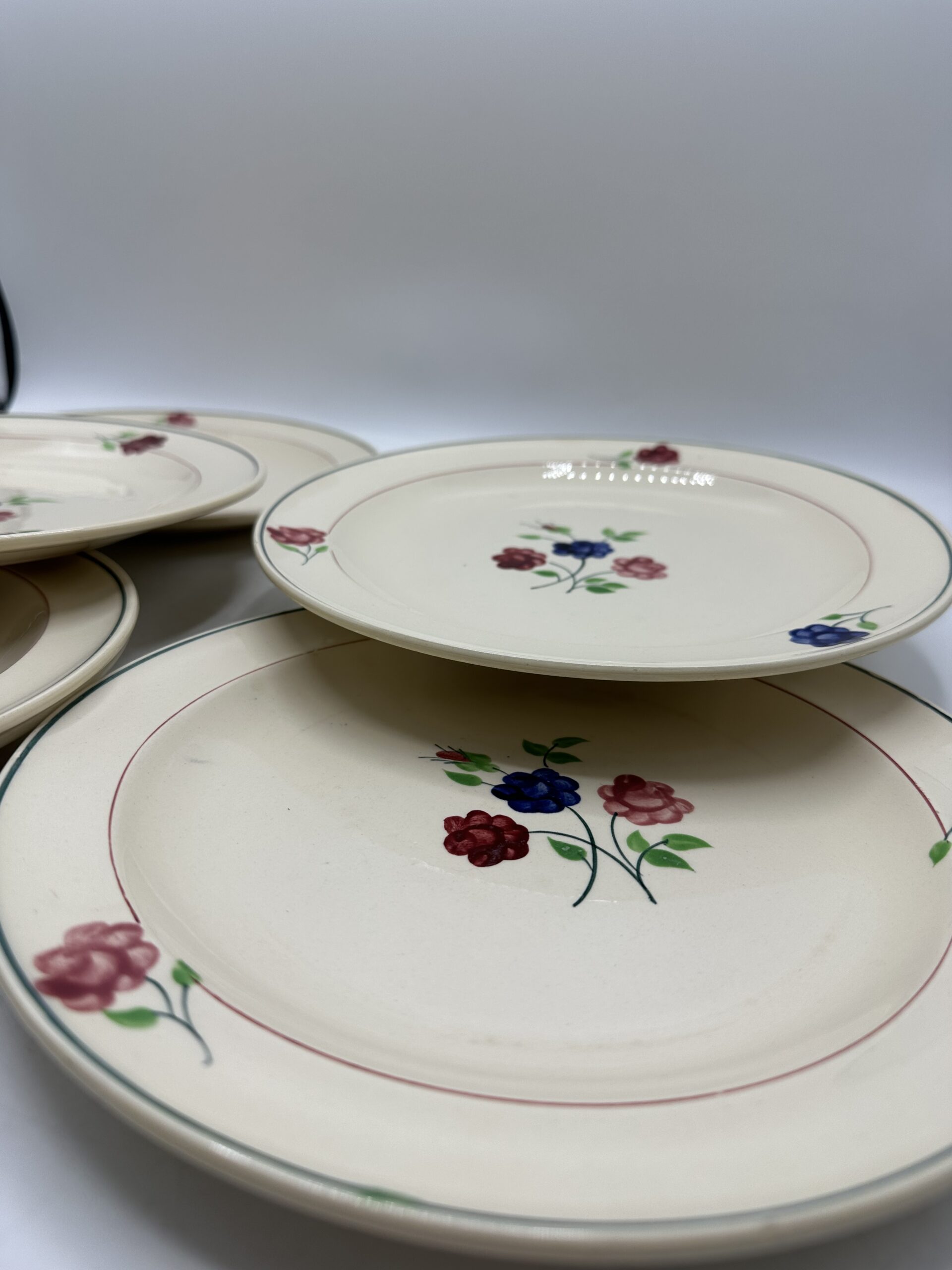 Les assiettes, sur un fond beige, laissent apparaitre au centre un petit bouquet de 3 fleurs, et ces trois même fleurs sont réparties sur le pourtour. Les assiettes sont en bon état général. Deux d’entre elles ont une légère patine. Et des petites marques d’usures normales sont à prévoir. Il n’y a pas de casse ou de fissures !
