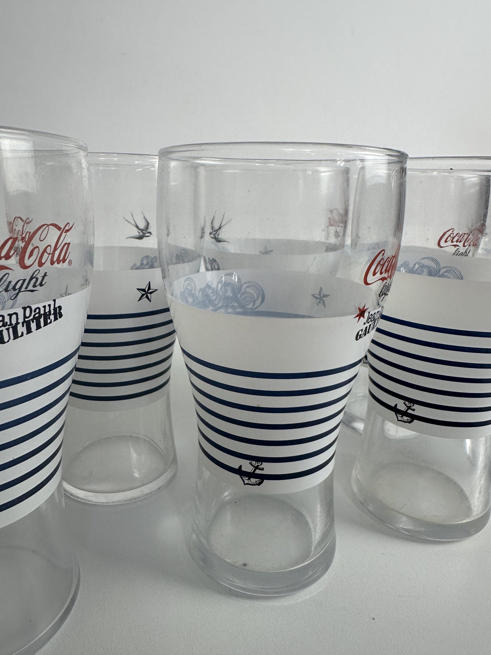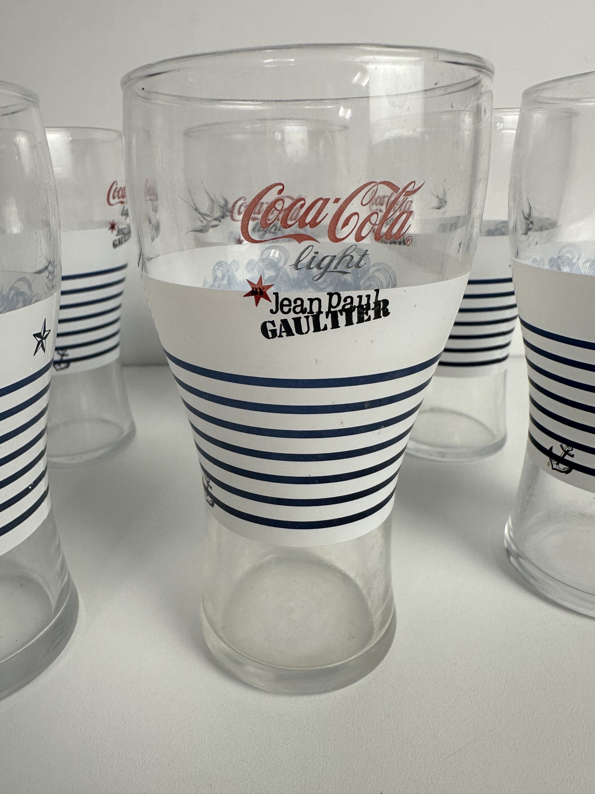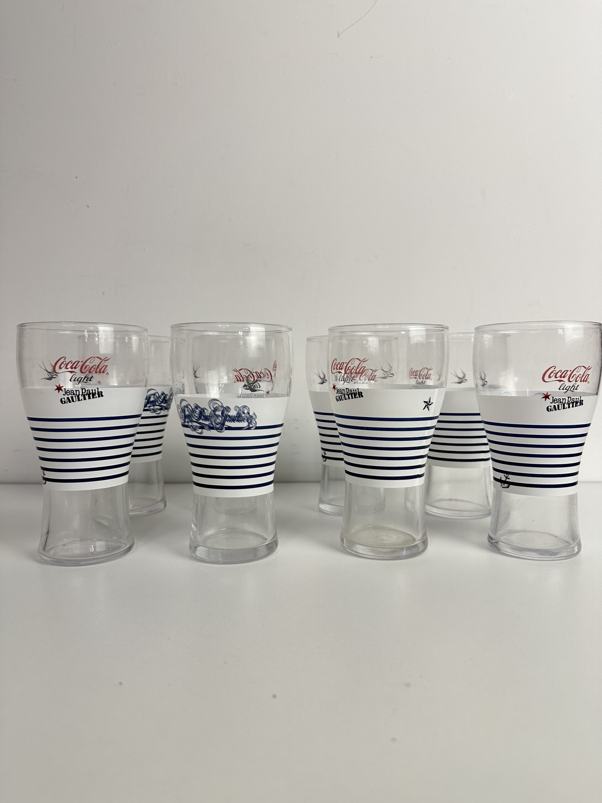 On reconnaît immédiatement la signature iconique de Jean-Paul Gaultier sur ces verres Coca-Cola de collection. La célèbre marinière blanche et bleue, avec des motifs emblématiques comme l’ancre, l’étoile et l’hirondelle. Un clin d’œil audacieux à l’univers du créateur, entre esprit marin et élégance couture.