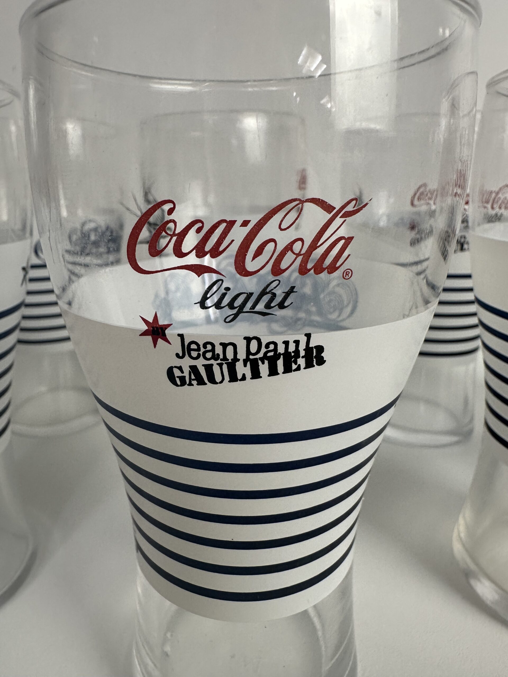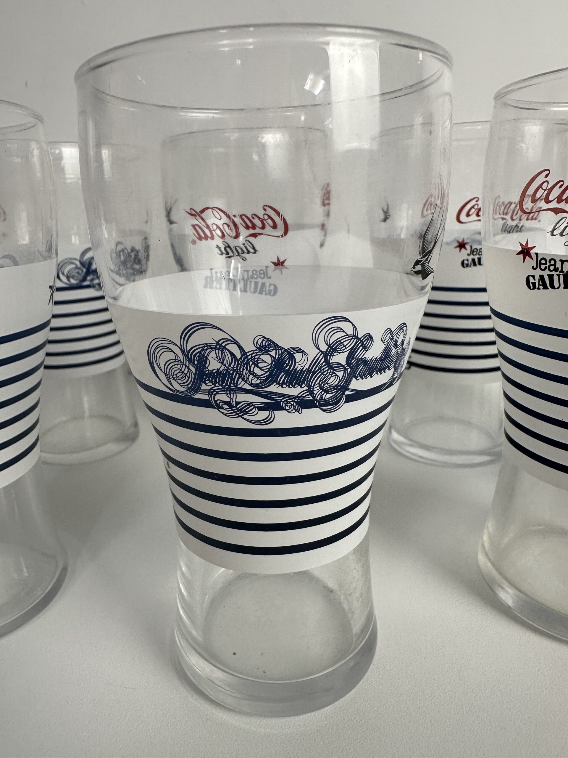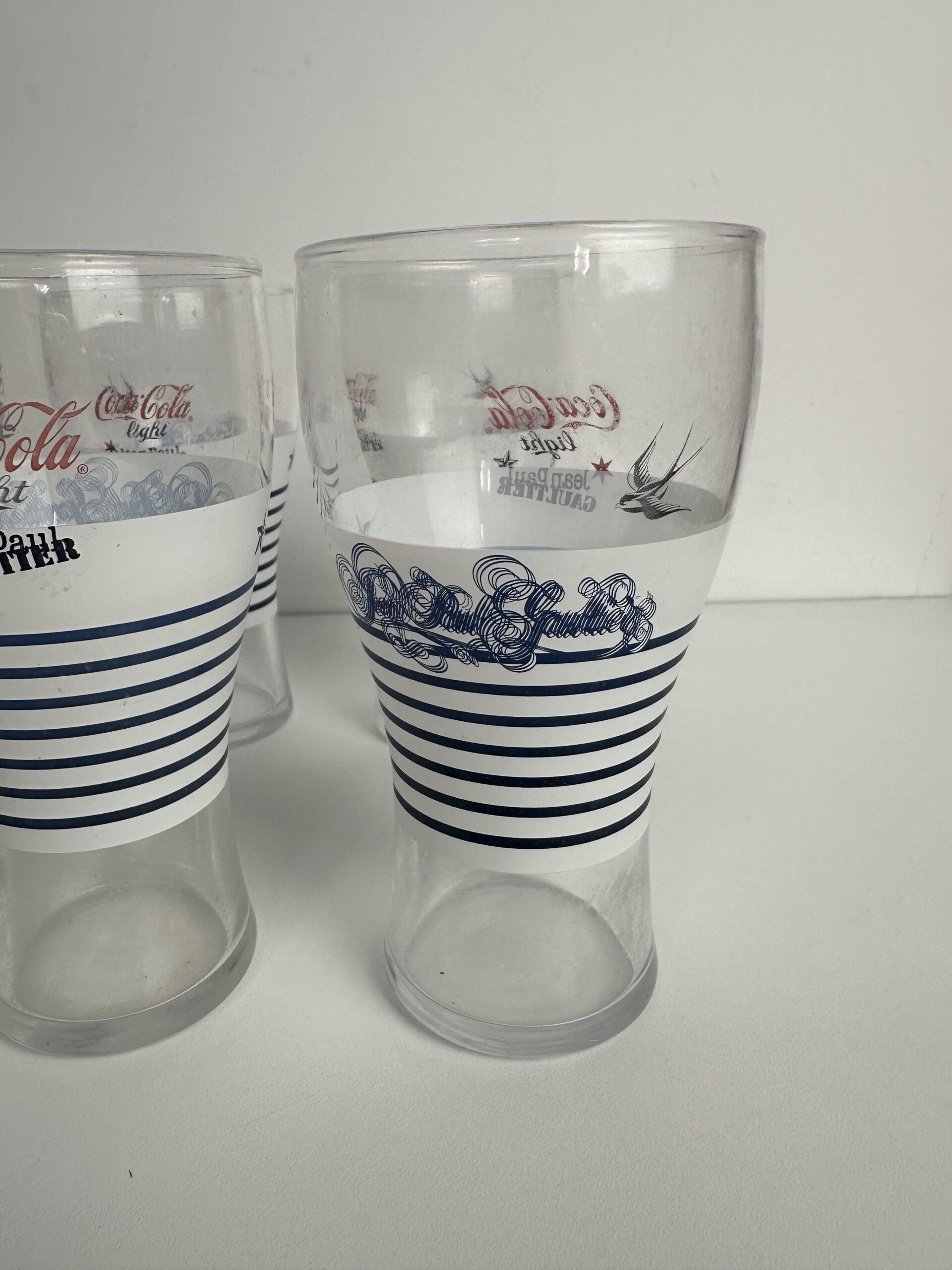 On reconnaît immédiatement la signature iconique de Jean-Paul Gaultier sur ces verres Coca-Cola de collection. La célèbre marinière blanche et bleue, avec des motifs emblématiques comme l’ancre, l’étoile et l’hirondelle. Un clin d’œil audacieux à l’univers du créateur, entre esprit marin et élégance couture.