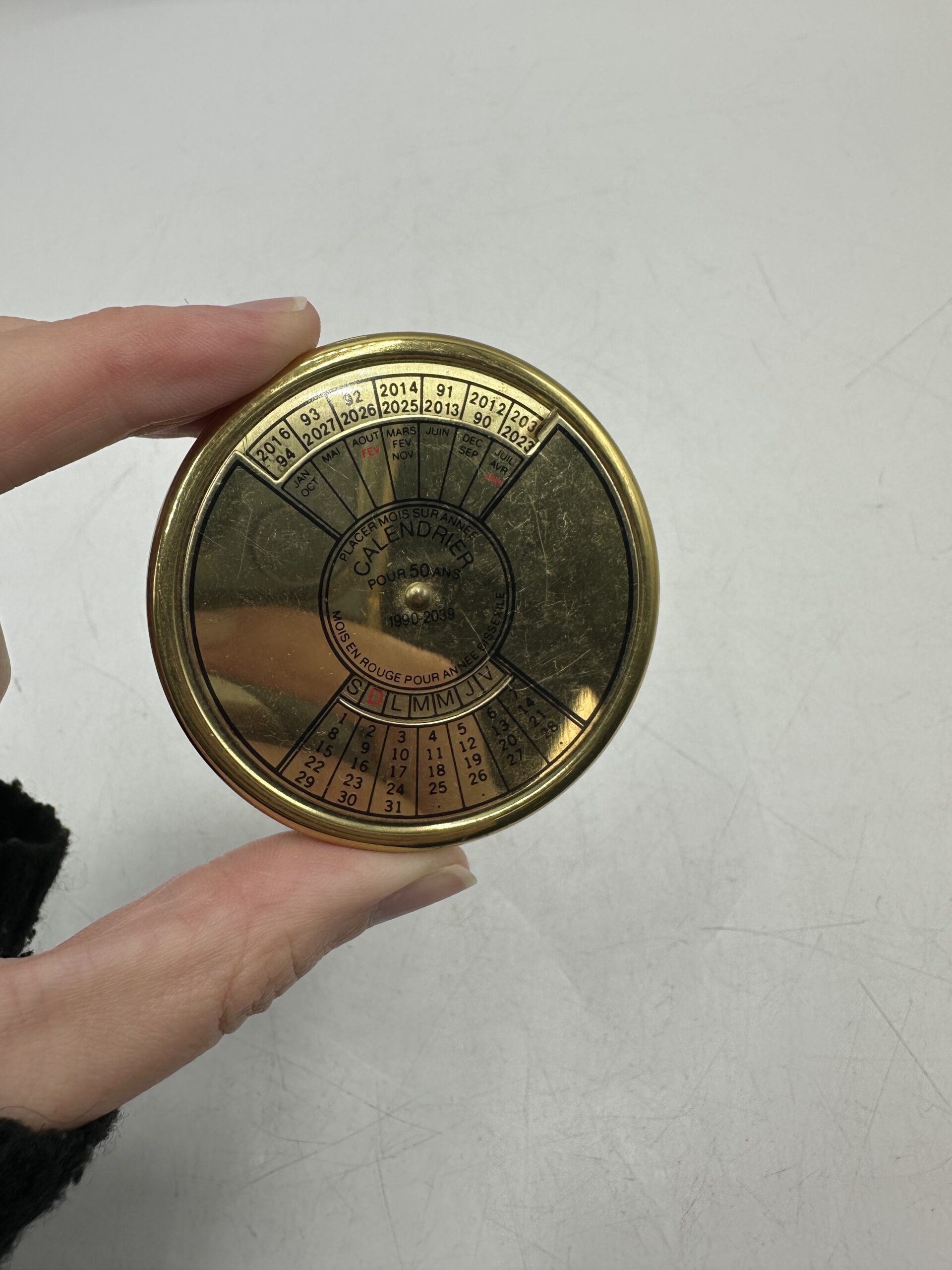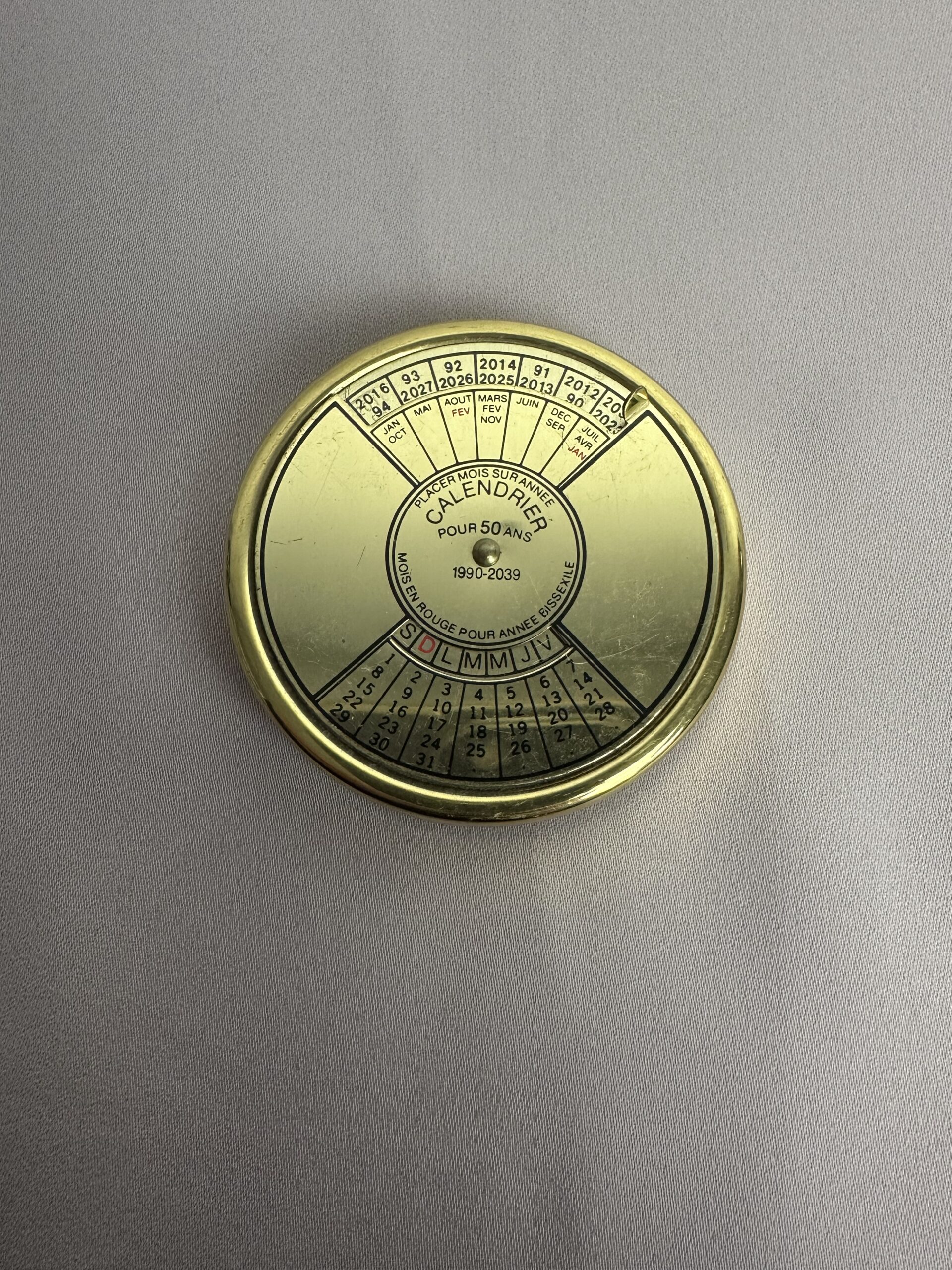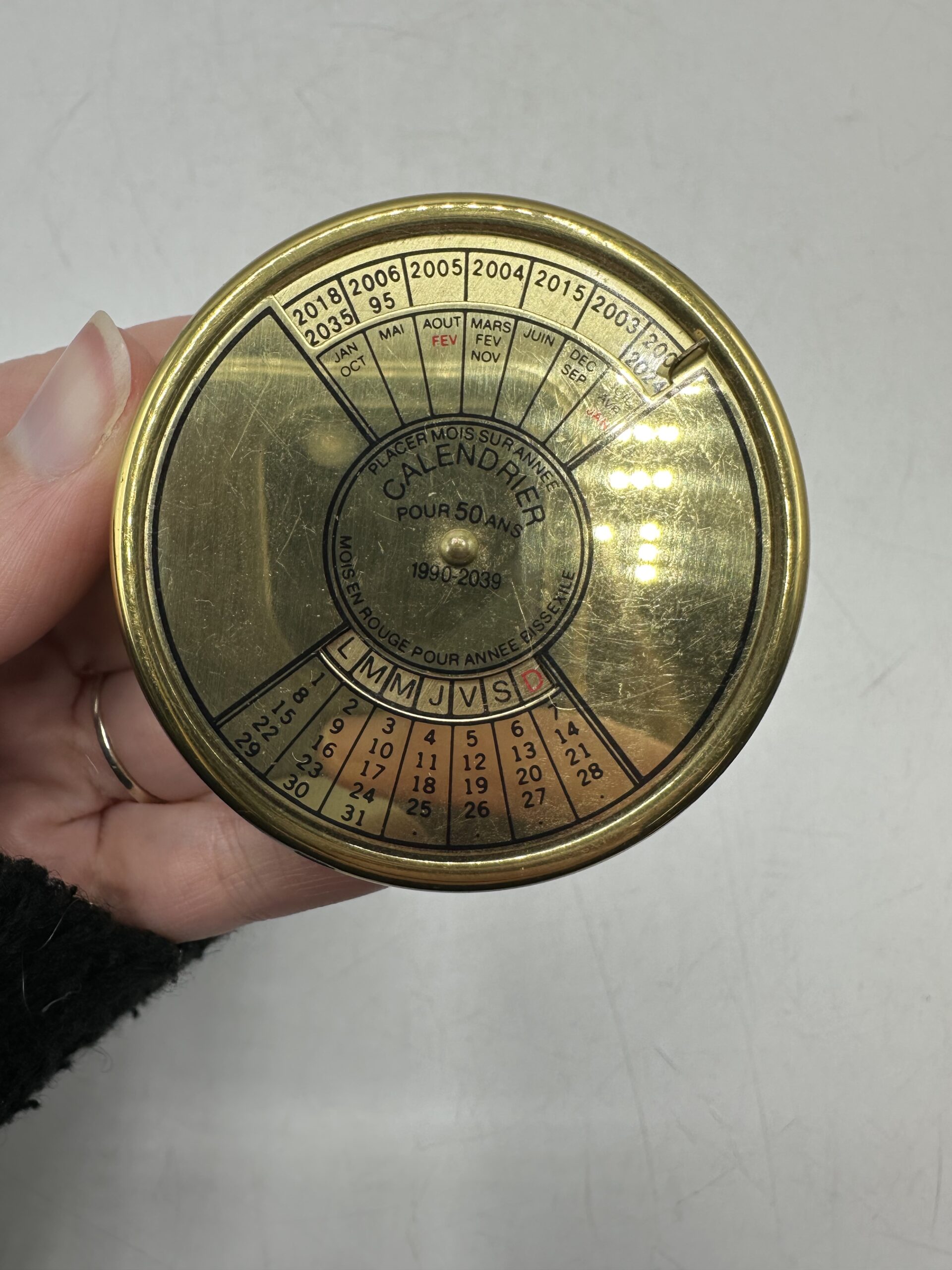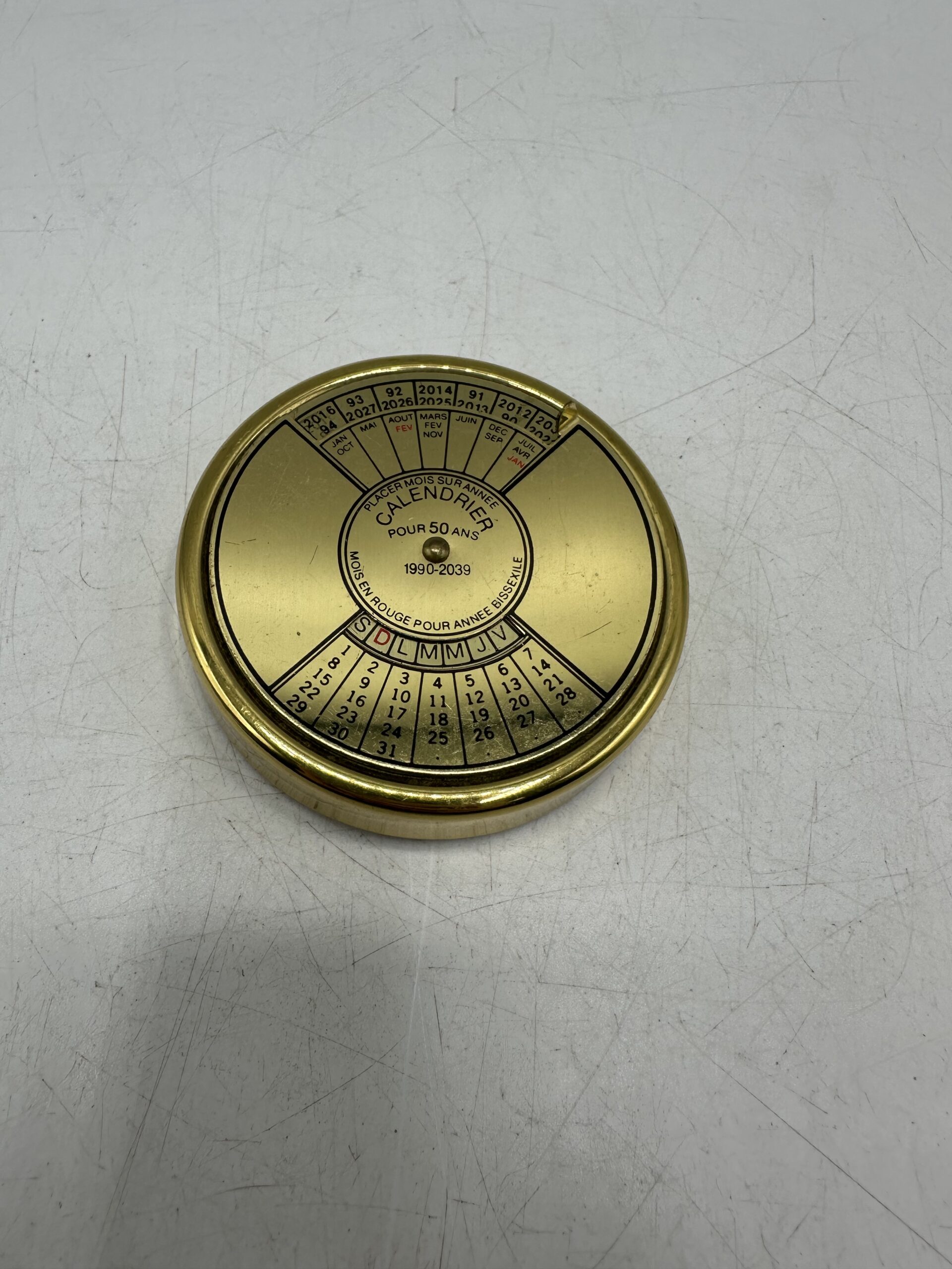 Doré (peut-être en laiton) il affiche un style élégant et intemporel qui rappelle les instruments de navigation et les objets de curiosité des années passées. Ce calendrier perpétuel couvre une période de 1990 à 2039 et fonctionne grâce à un simple mécanisme rotatif permettant d’aligner l’année et le mois afin d’afficher instantanément le bon jour.