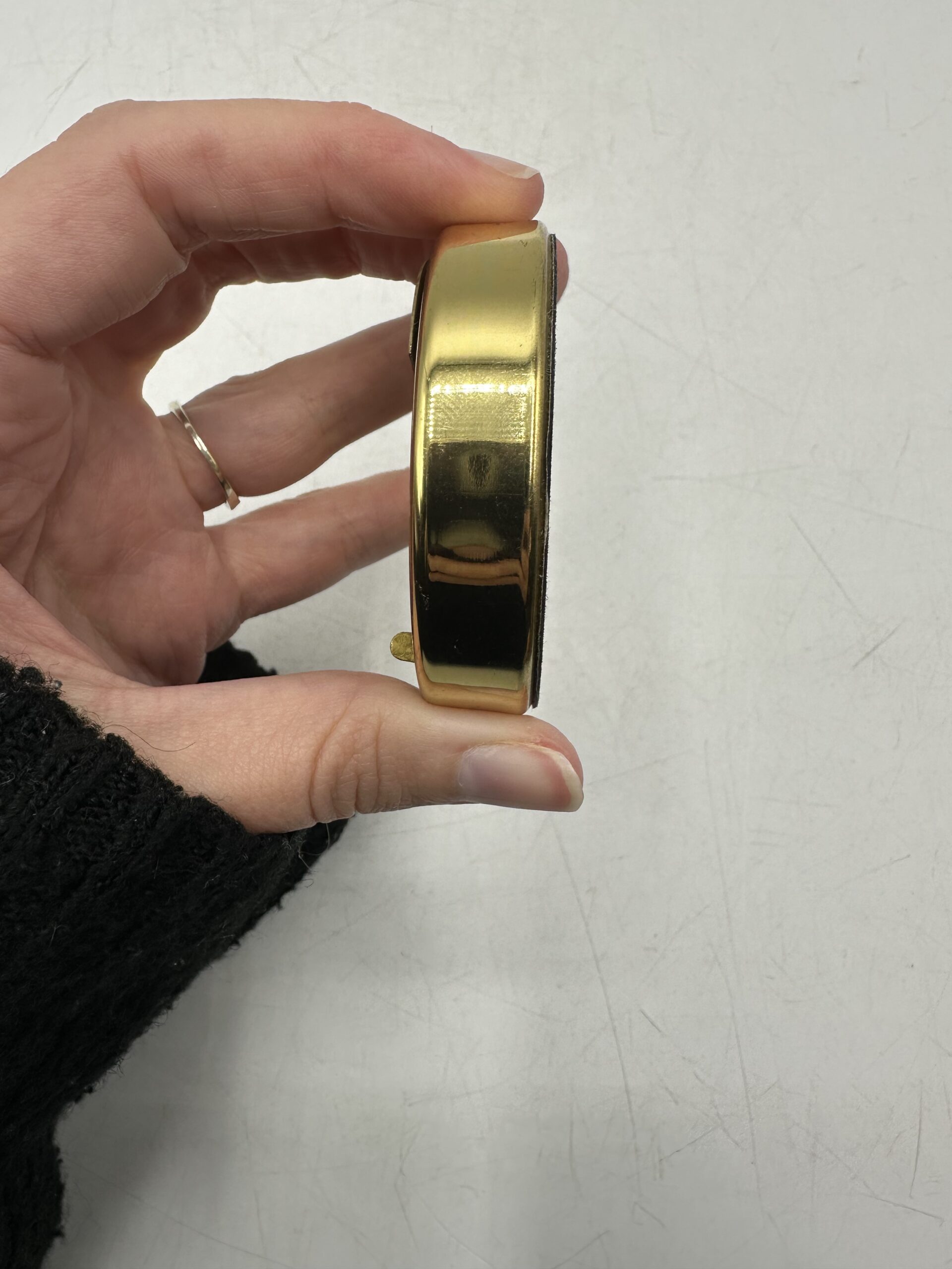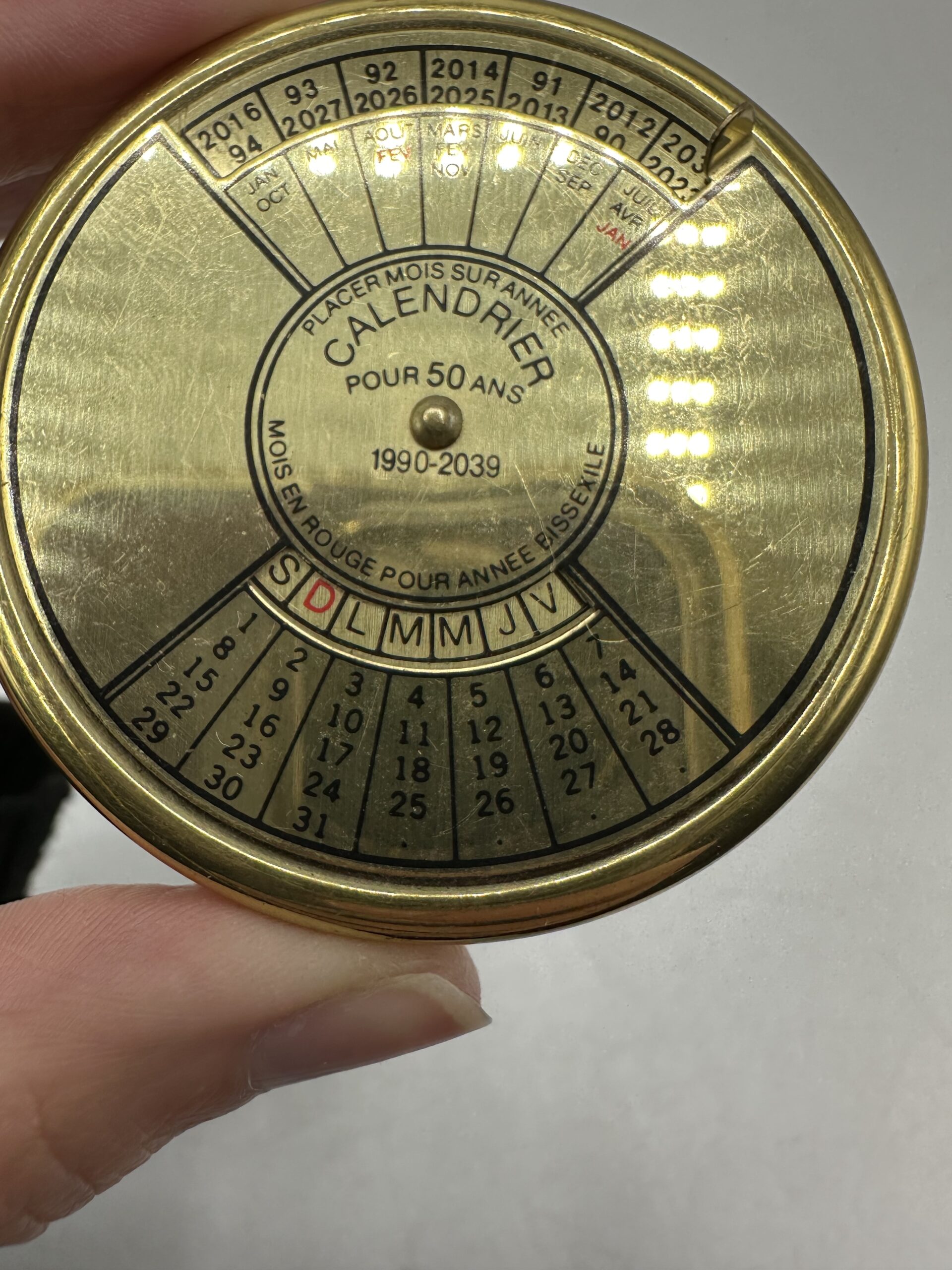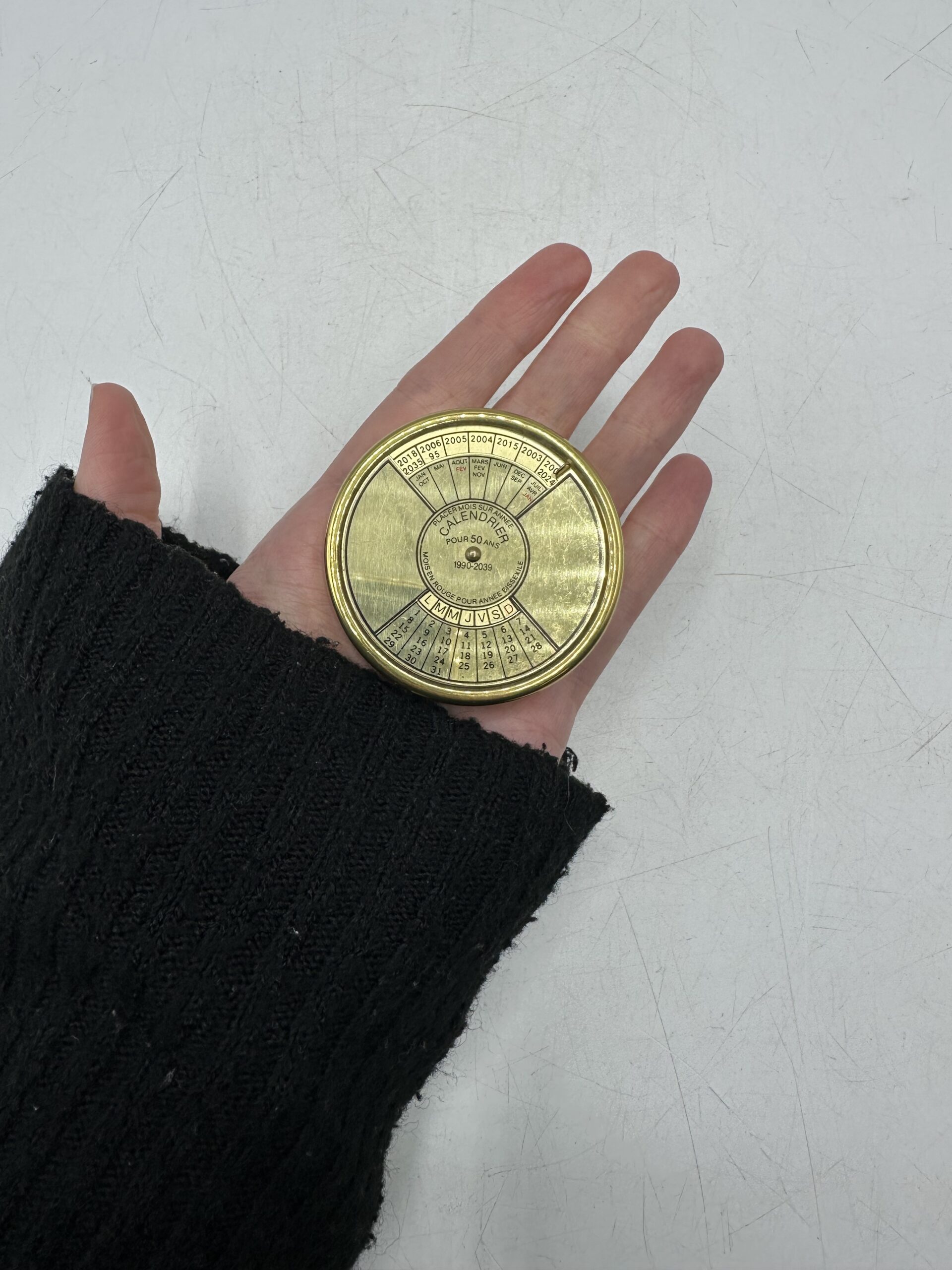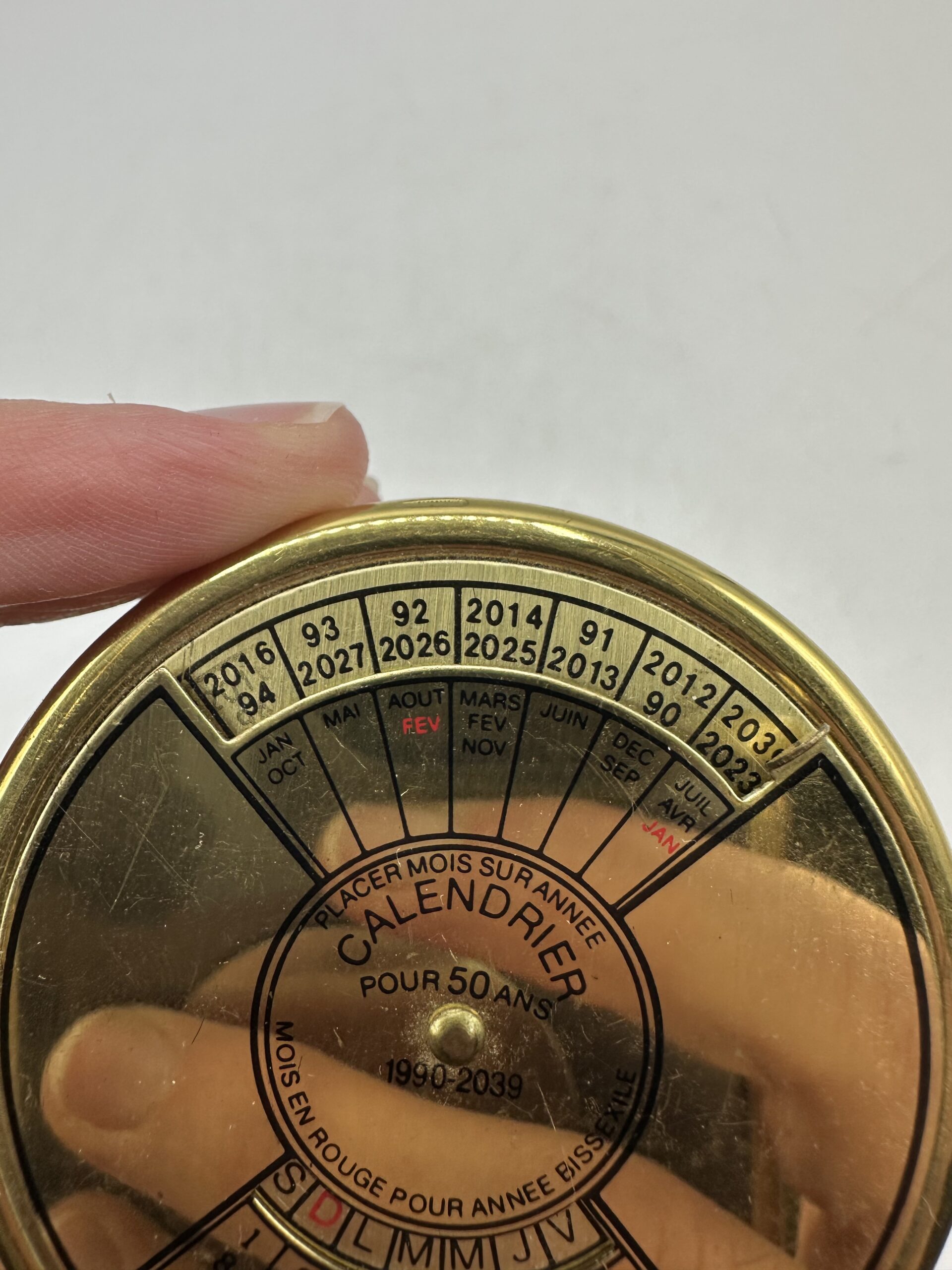 Doré (peut-être en laiton) il affiche un style élégant et intemporel qui rappelle les instruments de navigation et les objets de curiosité des années passées. Ce calendrier perpétuel couvre une période de 1990 à 2039 et fonctionne grâce à un simple mécanisme rotatif permettant d’aligner l’année et le mois afin d’afficher instantanément le bon jour.