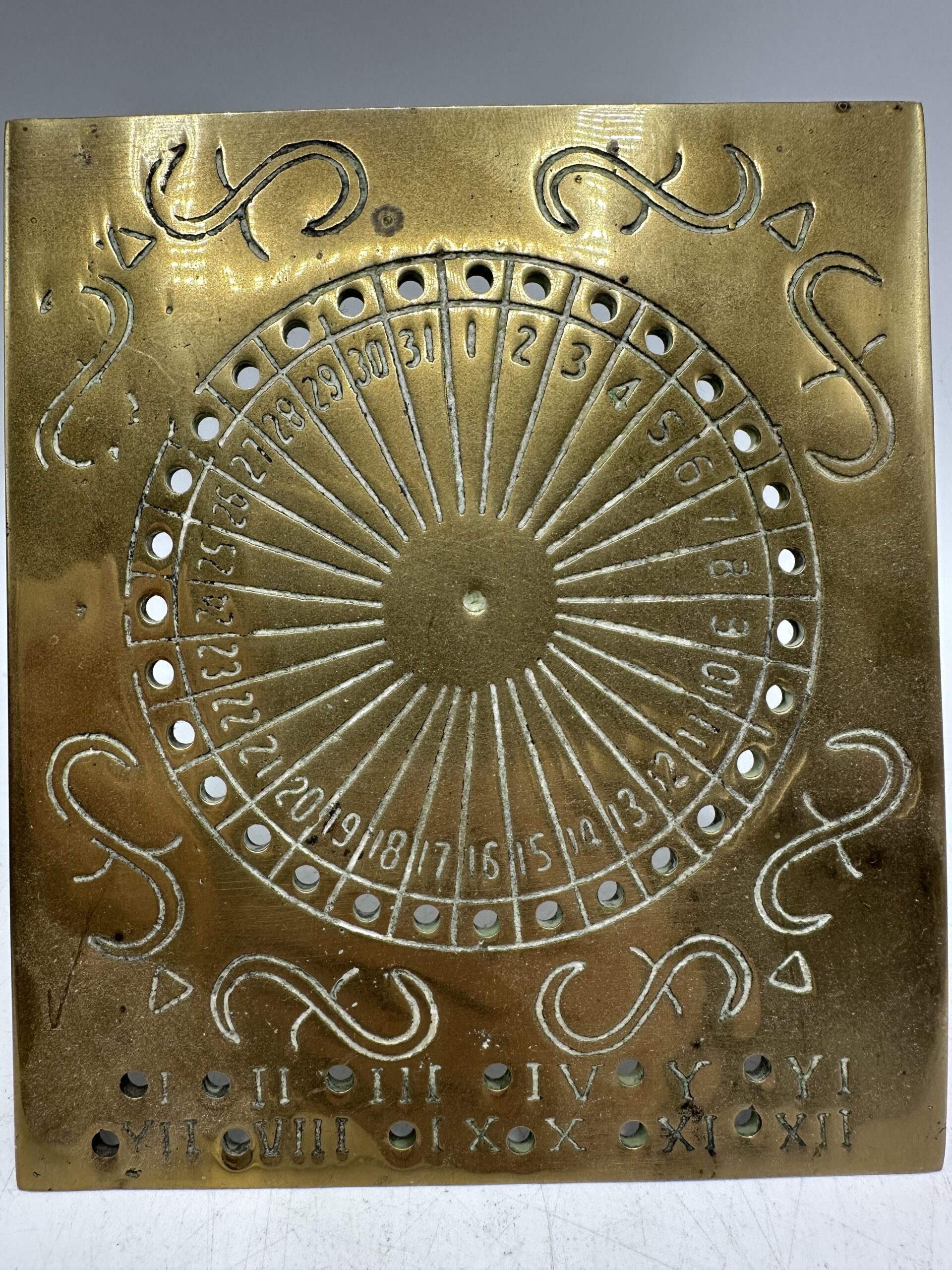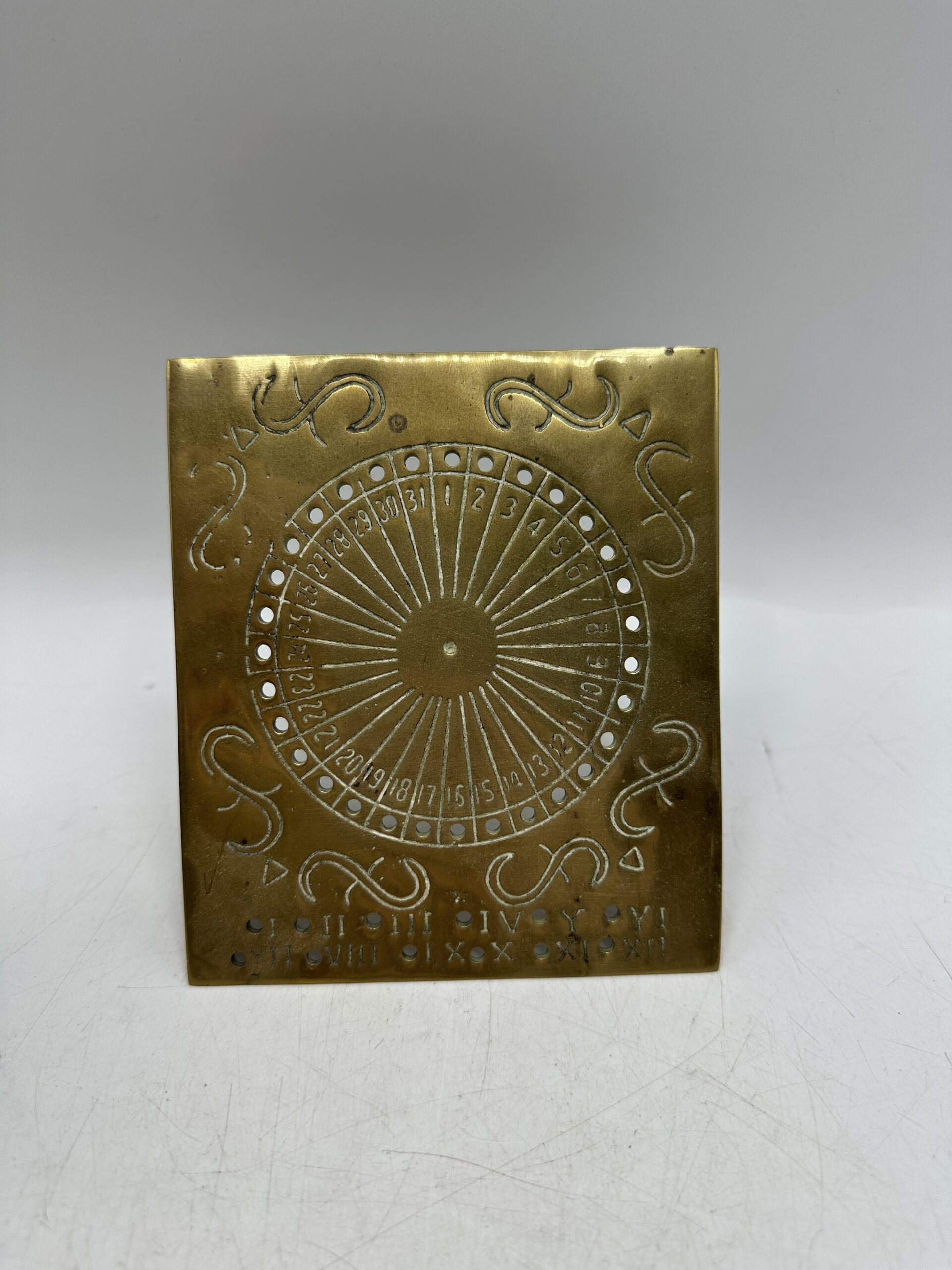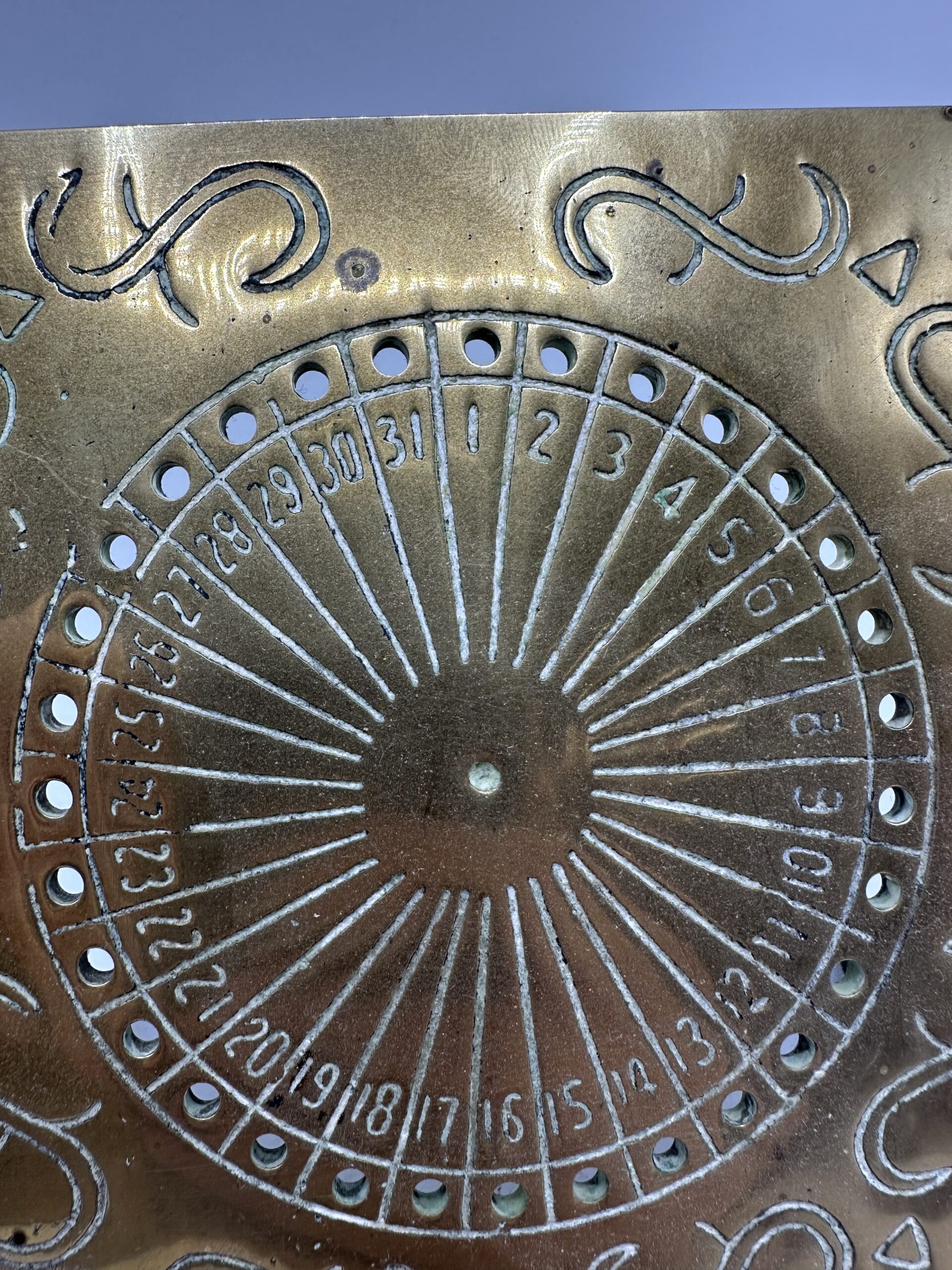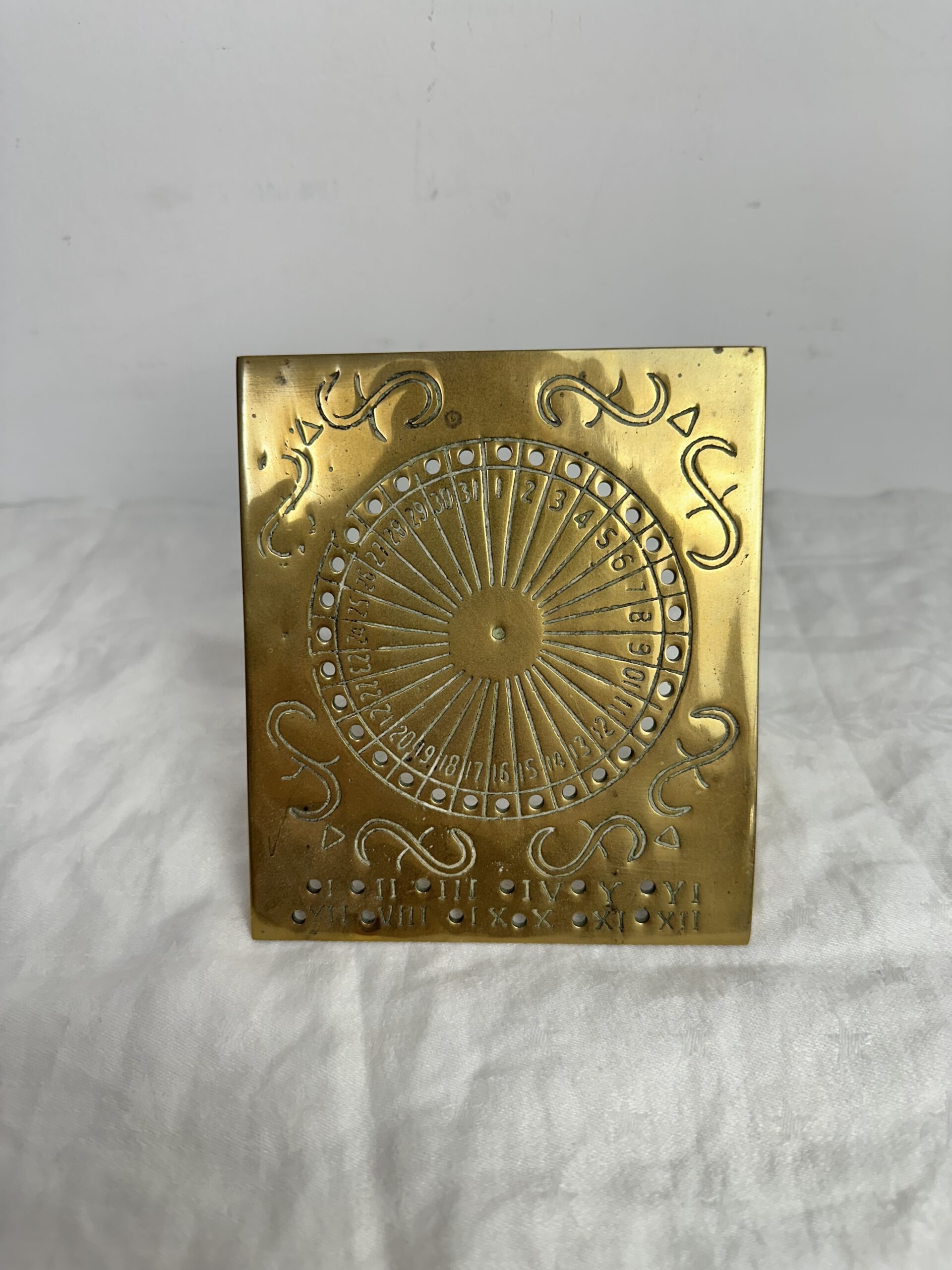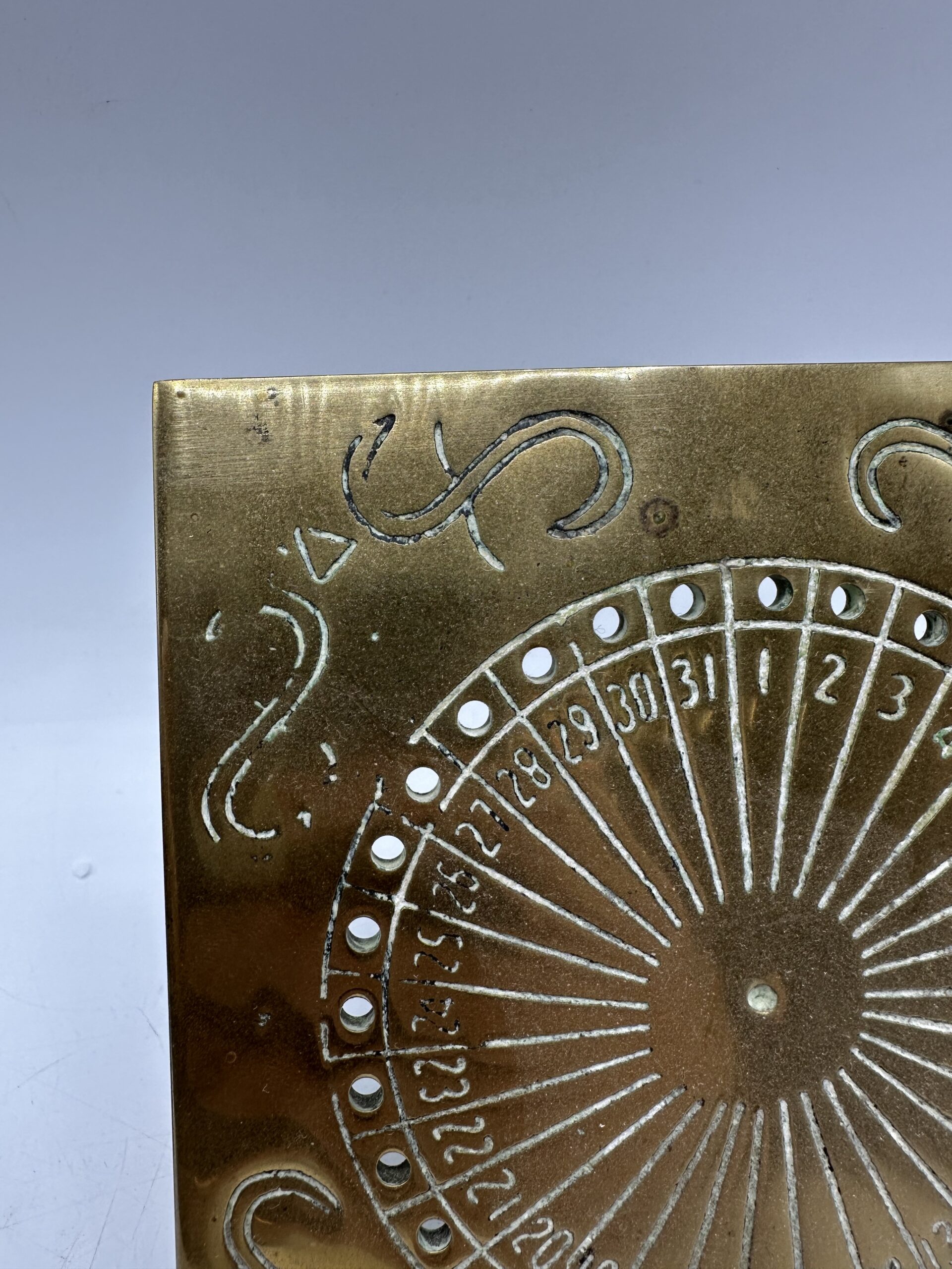 Amateurs et chineurs d’objets d’un autre temps, voici un ancien calendrier perpétuel laiton.