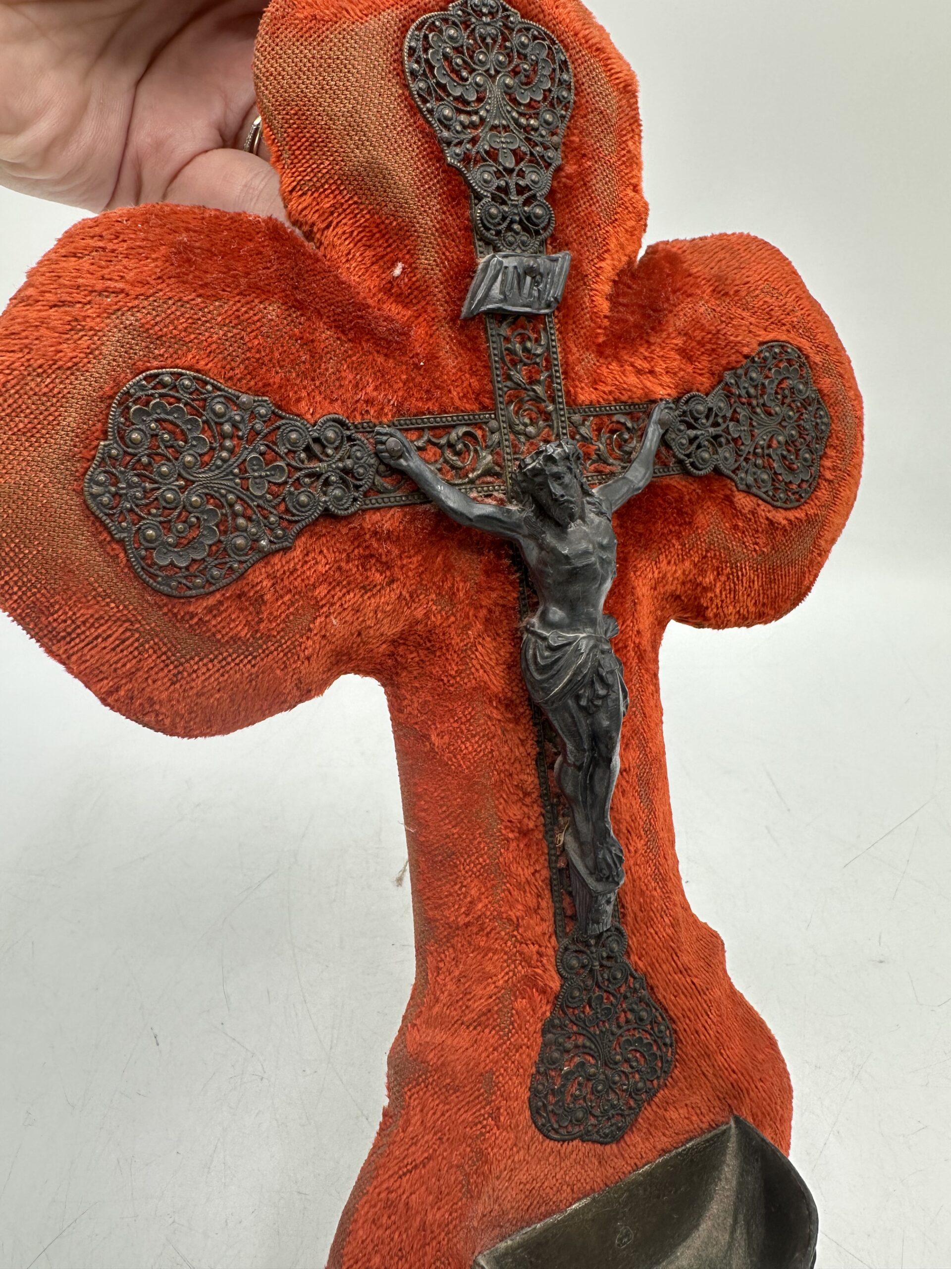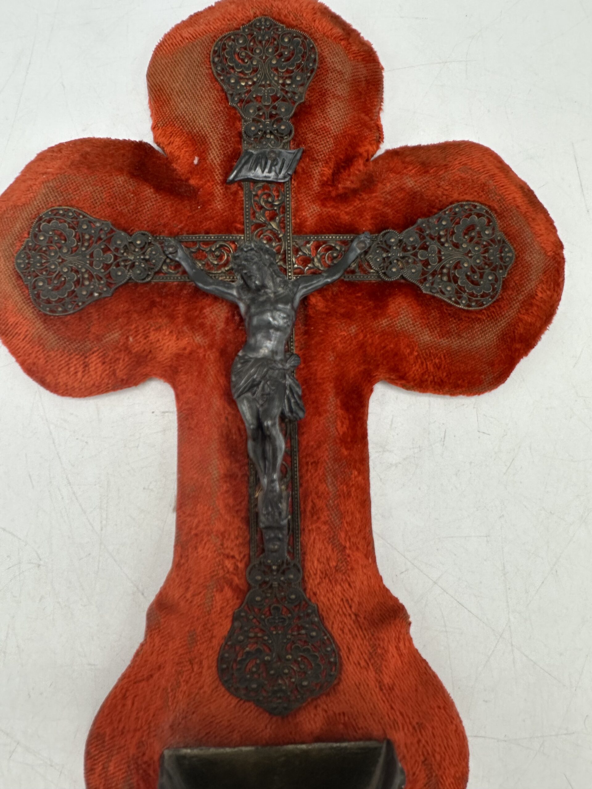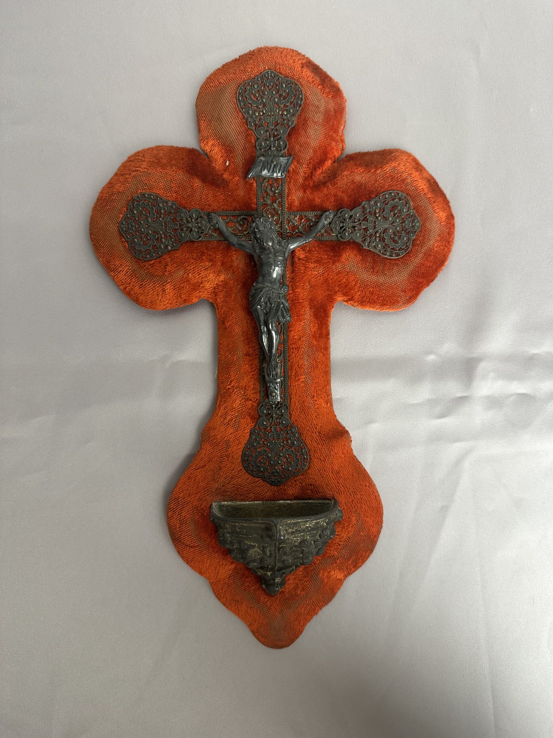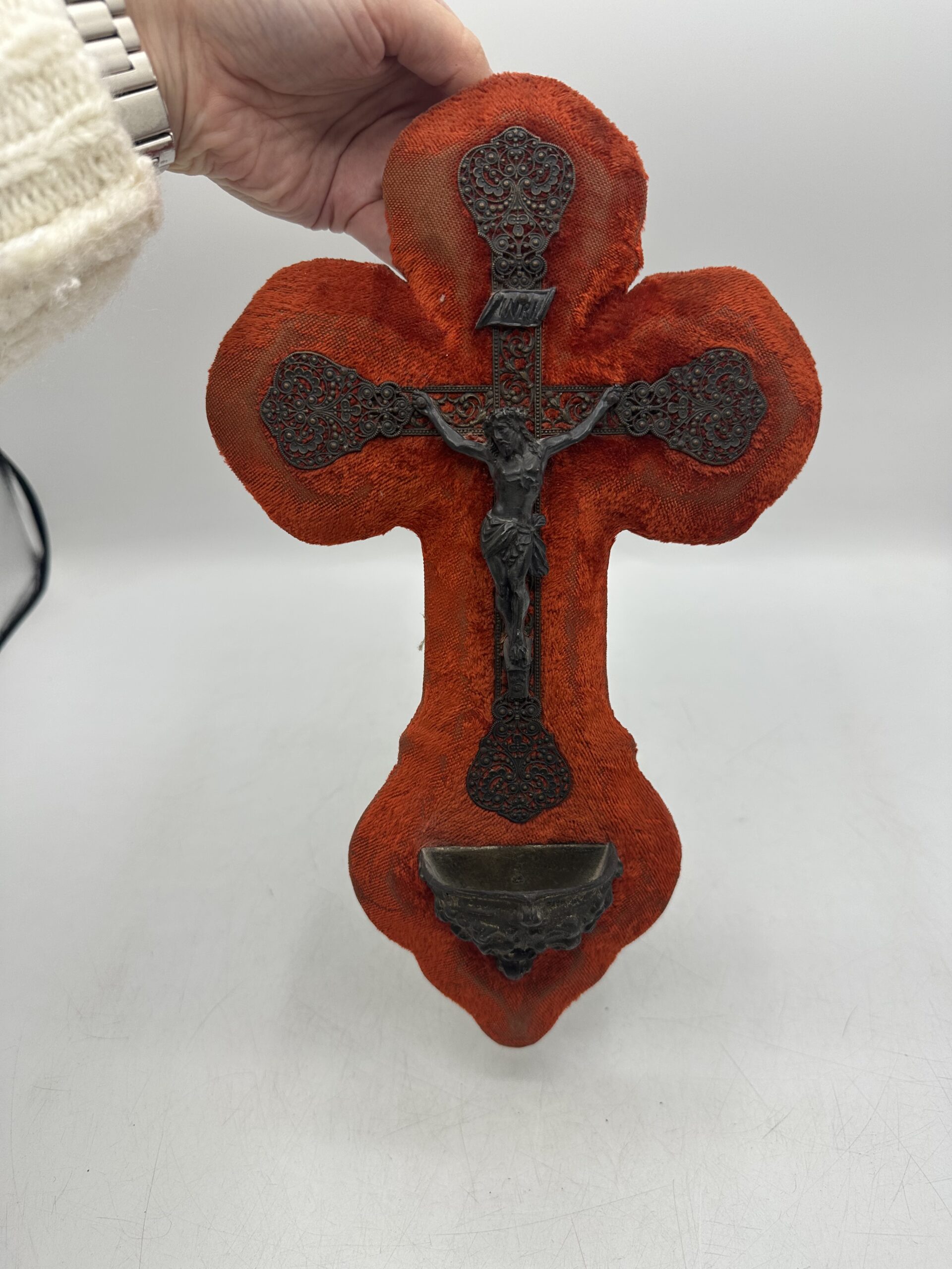 Cet ancien crucifix bénitier velours rouge est un bel objet religieux ancien à collectionner, à offrir ou à intégrer dans une décoration vintage.
