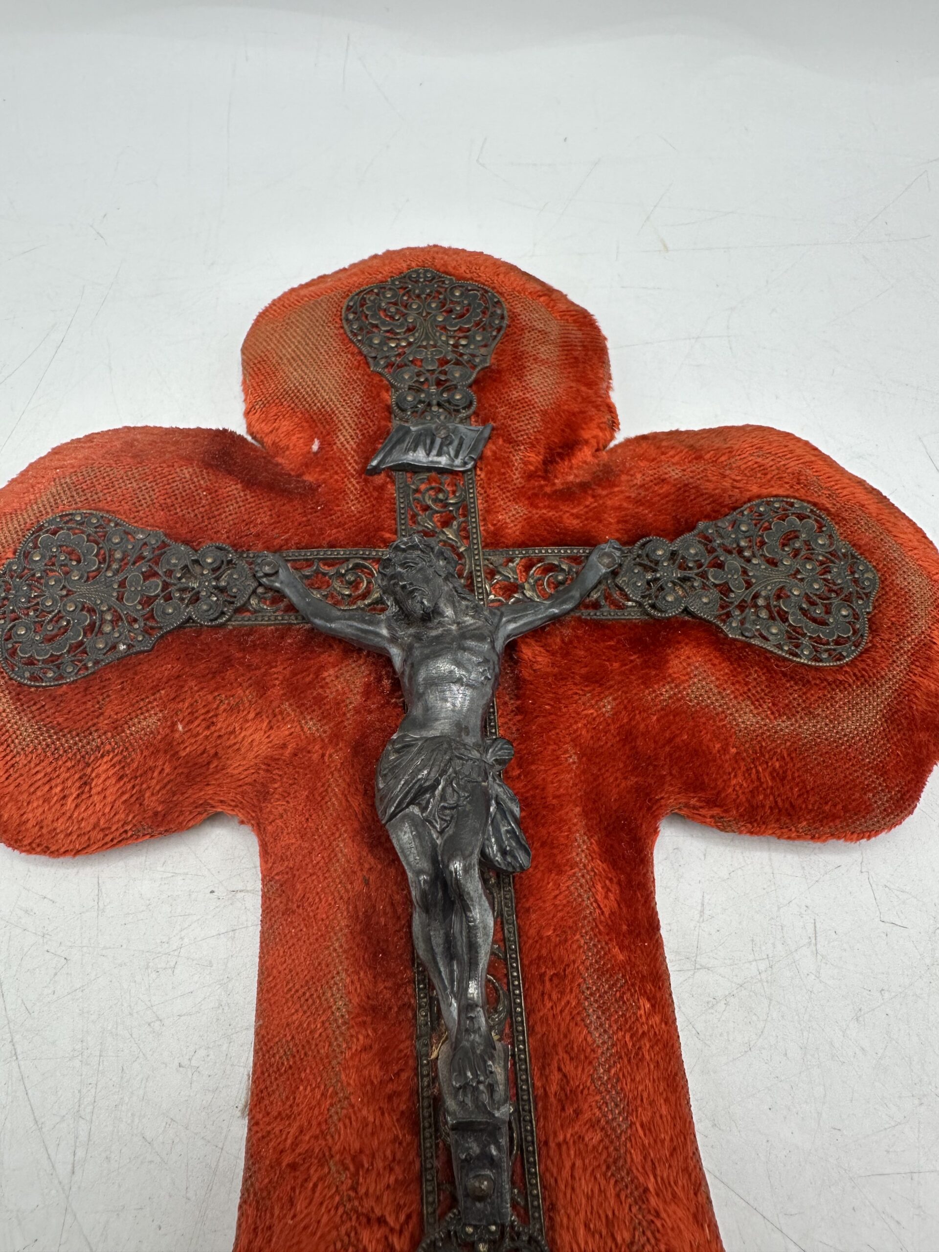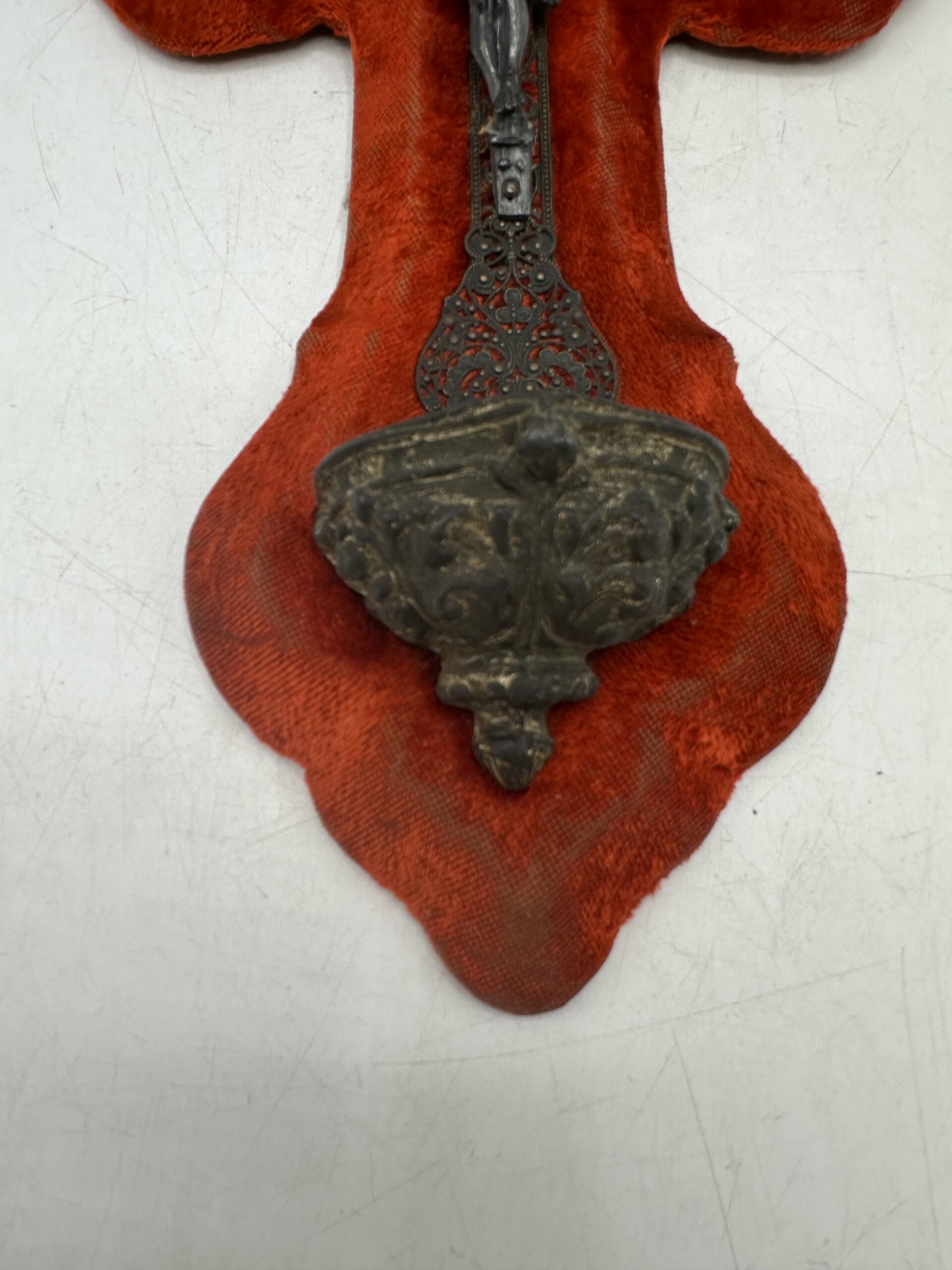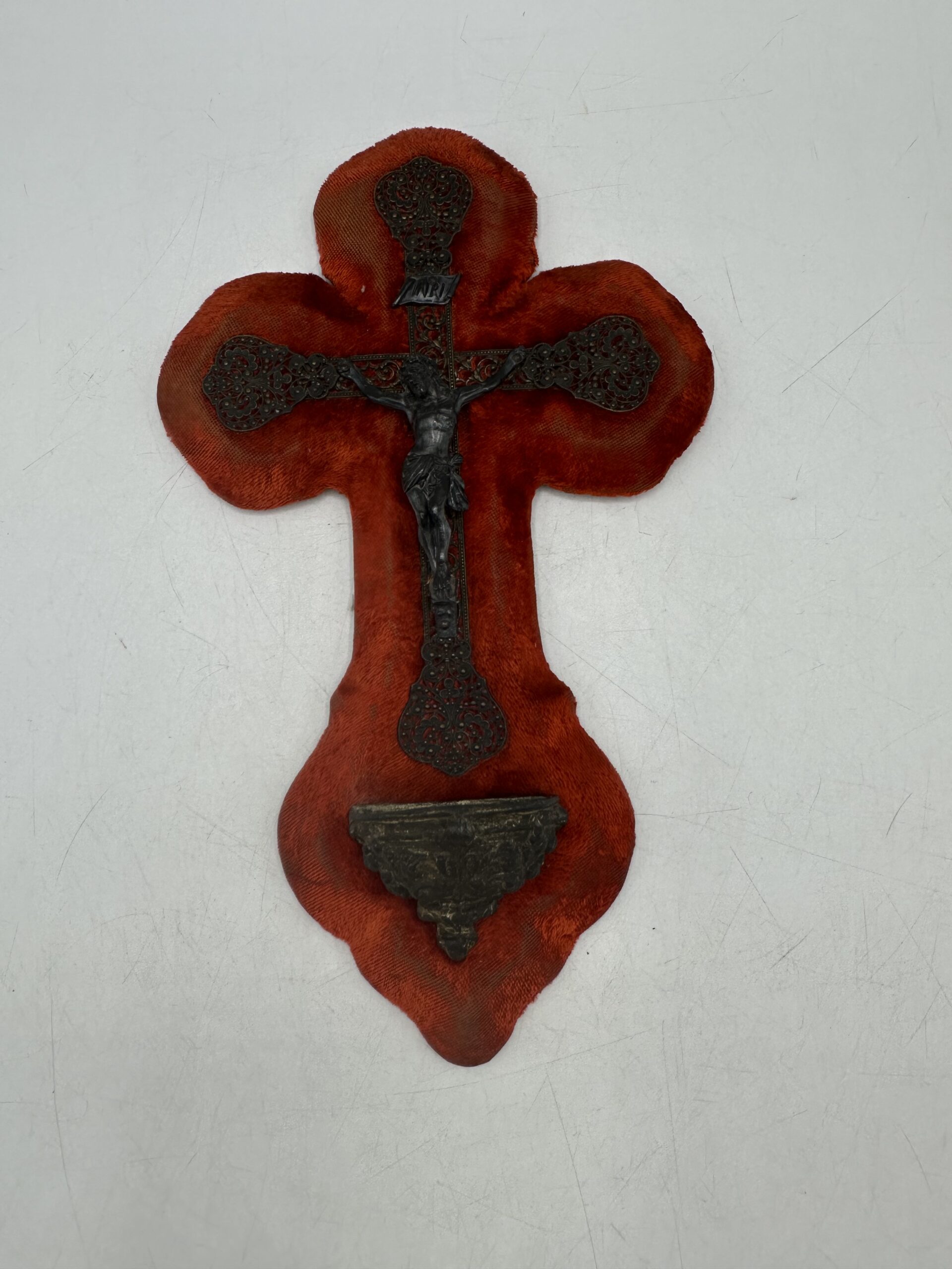 Avec sa croix recouverte d’un velours rouge profond et son Christ en métal finement travaillé, il dégage un charme d’antan unique. Le bénitier, également en métal, présente une belle patine témoignant de son âge et de son histoire.