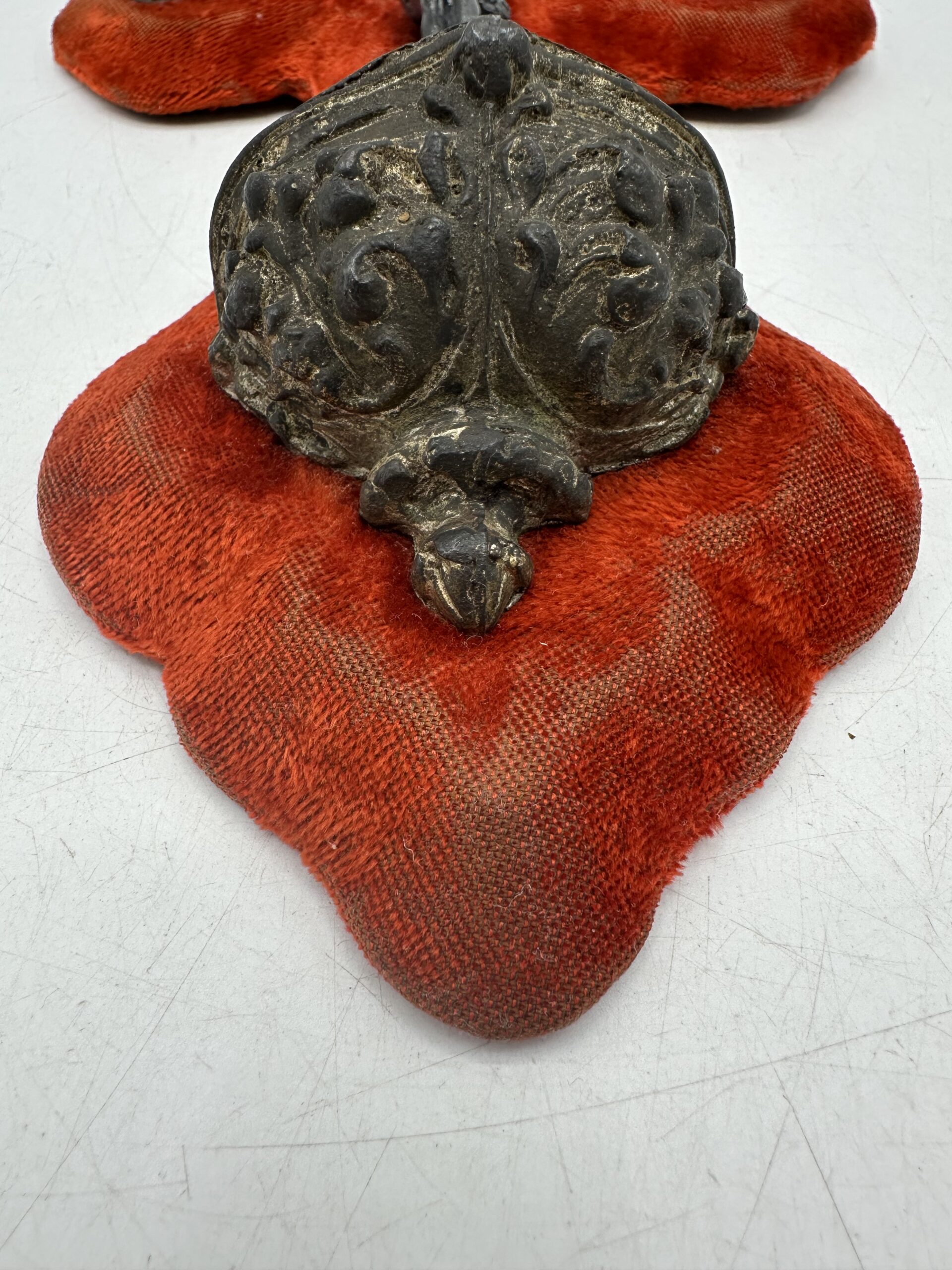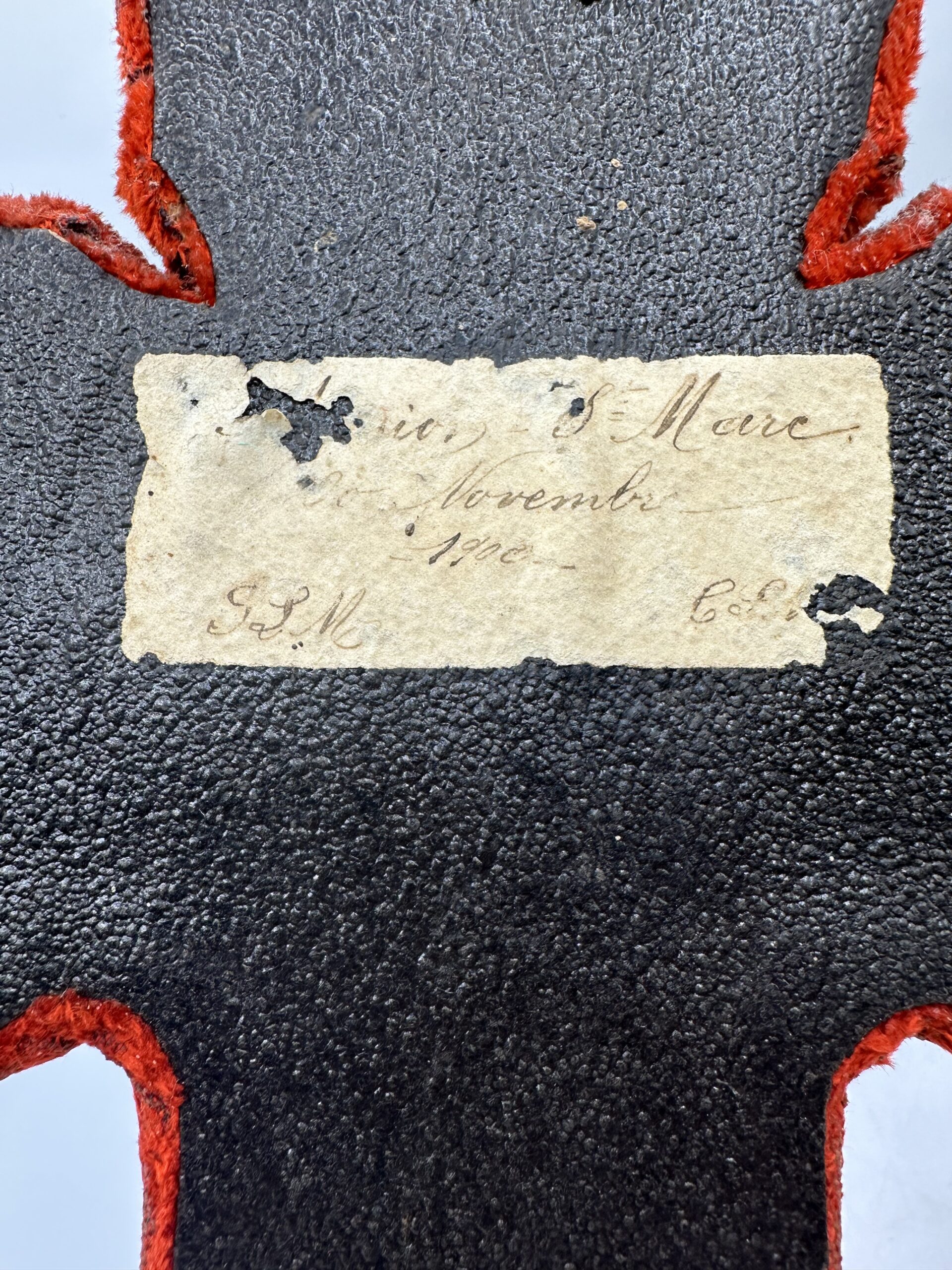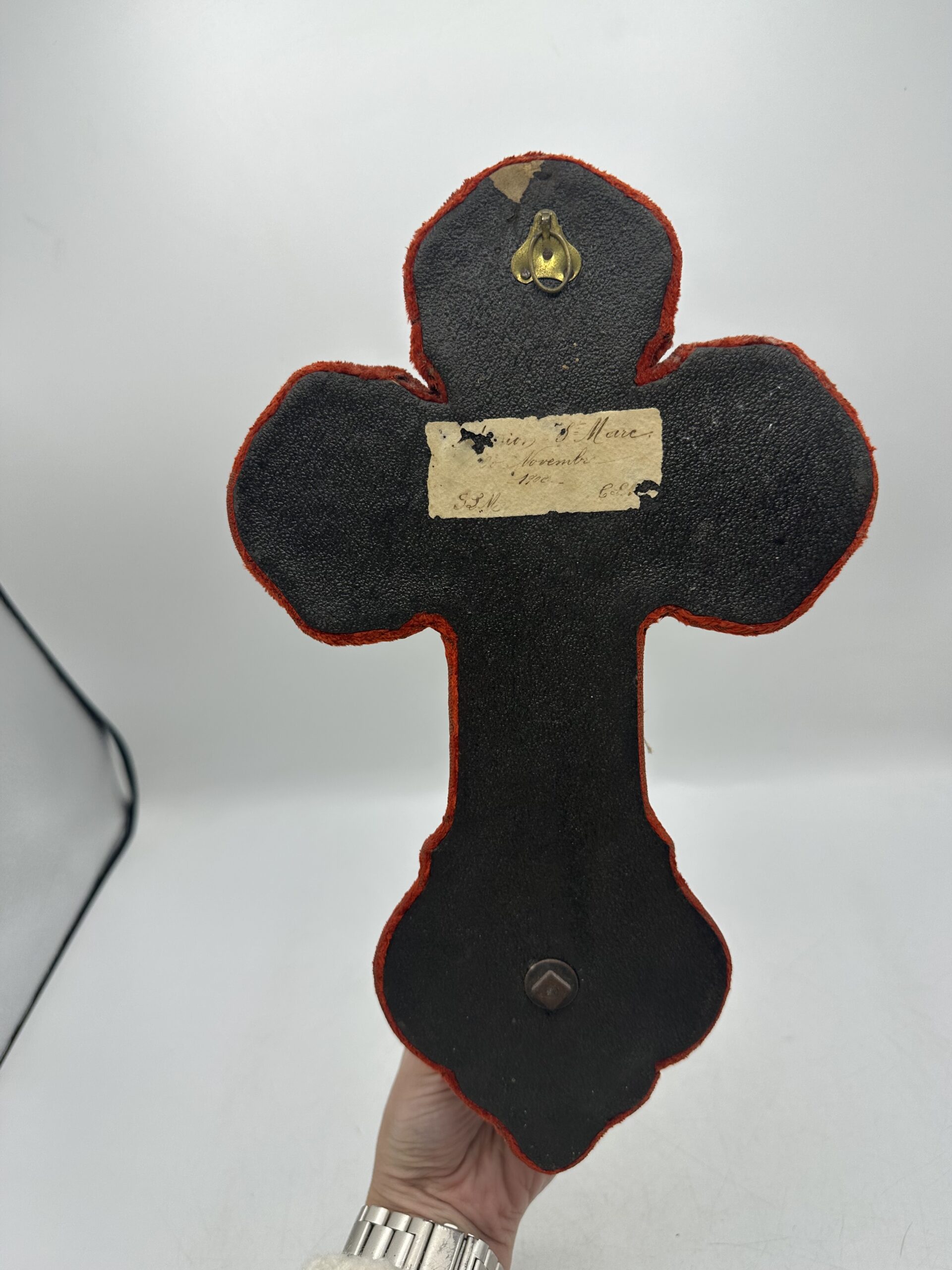 Cette croix ancienne est en bon état. Le velours est abîmé et usé à certains endroits. AU dos il y a une étiquette difficilement lisible. Bien regarder les photos !
