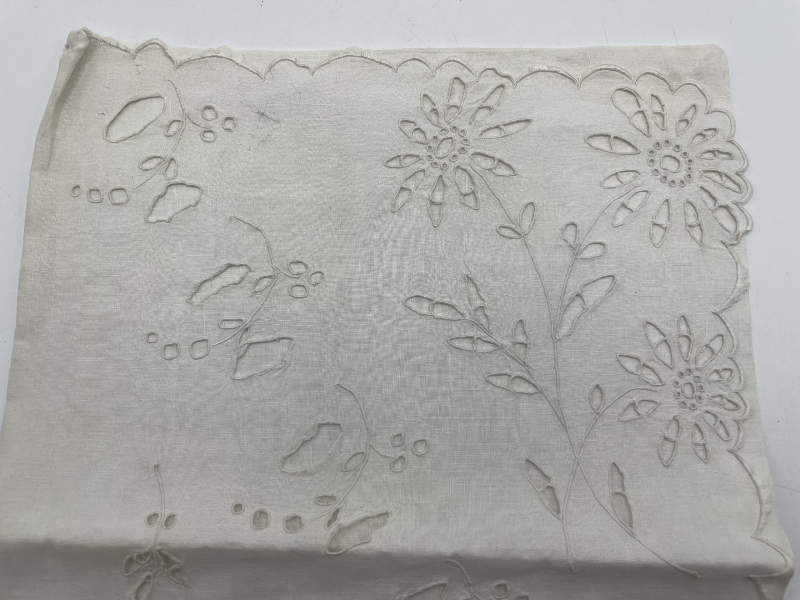 On adore ce joli porte serviettes ou porte oreiller. Vintage, le porte serviette est en lin brodé et il a une jolie couleur écrue. Le rabat du porte serviette est joliment décoré de broderies en forme de fleurs avec des effets de vide qui lui donnent toute son élégance. Vintage, des traces d’usure sont à prévoir (cf photos) jolies marques du temps passé. Magnifique !