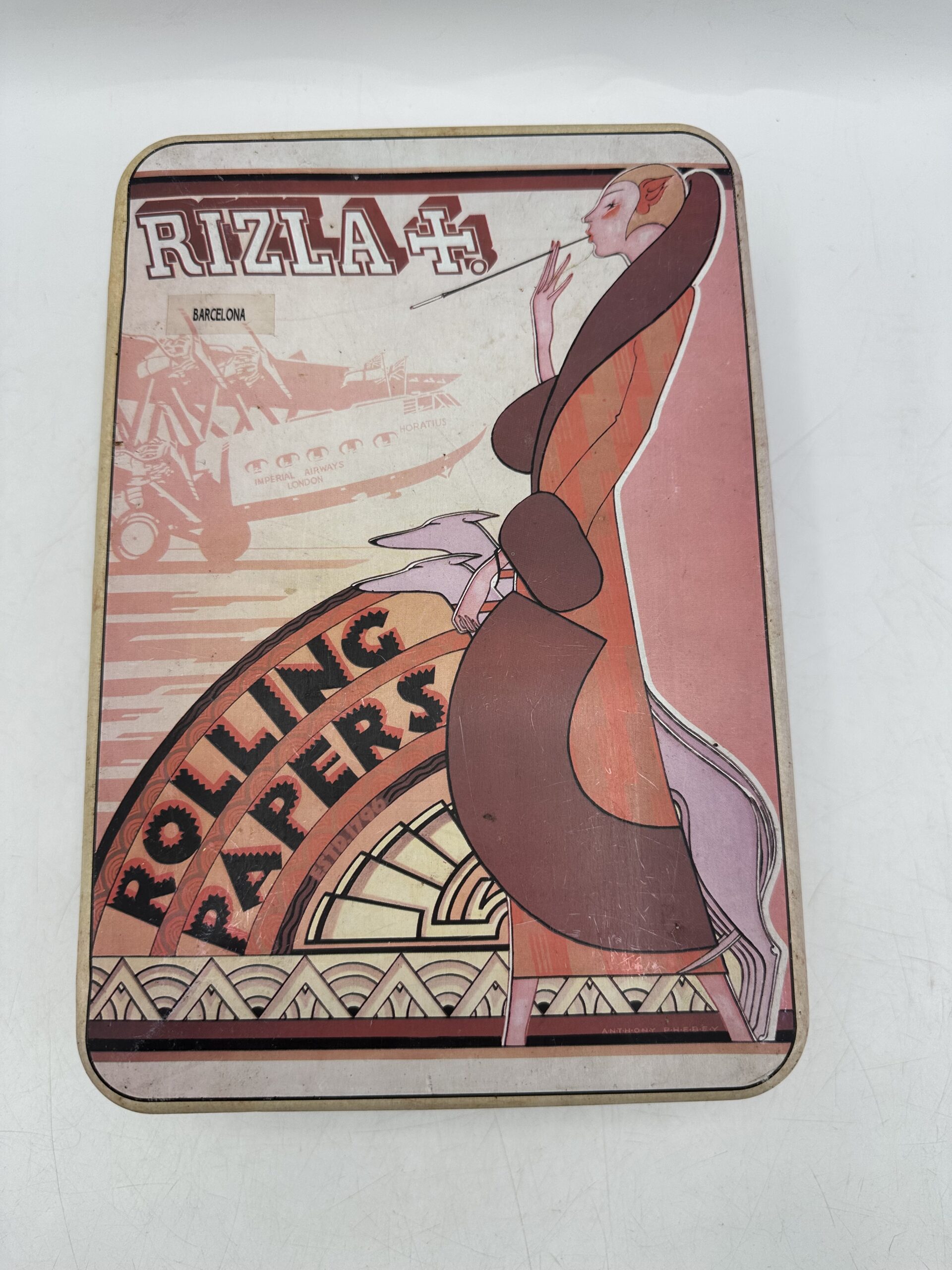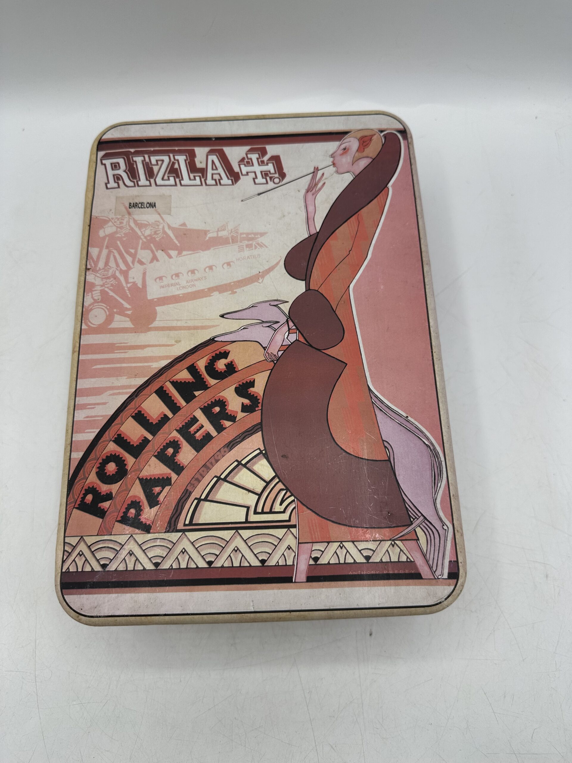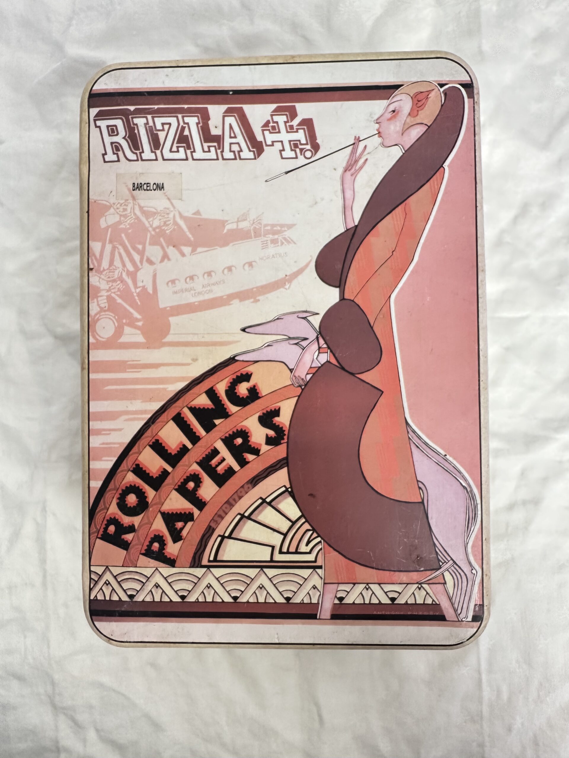 Rizla + c’est la célèbre marque qui propose du papier à cigarette. Et ici nous avons une superbe boite en métal vintage à souhait au design art déco. On y voit au premier plan une dame qui fume ue cigarette avec ses deux chiens, et en arrière plan un décor sur le thème aviateur.