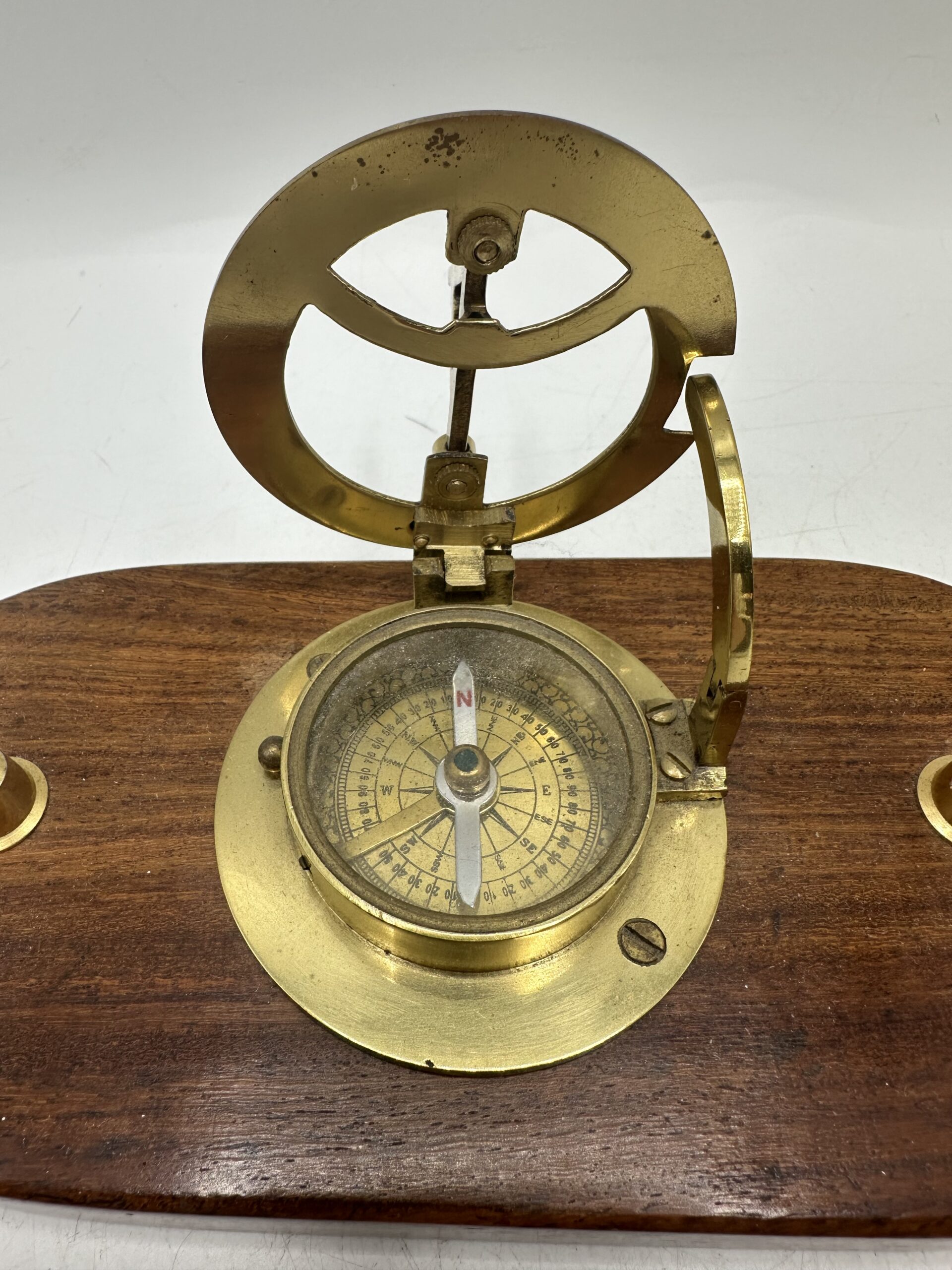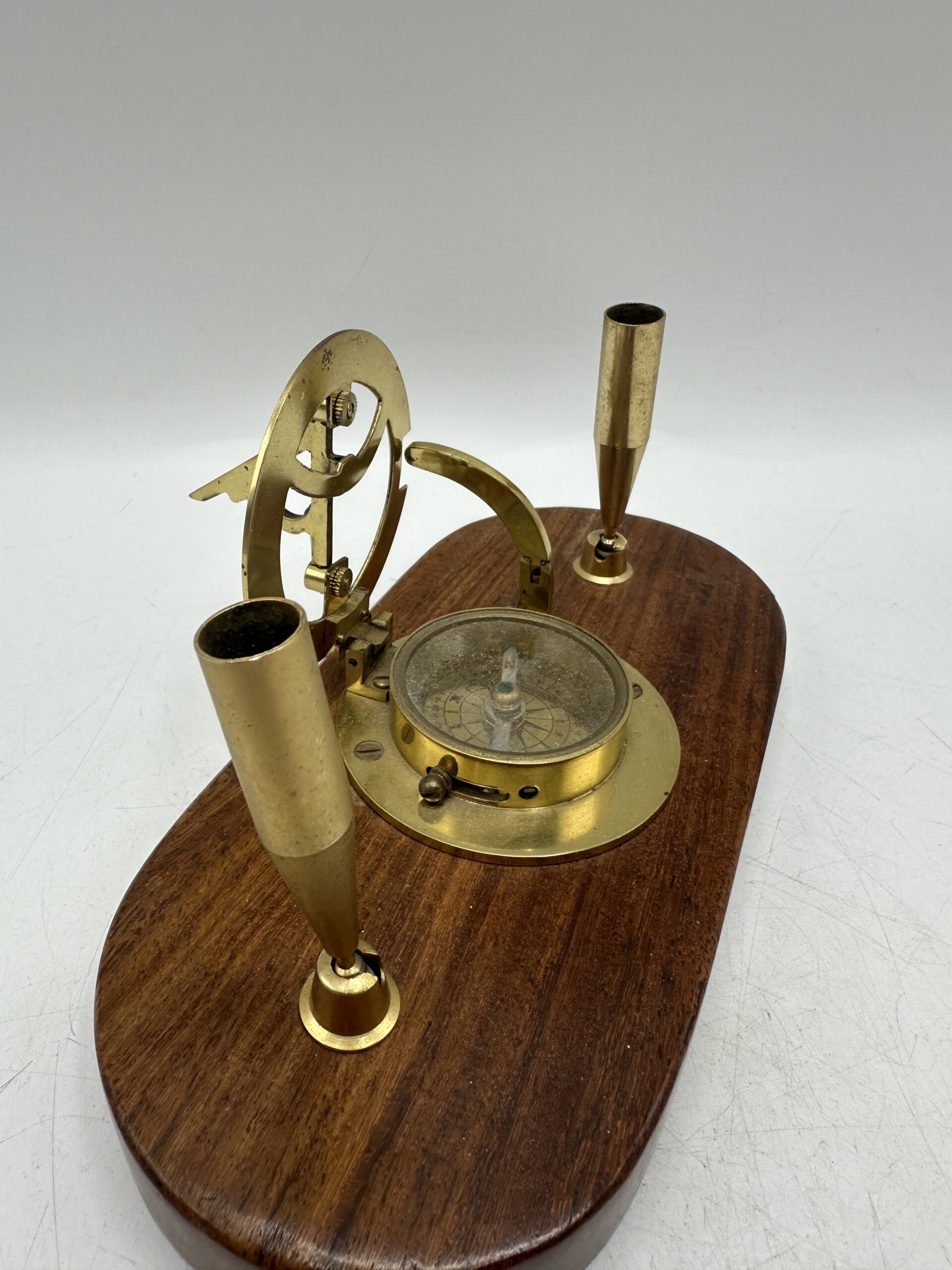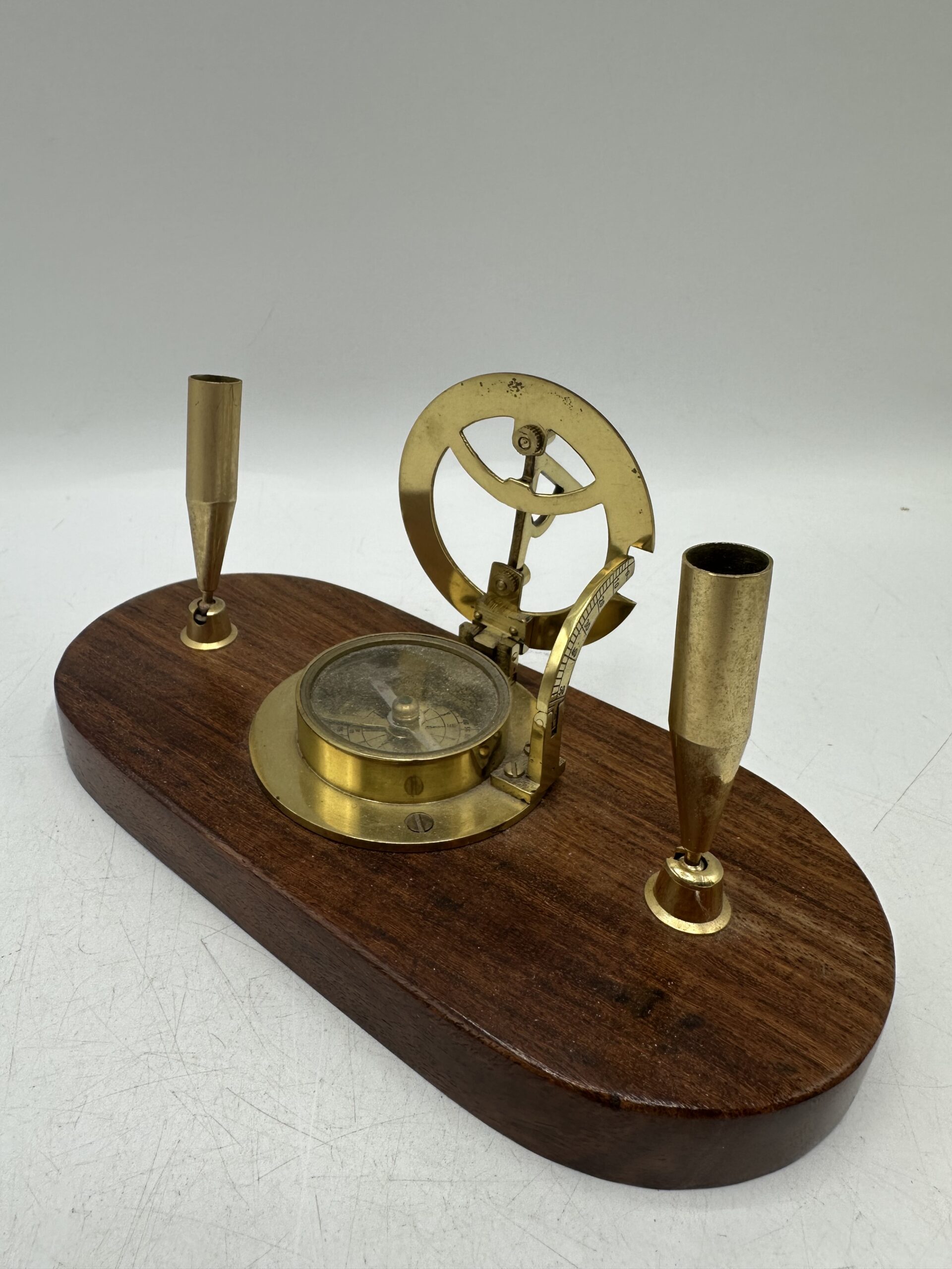 La boussole est posée sur un socle avec aux extrémités deux éléments qui semblent être des porte-stylos. Un instrument ancien, typique des outils utilisés pour les mesures et orientations dans la première moitié du XXe siècle.