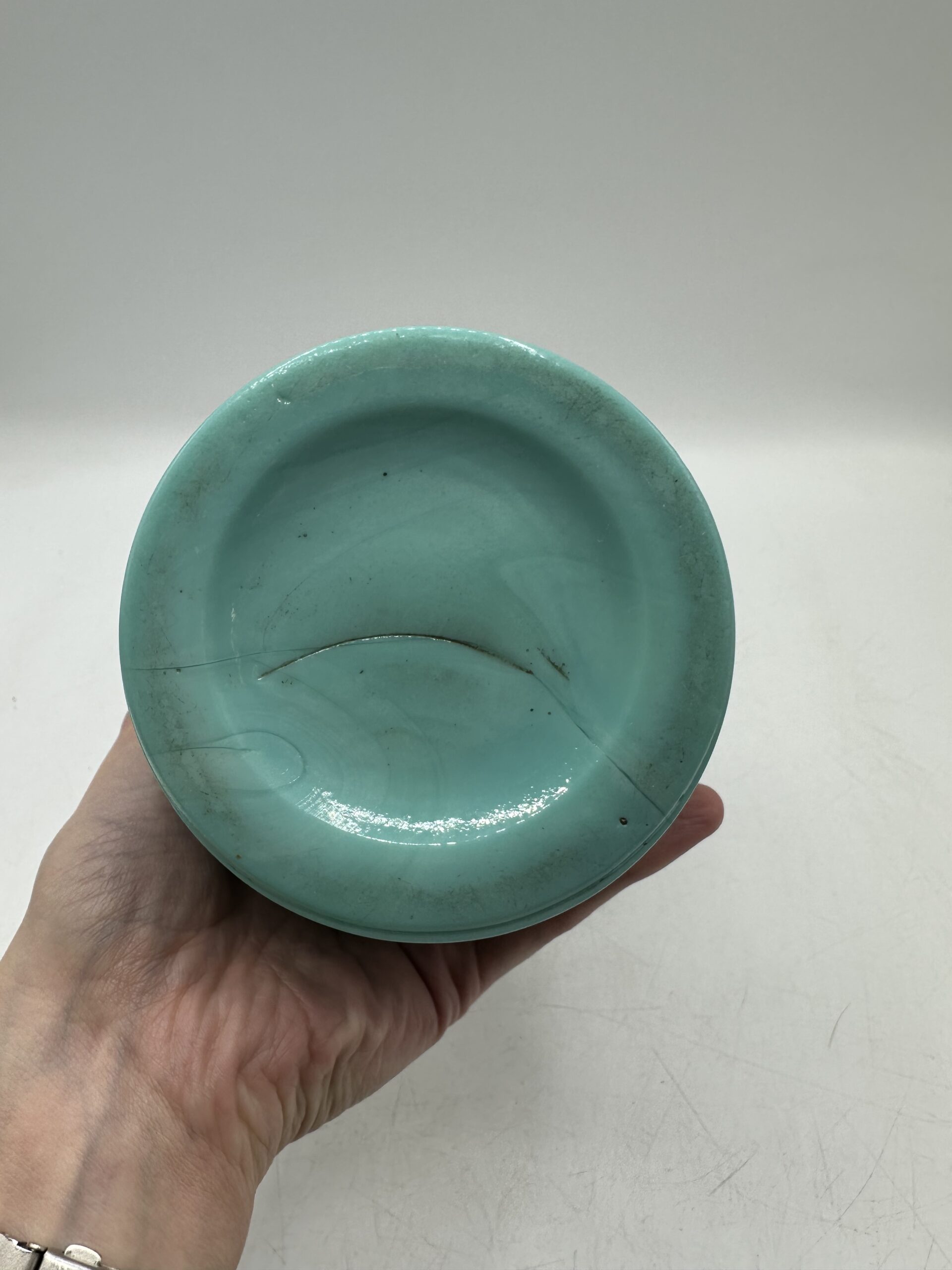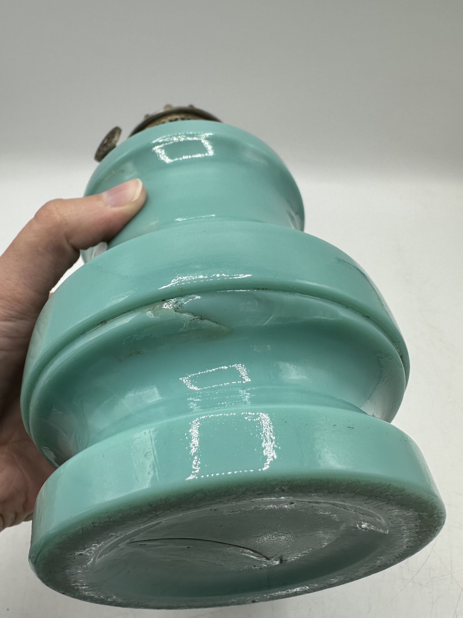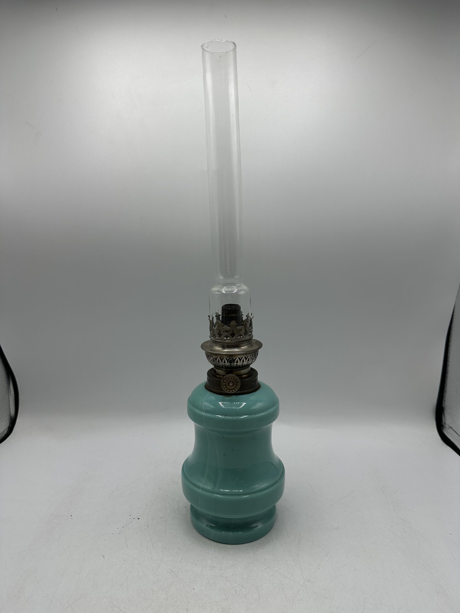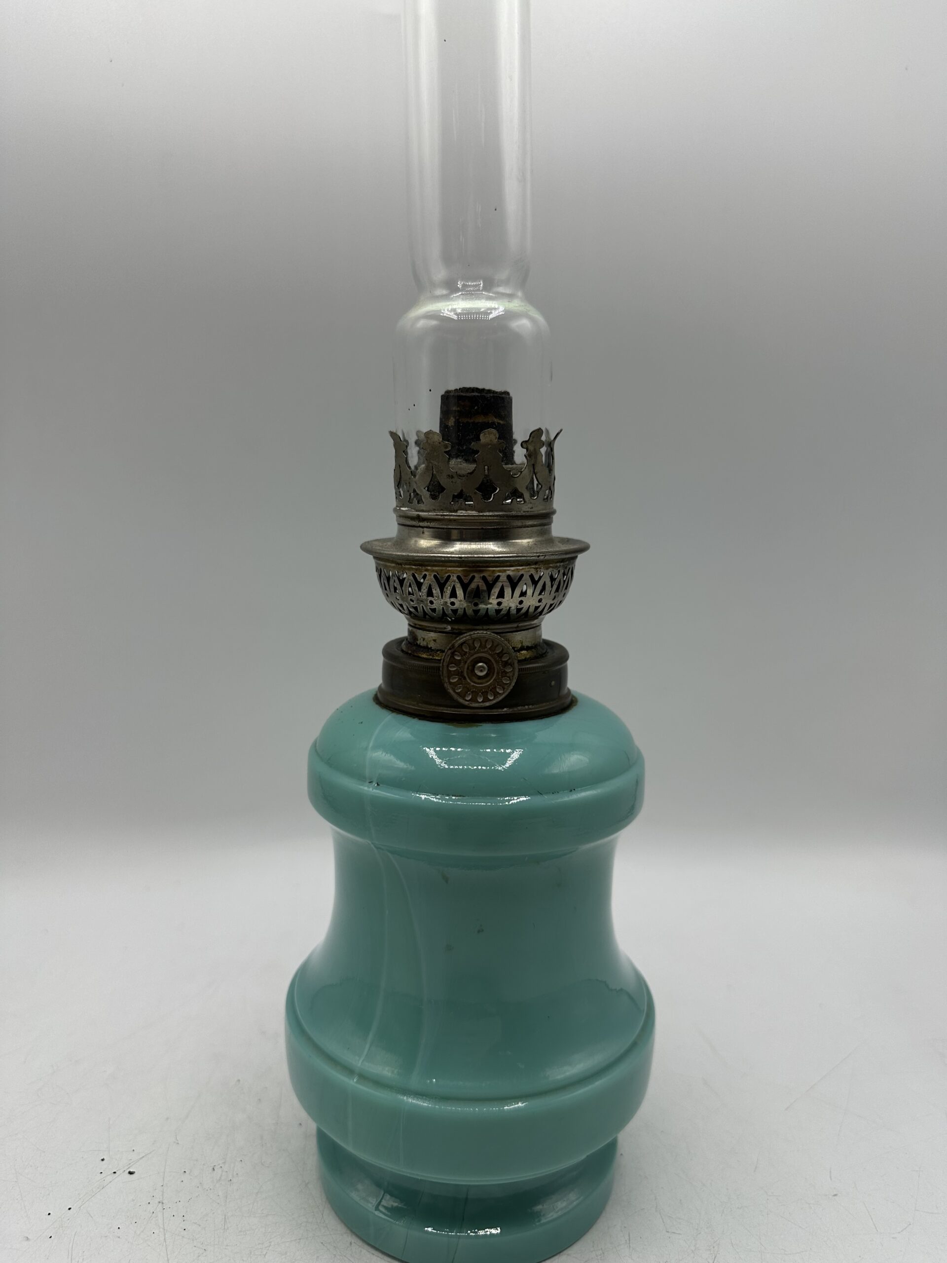 Son pied bleu/vert en opalin ou en faïence lui confère une allure douce et élégante, typique des lampes du XIXe et du début du XXe siècle.