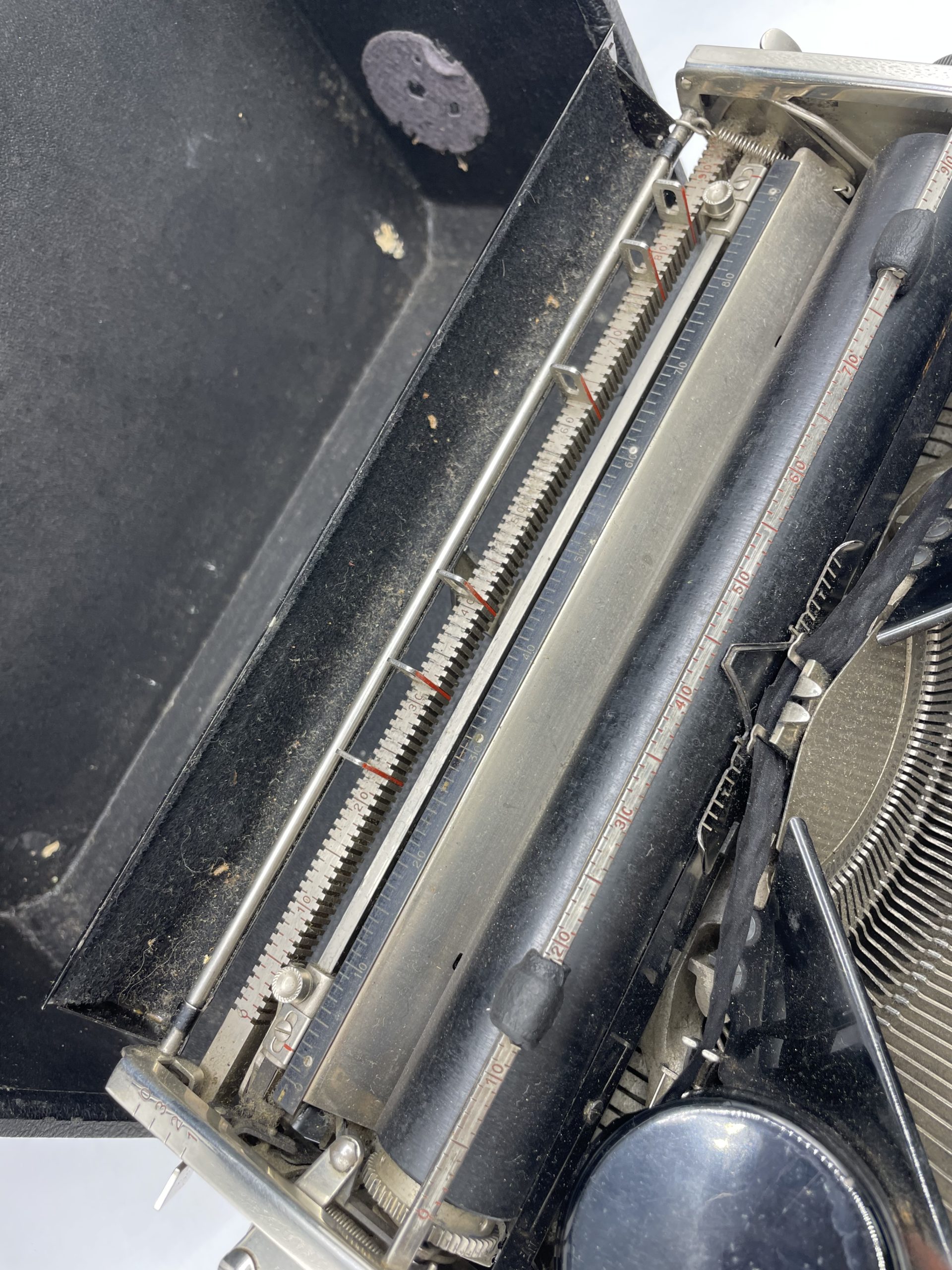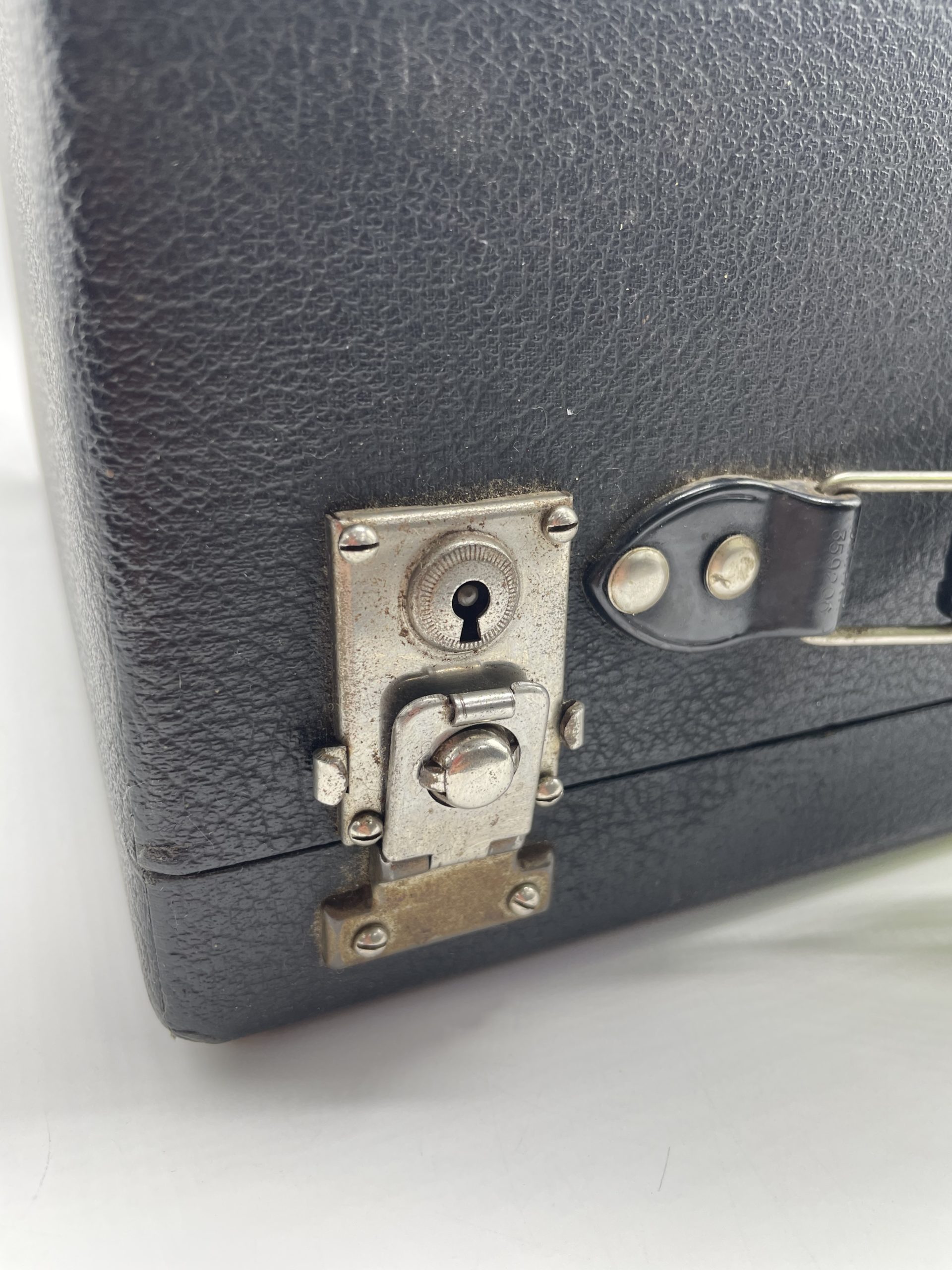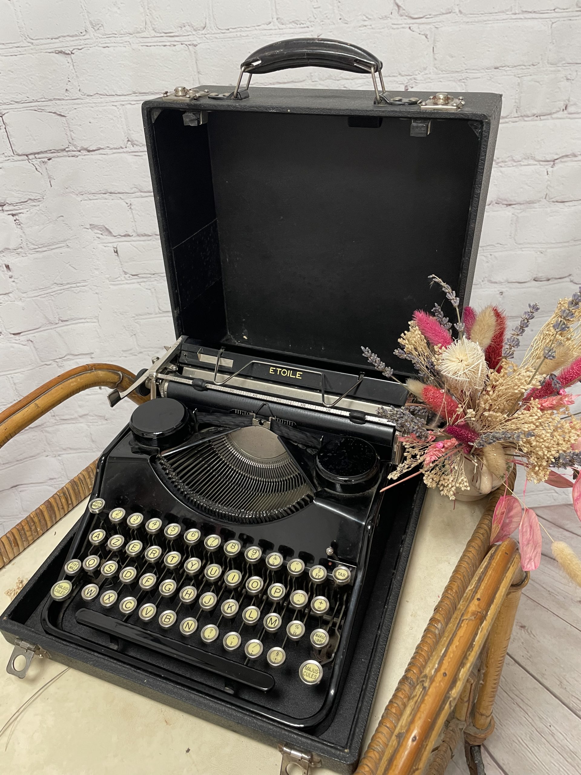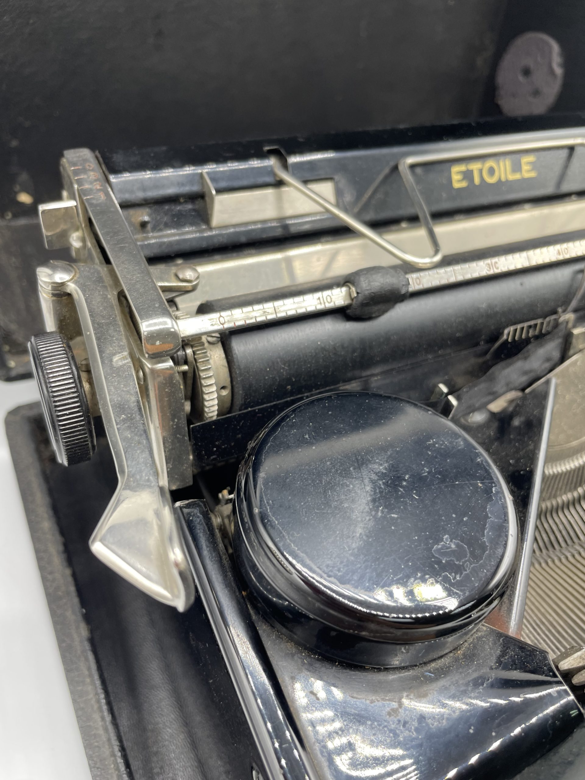 Amoureux d’objets vintage, vous ne pourrez passer à côté de cette sublime machine à écrire vintage. De la marque Etoile, la machine à écrire date des années 30 et c’est plus précisément un modèle de 1936. De fabrication suisse, la machine de couleur noire est en bon état général et en état de marche mais quelques touches ont du mal à remonter après la saisie de texte mais rien de bien méchant. Fournie avec sa valise de transport d’origine, la machine est un petit bijou vintage à collectionner !