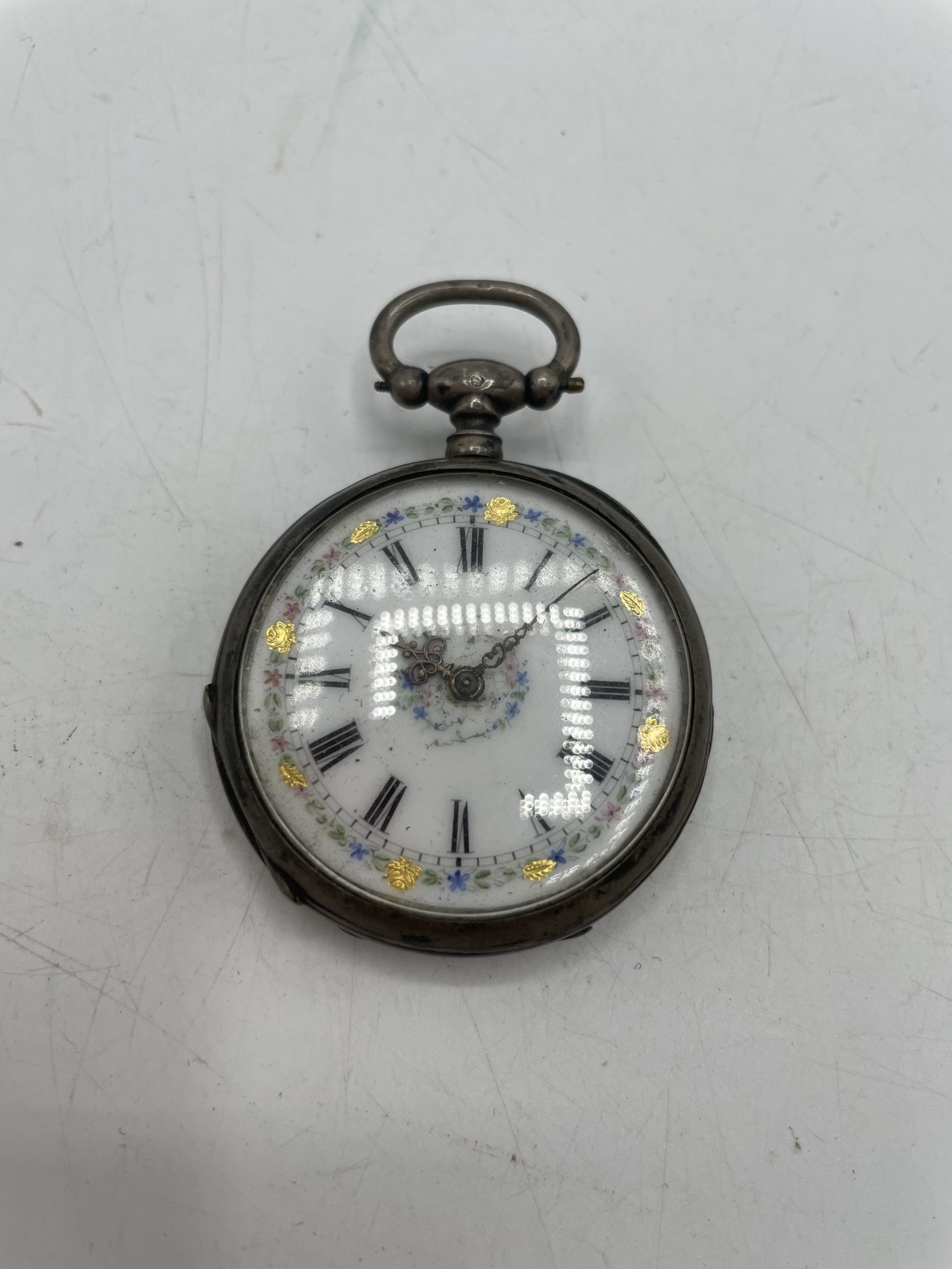 Le cadran est décoré d’une frise de petites fleurs roses, vertes et bleues. On retrouve aussi des détails dorés ainsi que 2 poinçons au niveau de la anse de la montre à gousset.