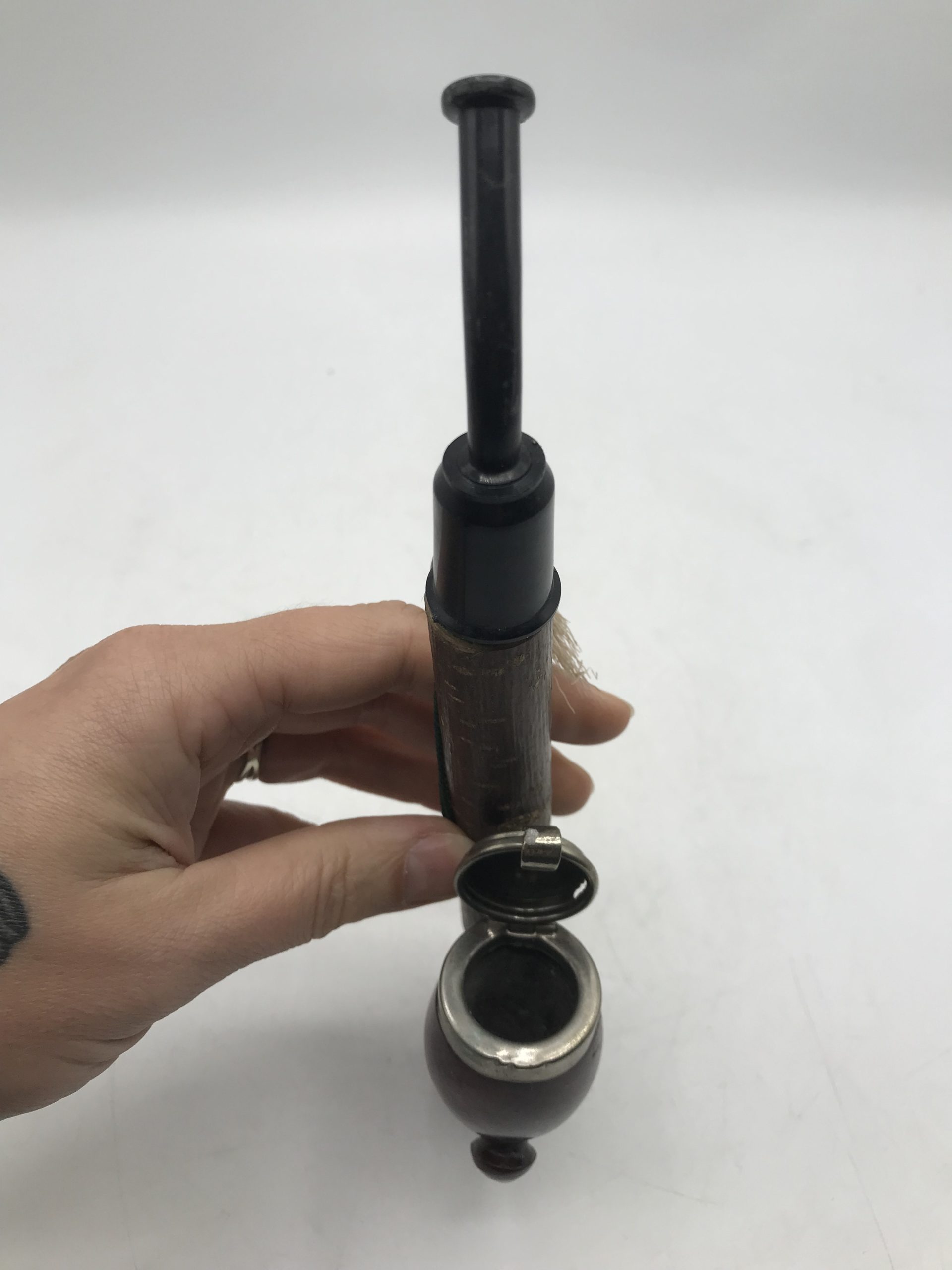 Avis aux collectionneurs ou amateurs de pipes du monde. Cette pipe d’origine Allemande de 1914-1918 ne manque pas de charme, ni de caractère. Elle à une belle taille 27 cm de hauteur. Une belle pièce dans une collection ou comme déco pour une note d’antan de vintage, d’histoire. On est loin de nos actuelles vaporettes sans charme.