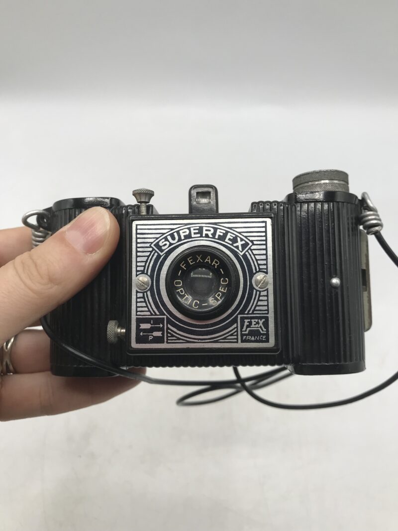 Appareil photo Superflex vintage. Petit appareil photo ancien il est noté Superflex FEX France à l’avant. Et à l’arrière PAT. 58375. Il est dans son jus, un joli objet ancien qui viendra faire le bonheur d’un collectionneur. Il est accompagné de sa pochette d’origine en cuir avec noté FEX. La pochette est de couleur marron foncée, elle porte des marques d’usure du au temps. Un joli clin d’œil au temps qui passe et a l’évolution des appareils de photographie. Amoureux d’histoire il est pour vous.