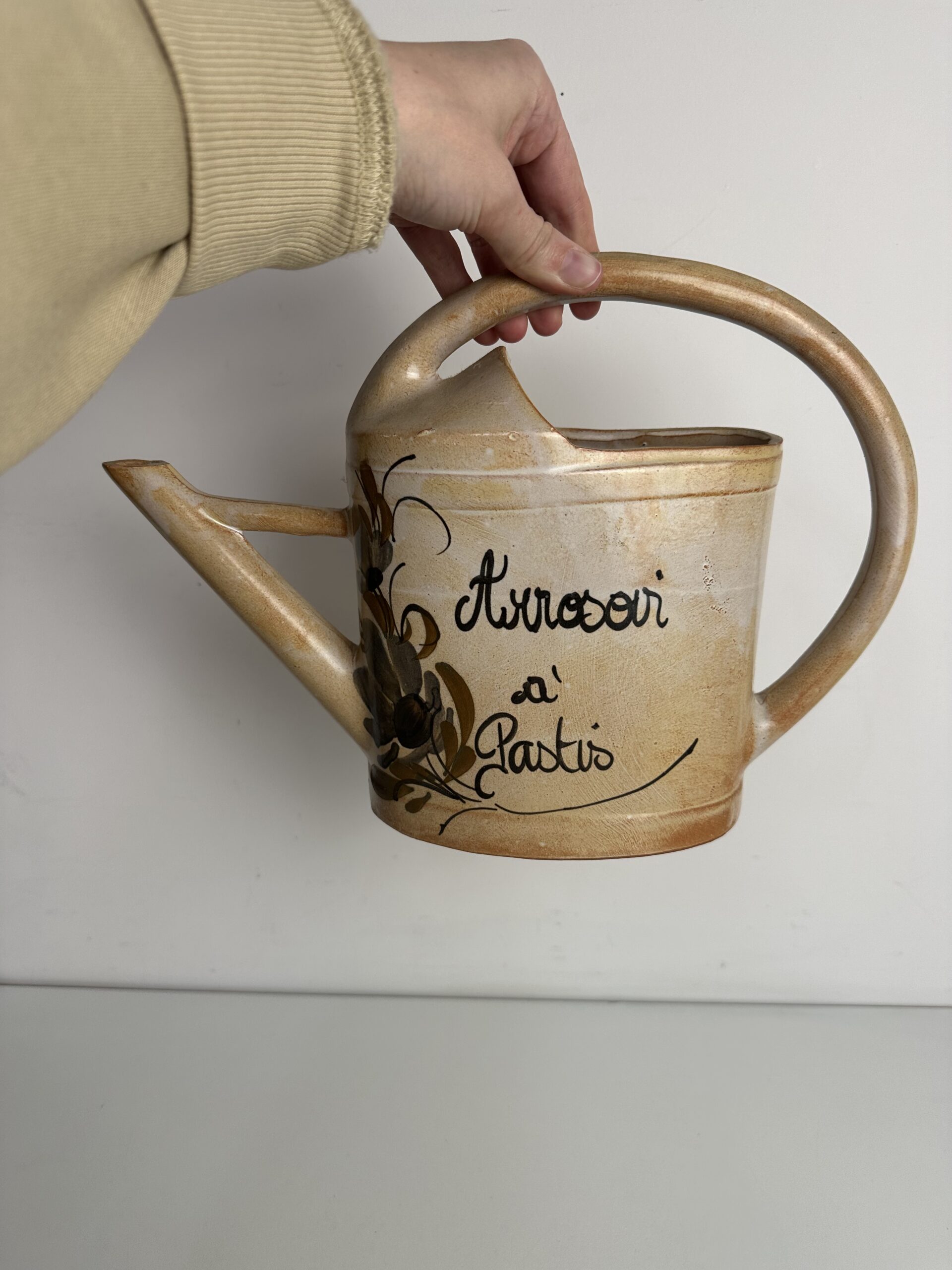 Cet arrosoir à pastis vintage présente un joli motif floral peint à la main, qui lui donne un caractère artisanal. Une belle trouvaille de brocante en ligne pour un esprit sud, convivial et authentique.