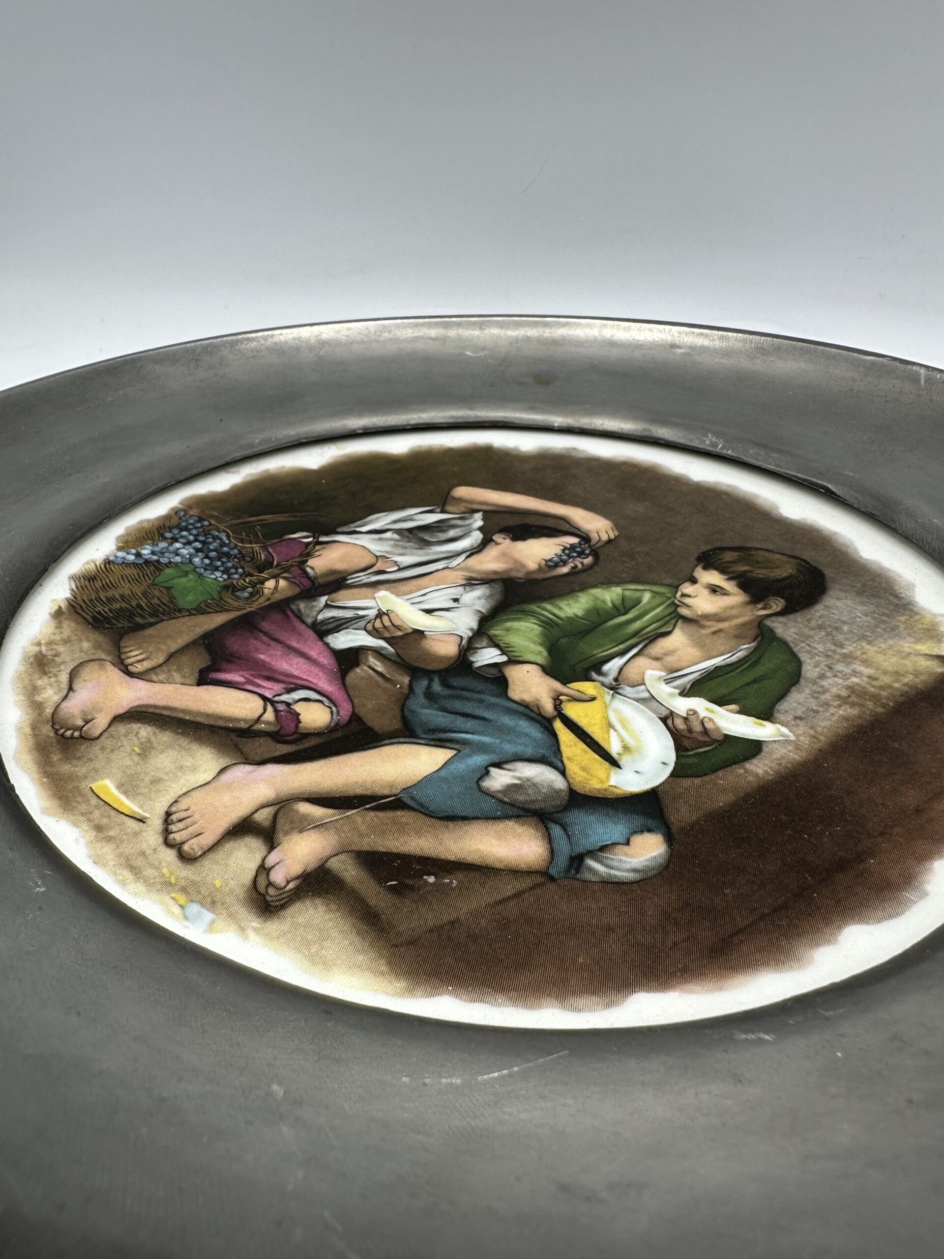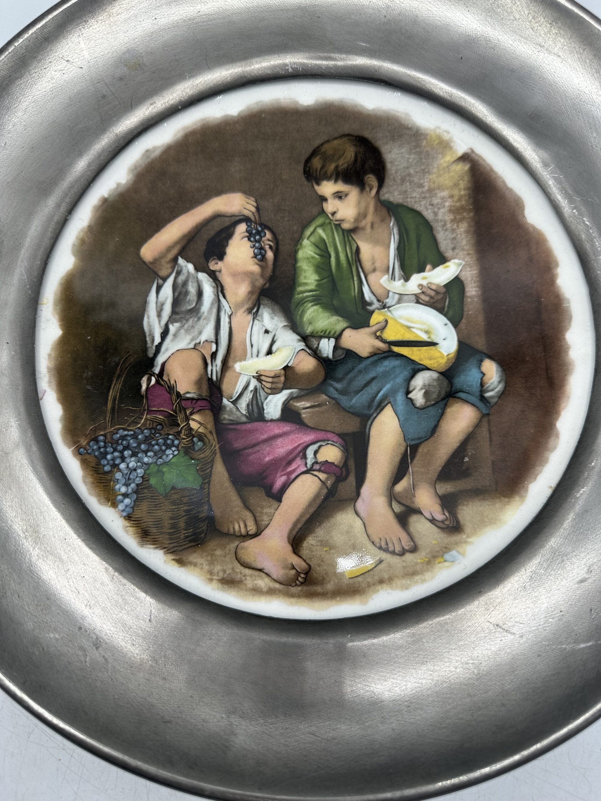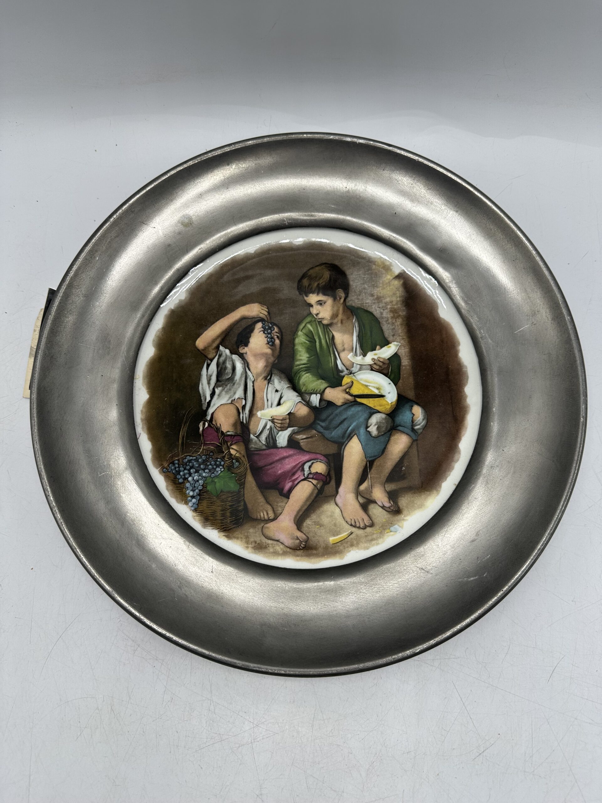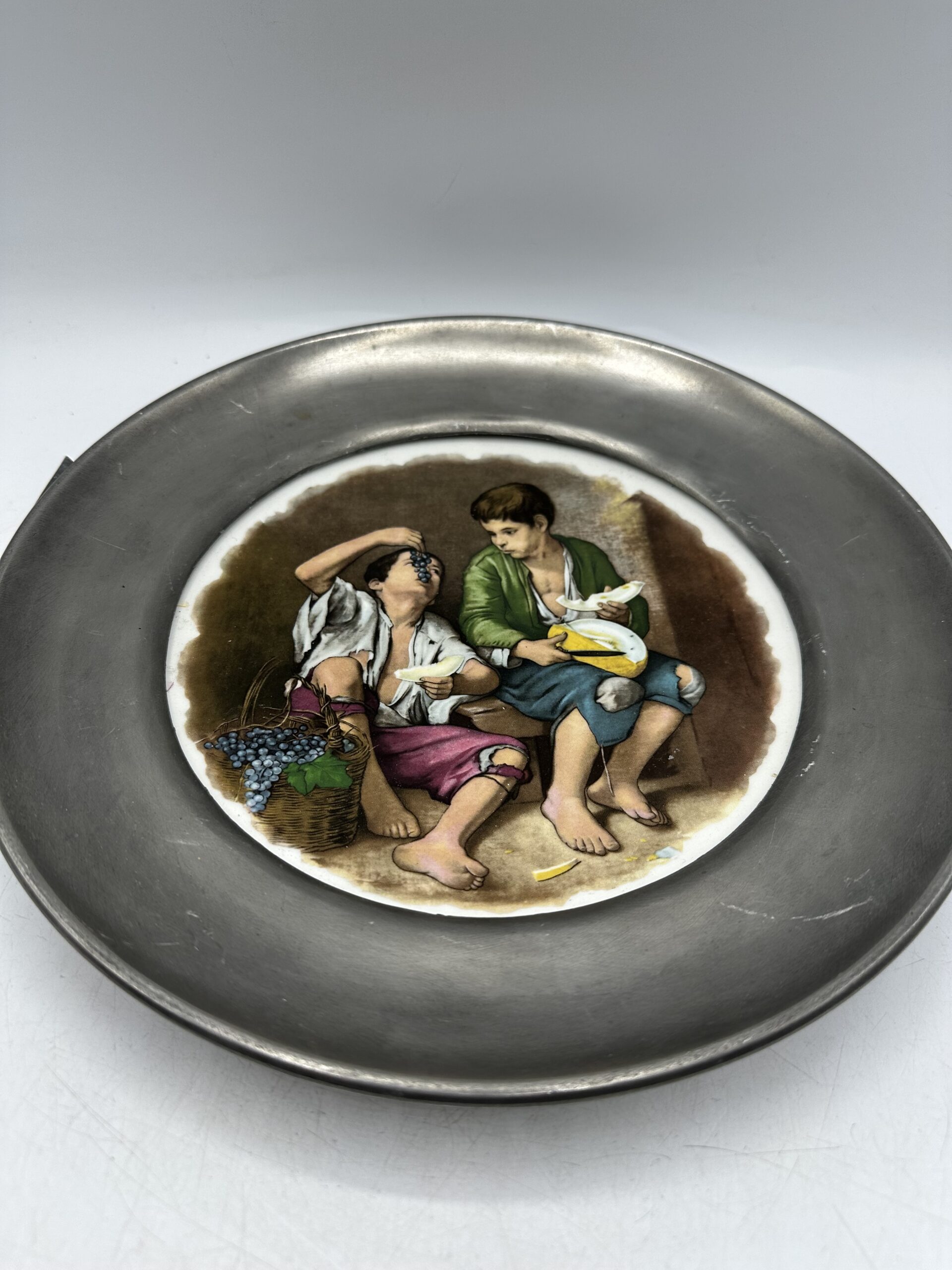 Au centre de l’assiette on y voit deux enfants manger du raison en se regardant. Cette assiette ancienne est une assiette décorative.