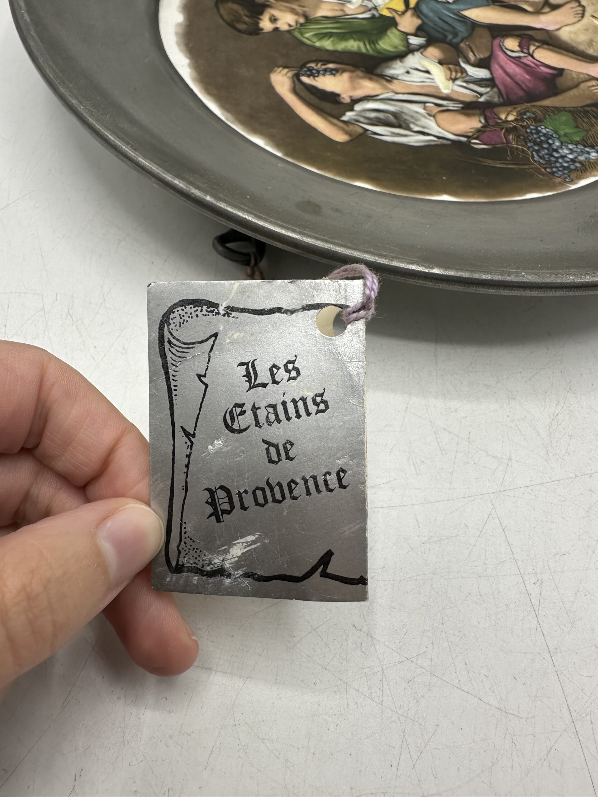 L’assiette est en très bon état. Le pourtour en étain a quelques traces d’usures. (voir les photos). Il y a toujours l’étique « les étains de Provence »