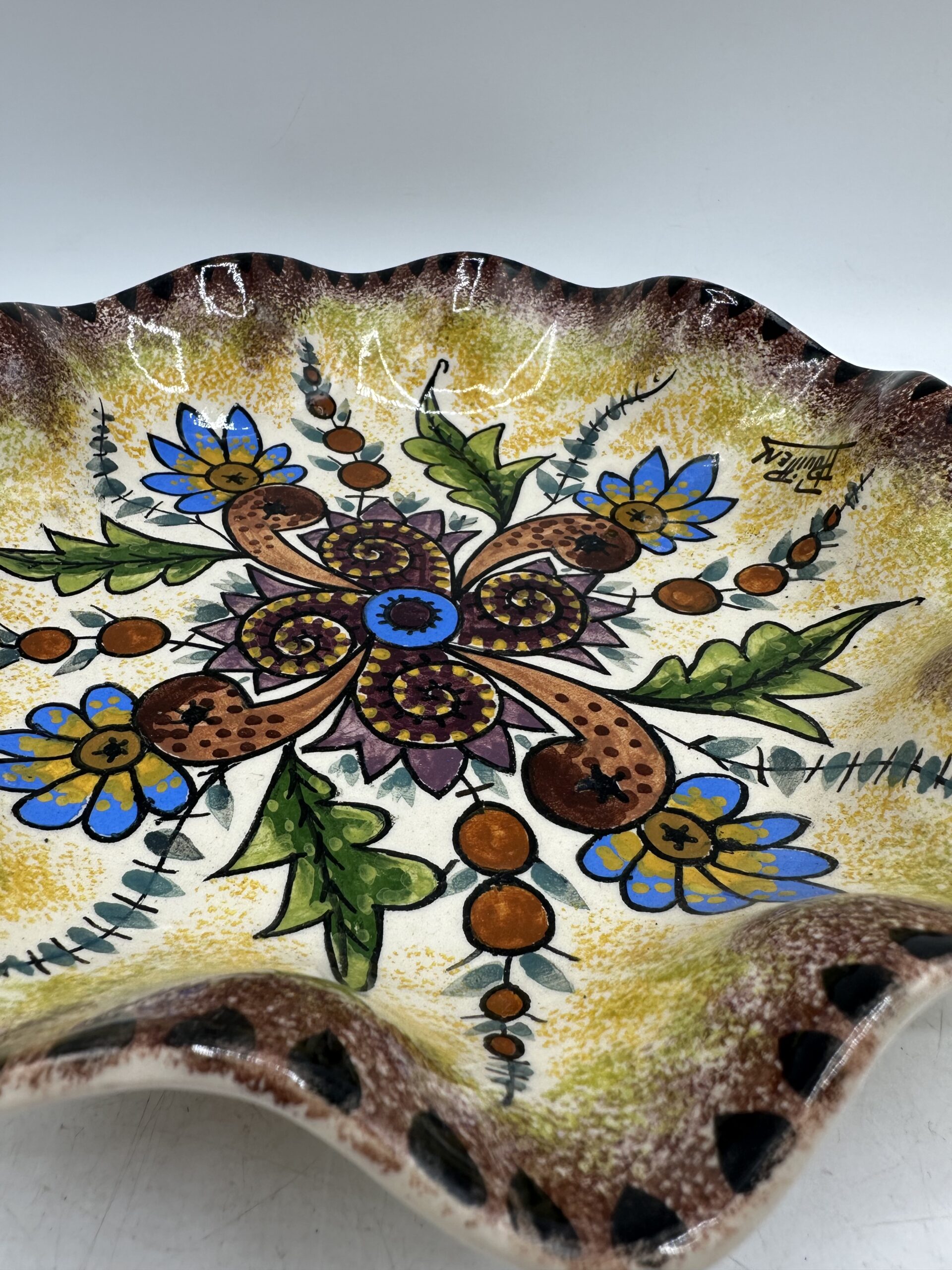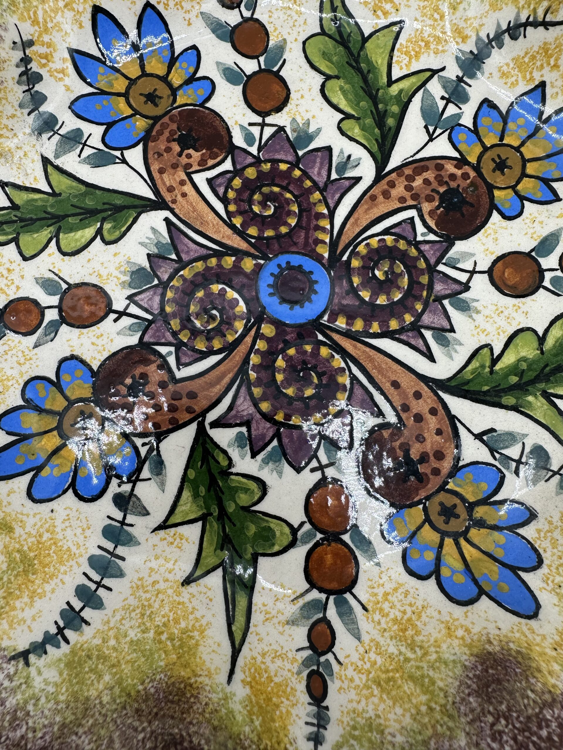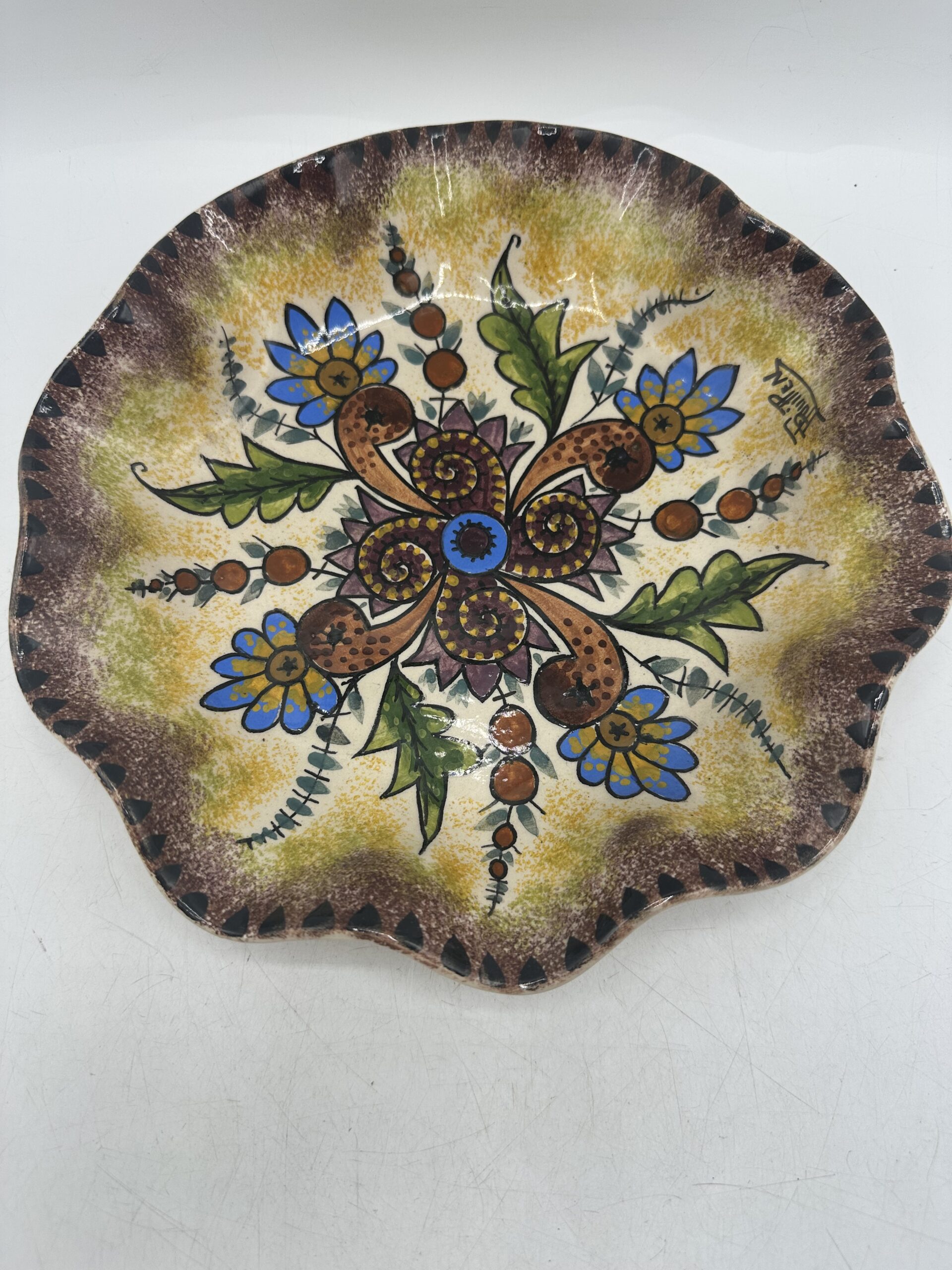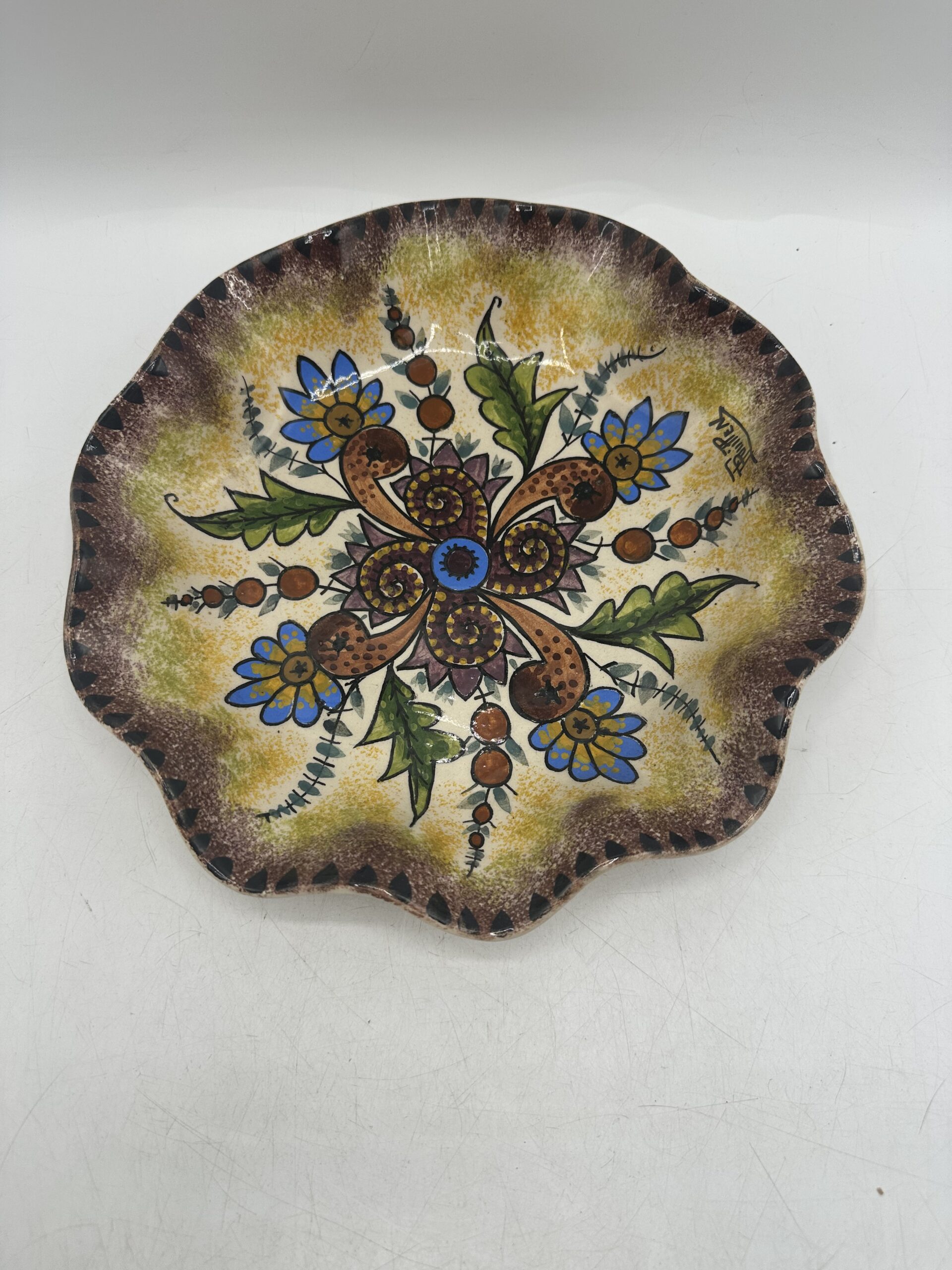 À mi-chemin entre l’assiette décorative et la petite coupe. Elle peut être utilisée en décoration murale grâce à son accroche intégrée ou posée sur un meuble pour mettre en valeur son motif richement coloré.