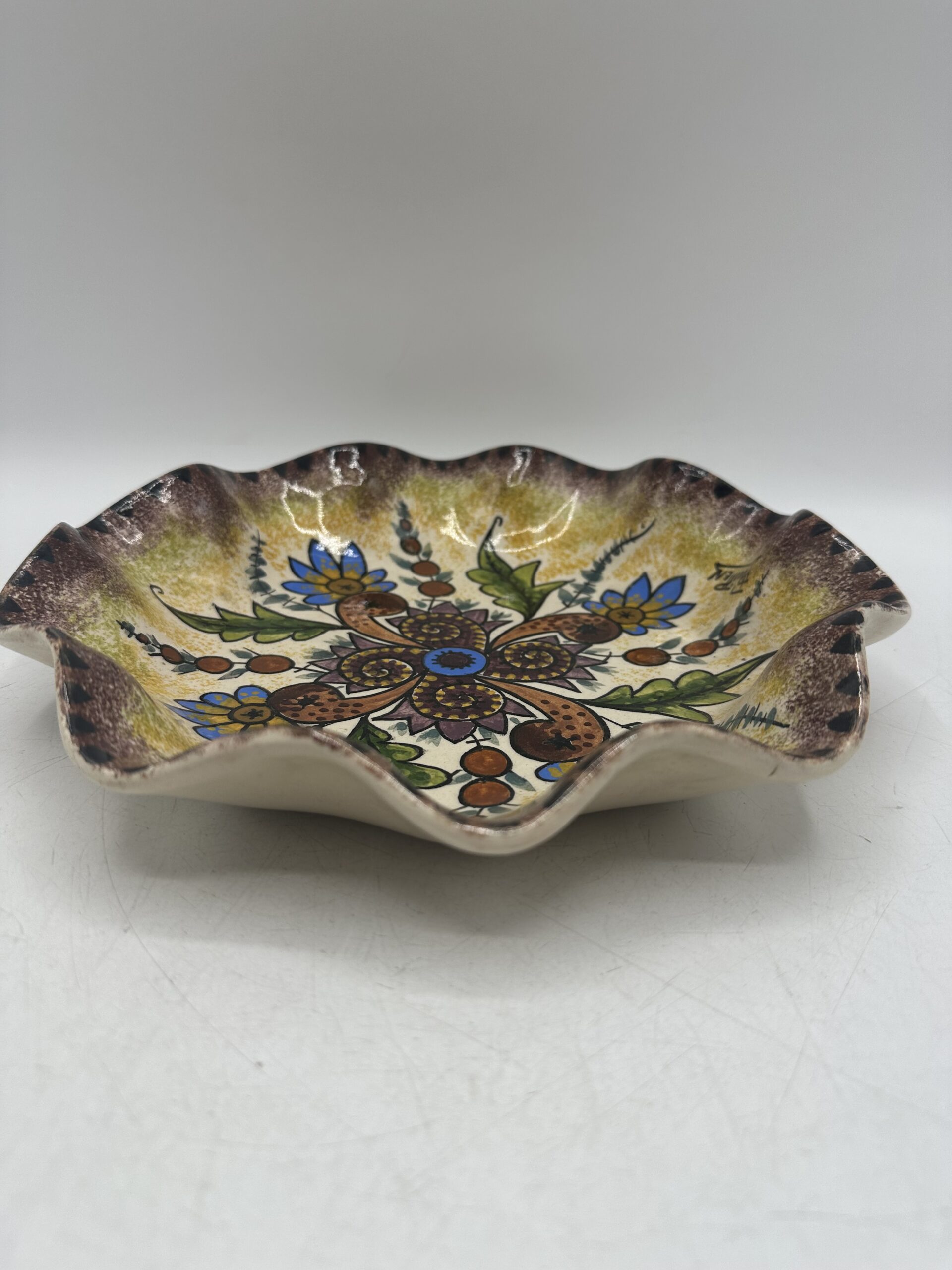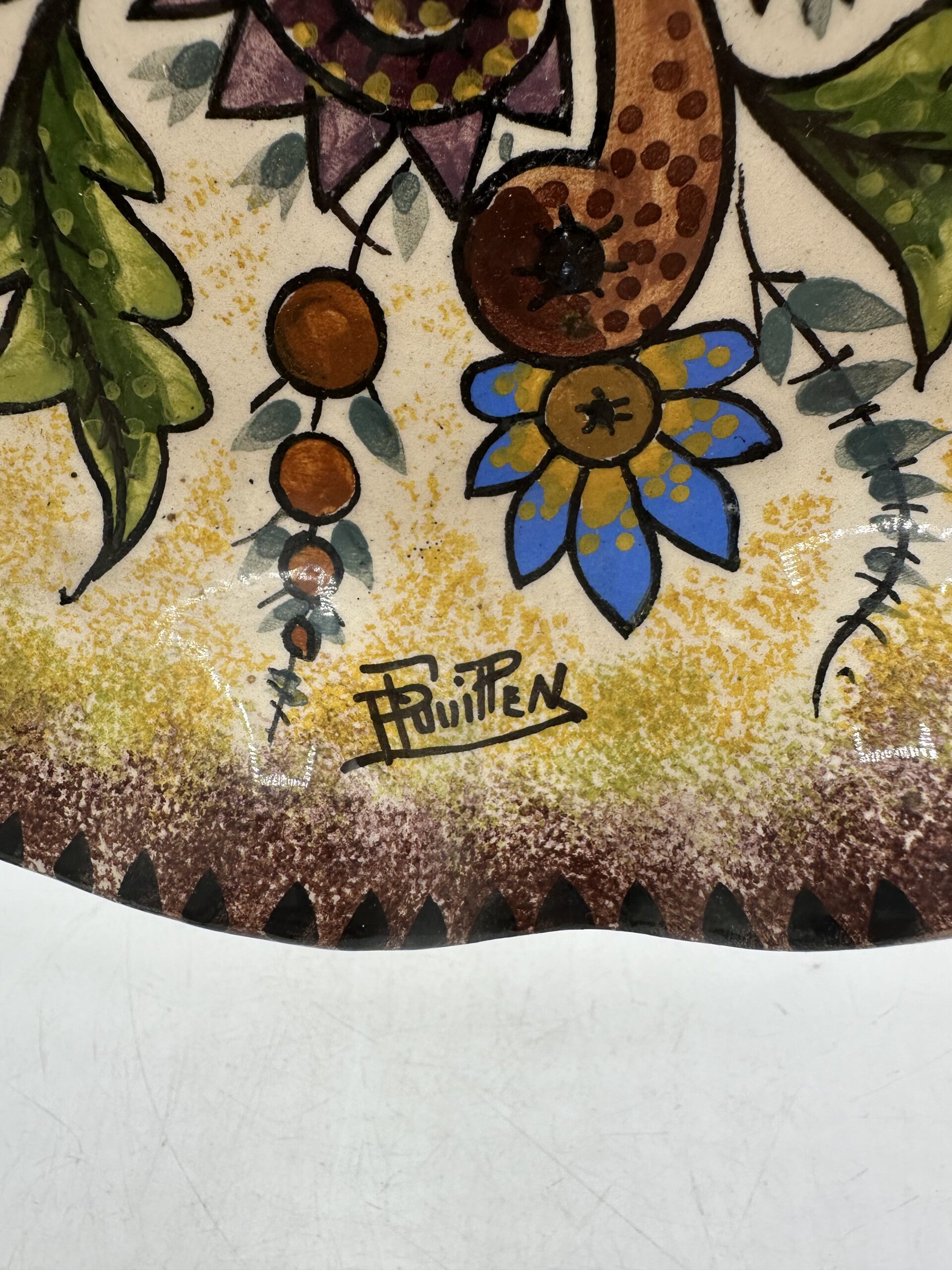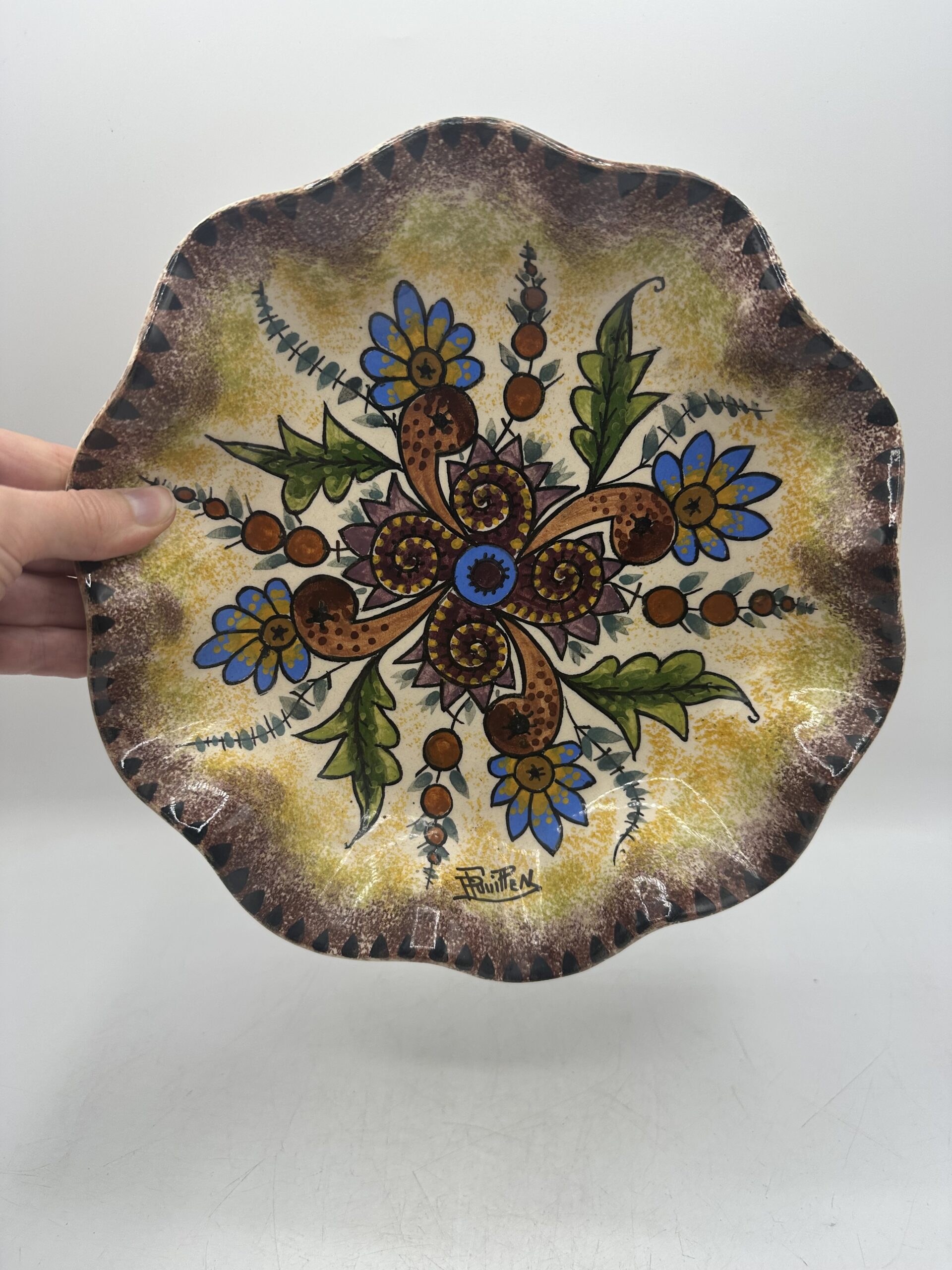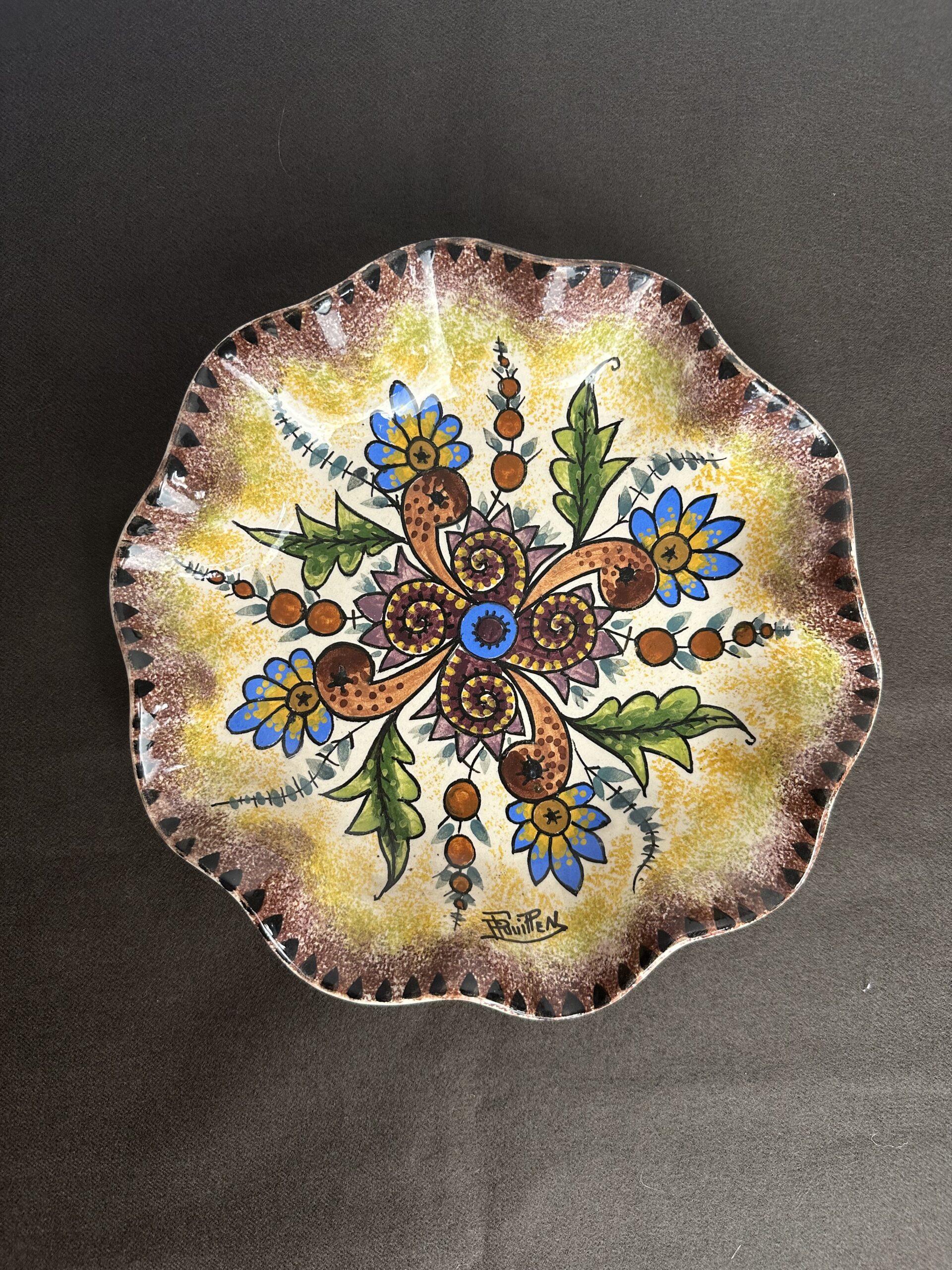 Cette pièce Assiette ou coupe Quimper P. Fouillen est un bel objet de collection, idéal pour enrichir une décoration vintage, rustique ou inspirée de l’art breton traditionnel.