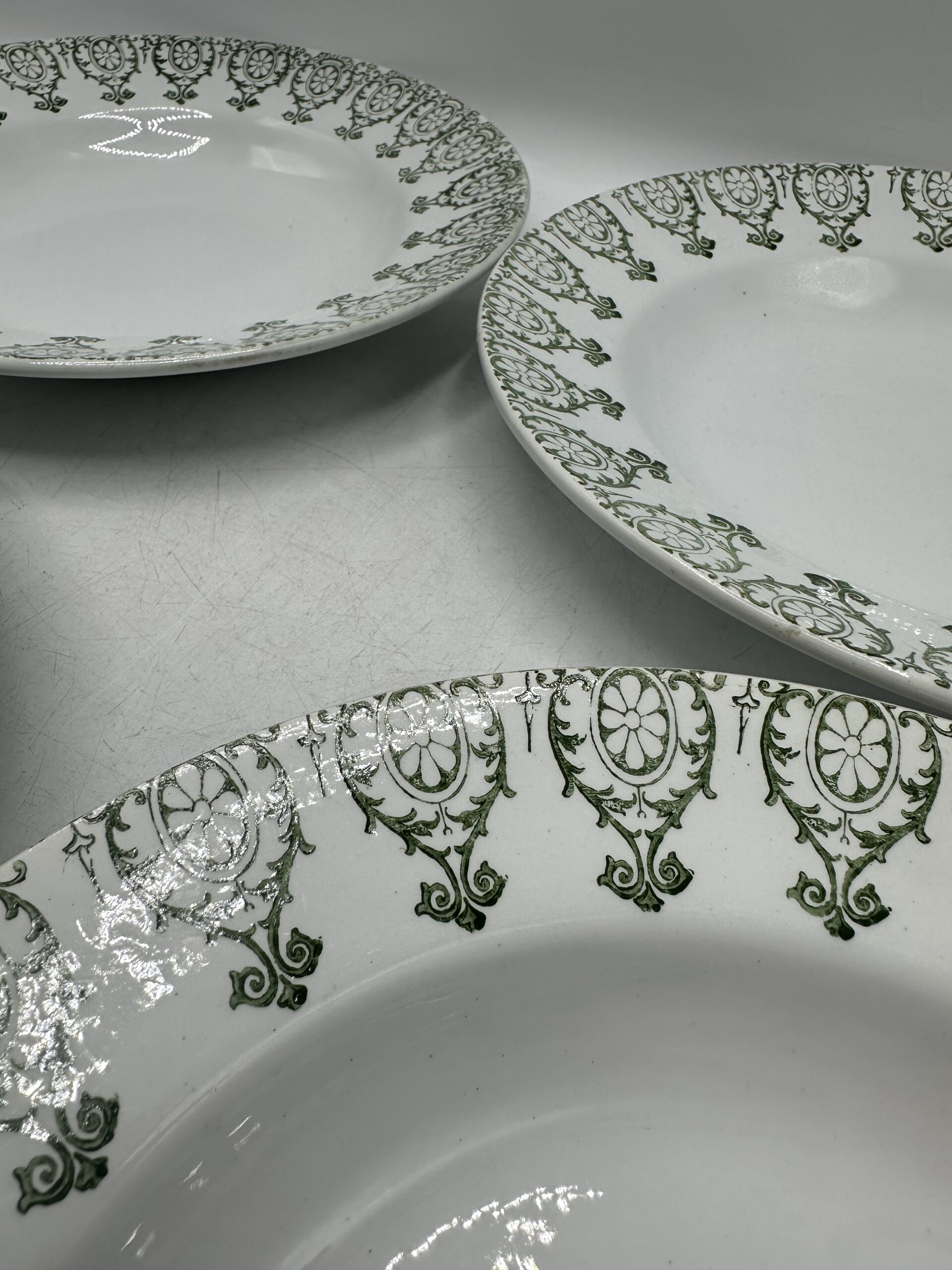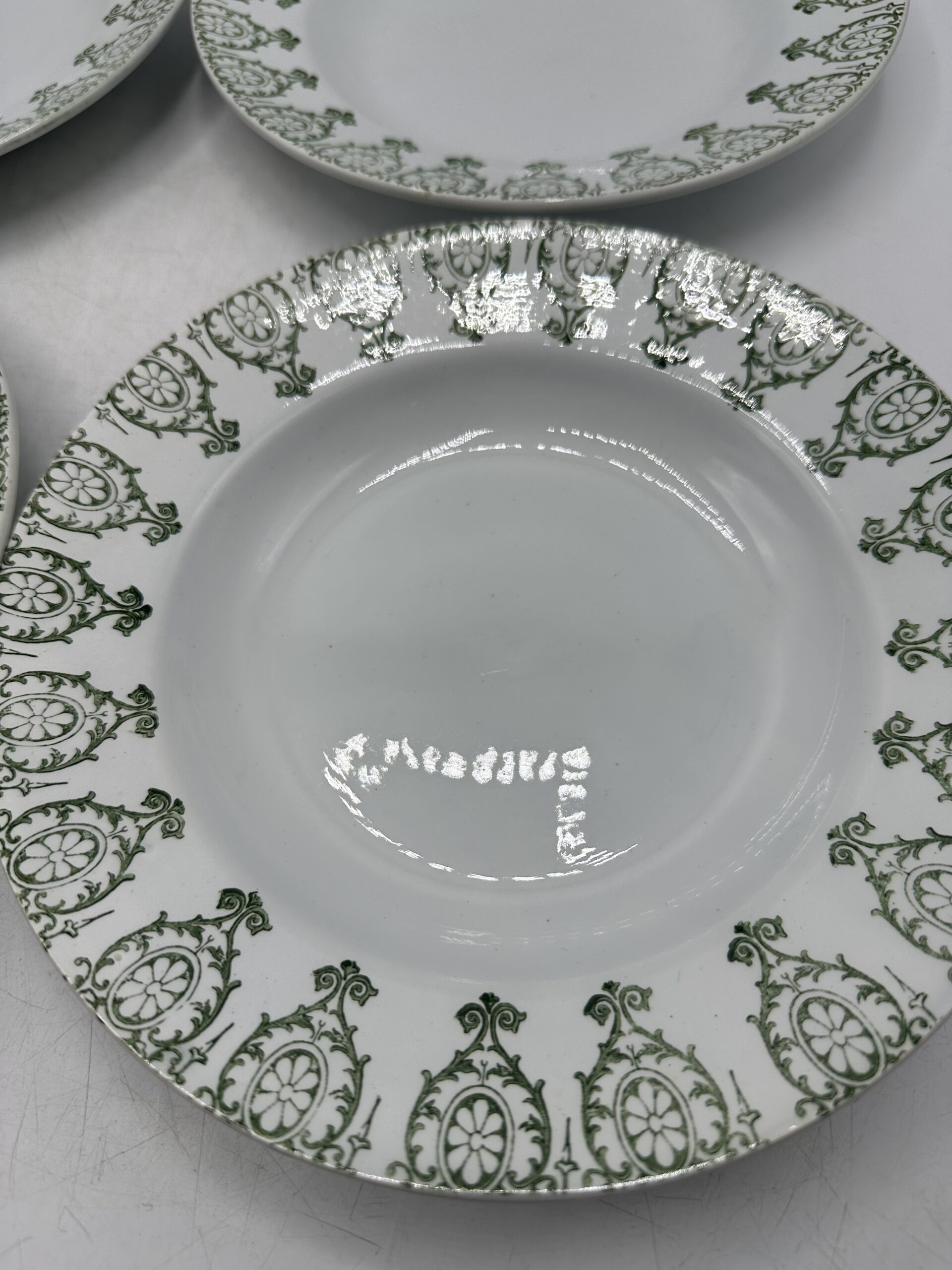 Les assiettes sont en très bon état. Les motifs sont très légèrement usés. Estampillées St Amand, ces assiettes ont un décor sur le pourtour, dans un joli coloris vert.