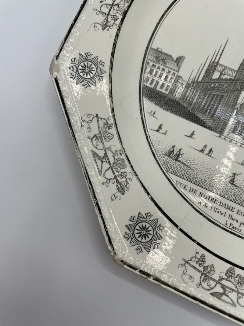 Lot de assiettes en porcelaine de forme hexagonales représentant un gravure de Notre Dame de la Garde et du Palais du Corps Législatif. Quelques impacts et traces d’usure, jolis signes du temps passé. La gravure du Palais du Corps Législatif est un peu délavée. Un joli duo à collectionner !