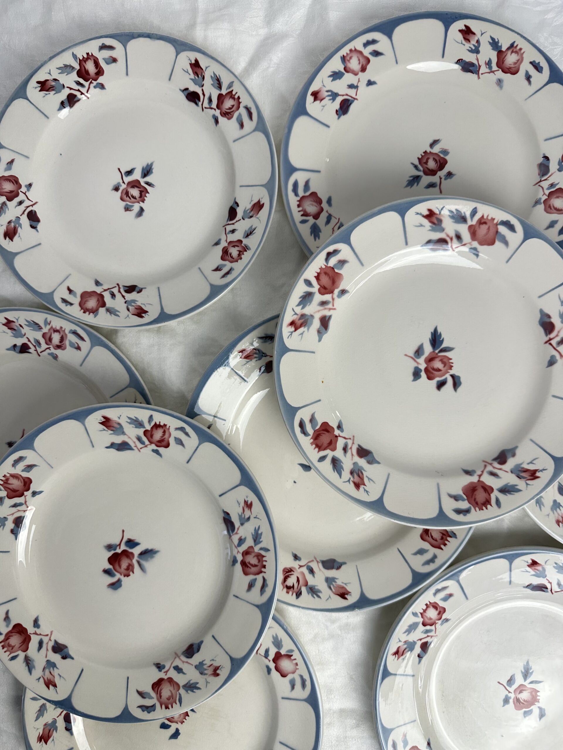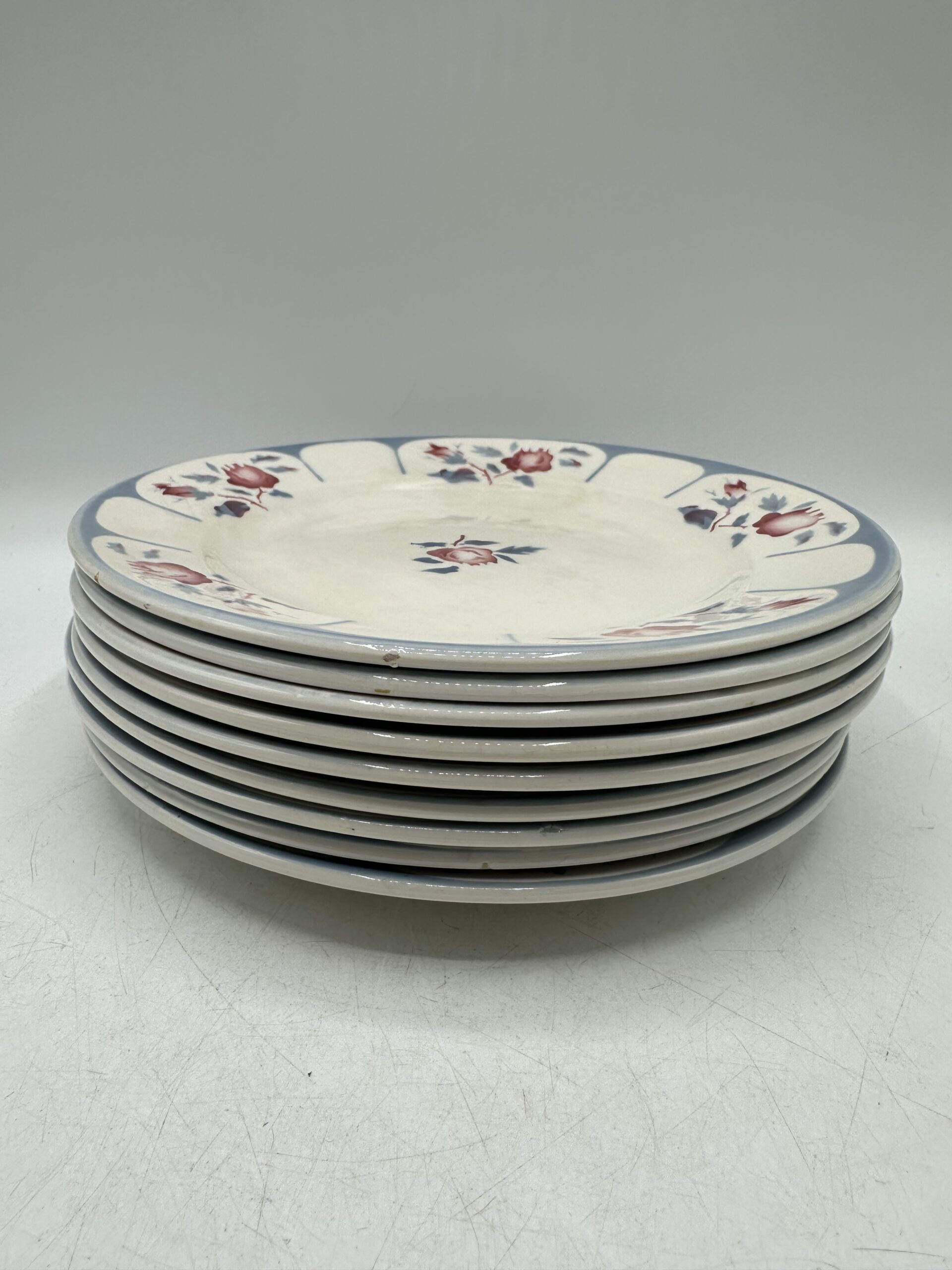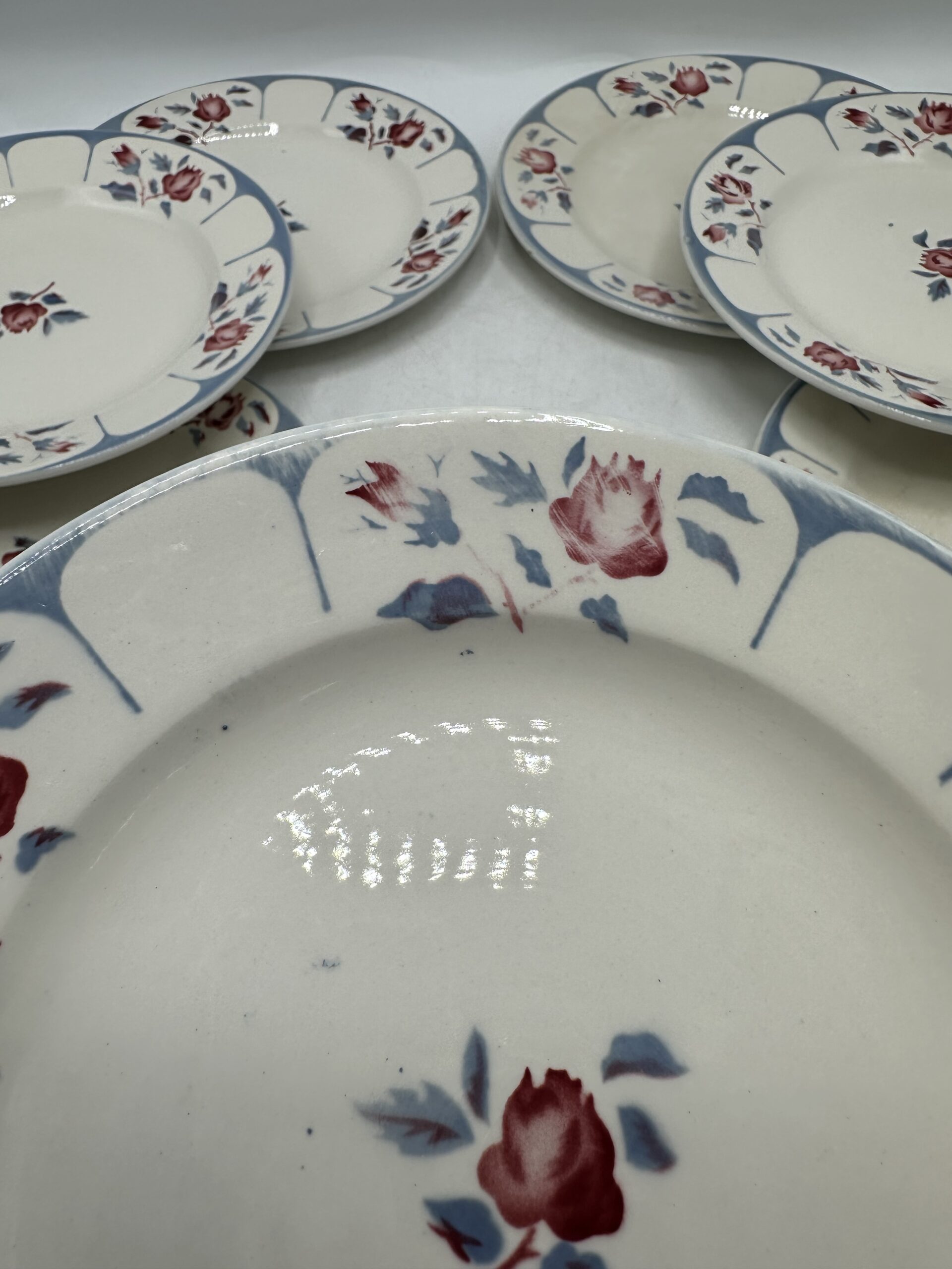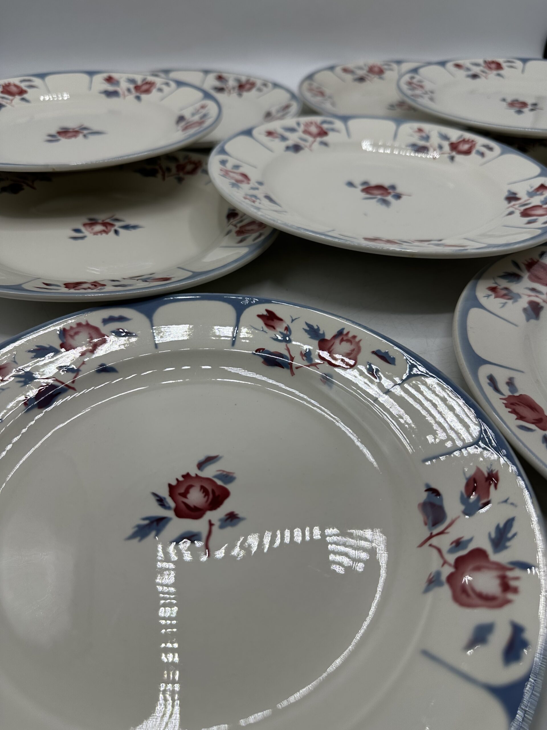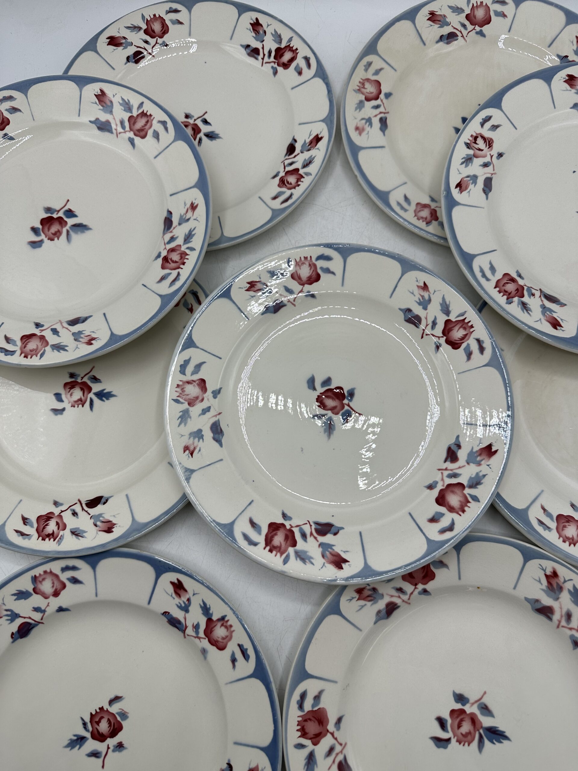 Il y a 9 assiettes à dessert au total. Elles sont en bon état généal. Une assiette est légèrement patinée. Et sur quelques assiettes il y a de tout petits éclats sur les bords. (voir les photos)