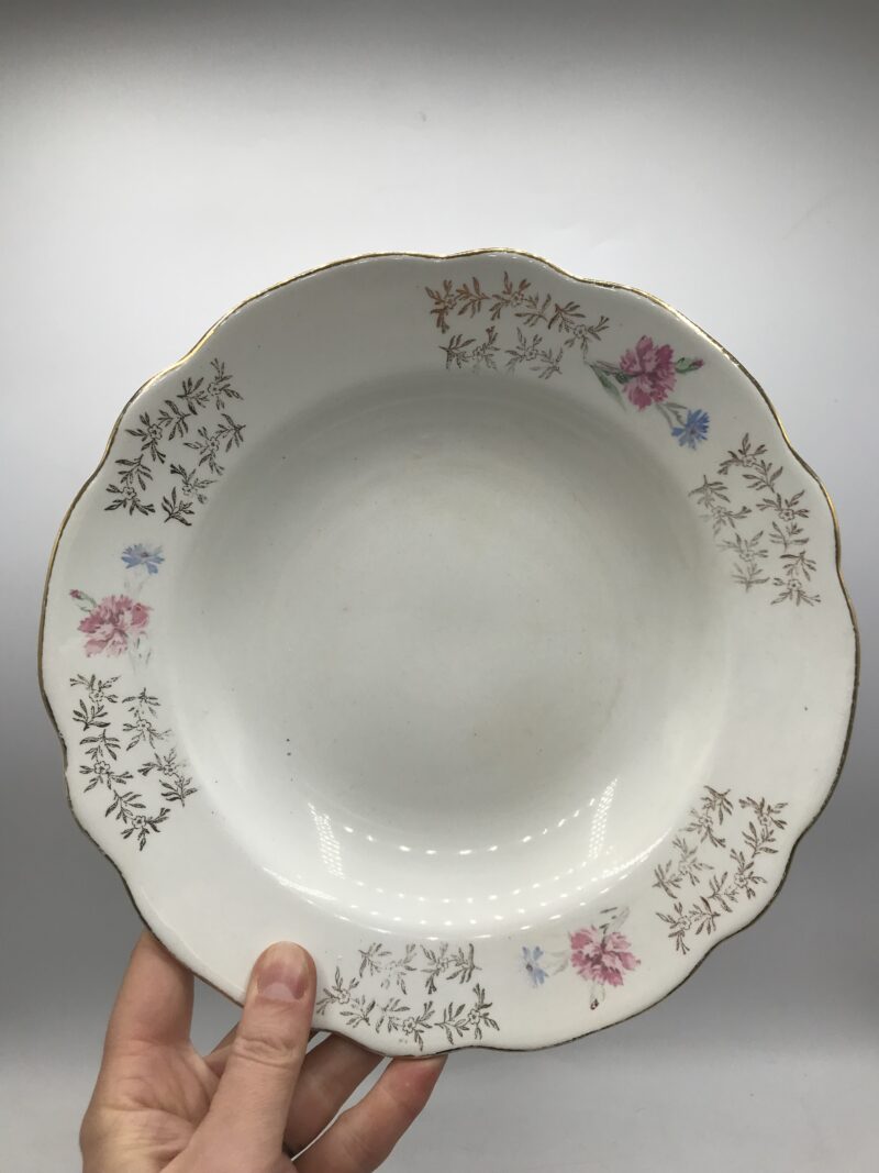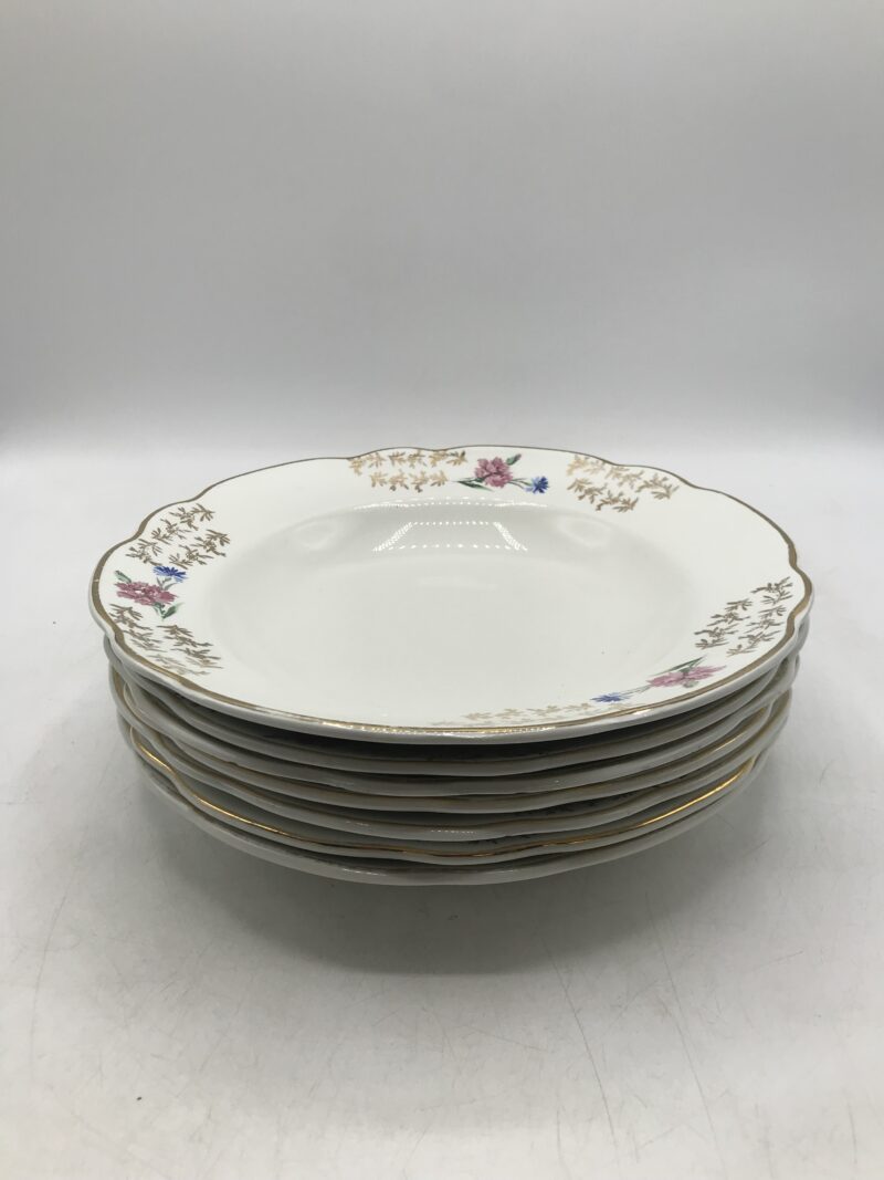 Lot 7 assiettes Sarreguemines BEARN. Amis chineurs, amis chineuses voici des assiettes creuses signées Sarreguemines. Elles sont issues de la collection BEARN. Les assiettes ont un diamètre de 24 cm pour une hauteur de 4 cm. Elles sont de couleur blanche avec de jolies motifs de fleurs avec des couleurs douces. Le tout parsemé de détails en dorure. Les assiettes présentent des marque d’usure sur les couleurs et des craquelures dans la céramique. Une des assiettes porte un éclat à l’arrière (cf photos). Un service qui ne demande qu’a retrouver les feux de la rampe. Il est prêt à recevoir vos amis pour de superbes repas.