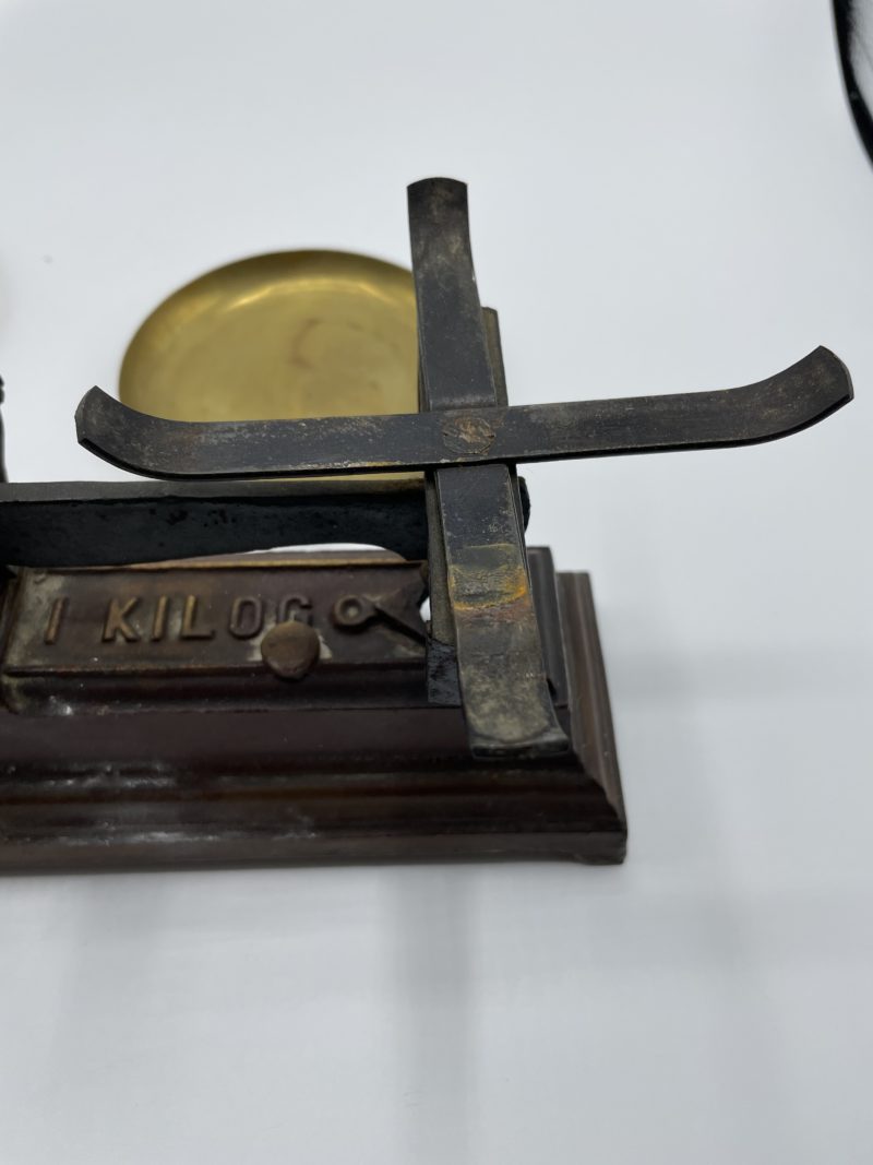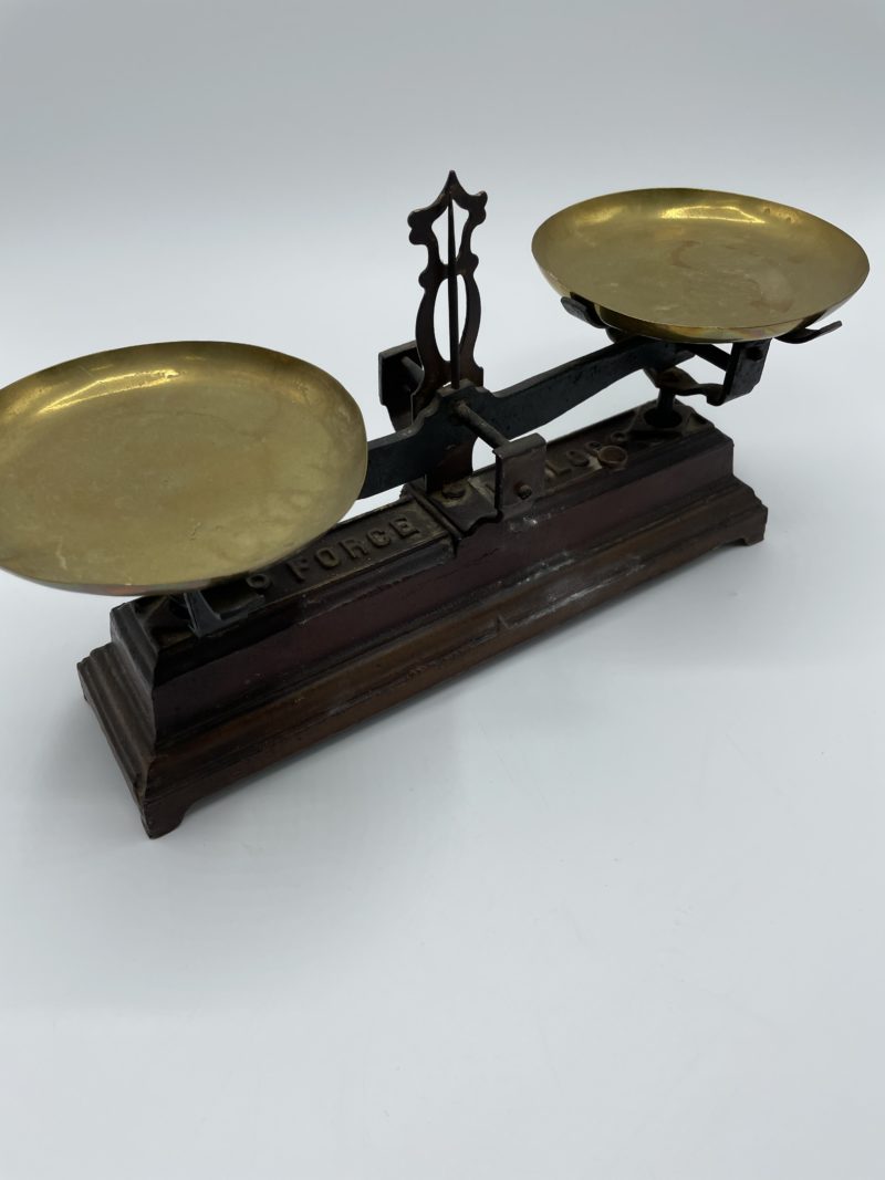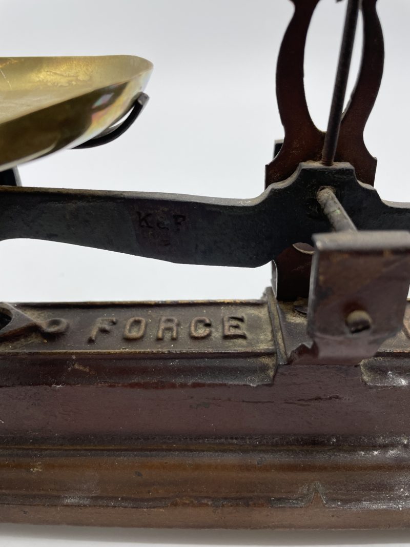 Cette balance vintage en fonte a une force de 1kg pour la pesée. Mécanique, elle fonctionne en posant un poids sur l’une des coupelles en laiton et l’objet dont on souhaite connaître le poids de l’autre côté. On peut y lire l’inscription K & F. Dans son état d’origine, cette balance vintage présente quelques traces d’usure (cf photos) jolies marques du temps passé. Une jolie balance qui fonctionne comme au premier jour et qui pourra faire un très bel objet déco vintage !