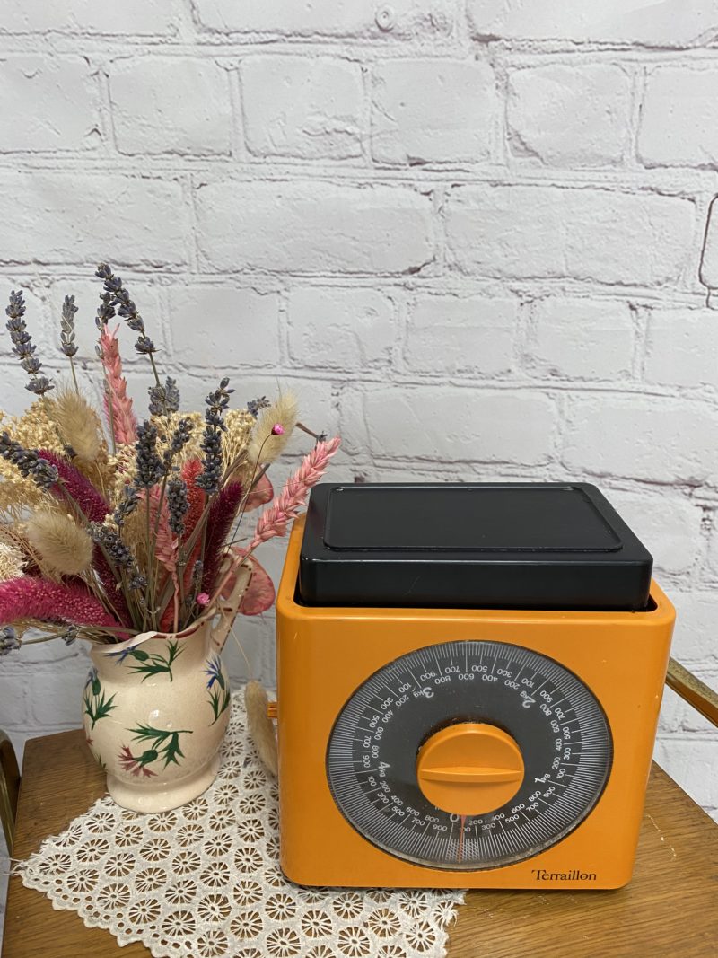 Amoureux ‘objets vintage, vous ne pourrez passer à côté de cette jolie balance Terraillon. De couleur orange, la balance est prévue pour une usage ménager avec un poids maximal de 5 kg et un minimum de 200g. Fonctionne bien. Vintage, un petit nettoyage sera à prévoir et il manque le couvercle en plastique rigide transparent. Une jolie balance pour la cuisine ou pour une déco à l’esprit rétro !