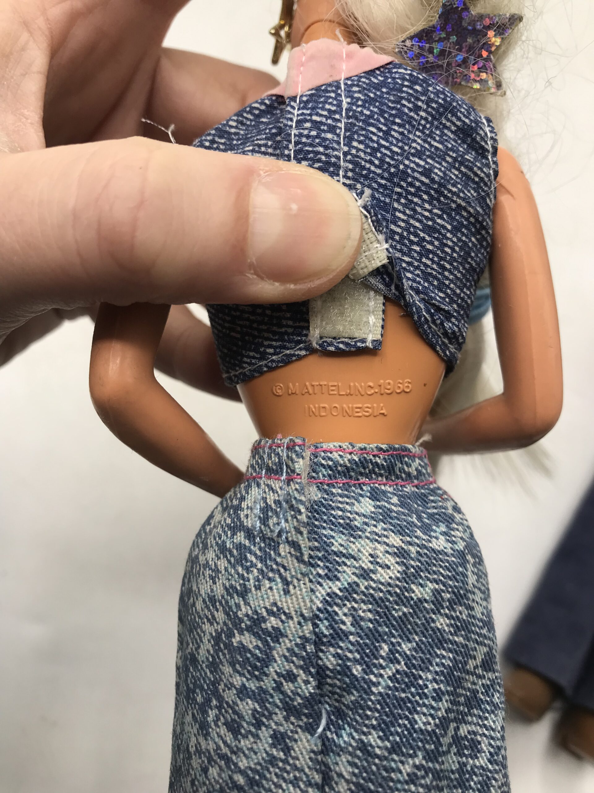 Alerte grosse pépite !!! Barbie et Ken années 60. Voici un trio des années 60. Nous avons une Barbie de 1966, elle a des cheveux long et blanc et une boucle d’oreille étoile. Elle est accompagnée de Ken mod hair qui a une petite moustache, il est de 1968. Pour les accompagner une poupée Bella mannequin de la même époque. Un lot parfait pour les collectionneurs de Barbie et surtout de Ken car eux se font plus rare. Les poupées sont dans un état correct, un bon nettoyage et brossage de cheveux les remettront sur pied. Laissez place à vos souvenirs d’enfance, il est temps de jouer !!!!!