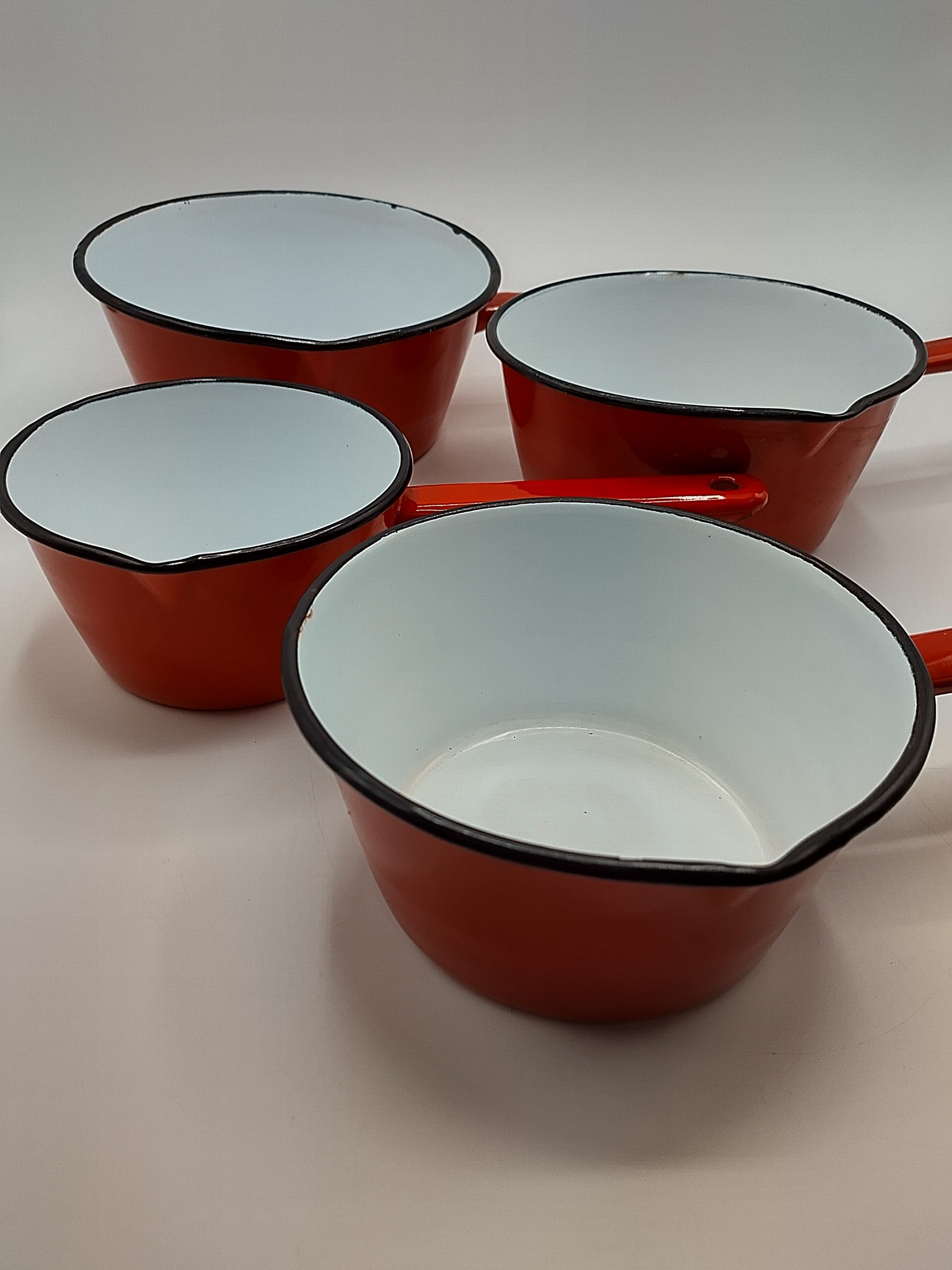 Batterie de 4 casseroles vintage en métal émaillé rouge