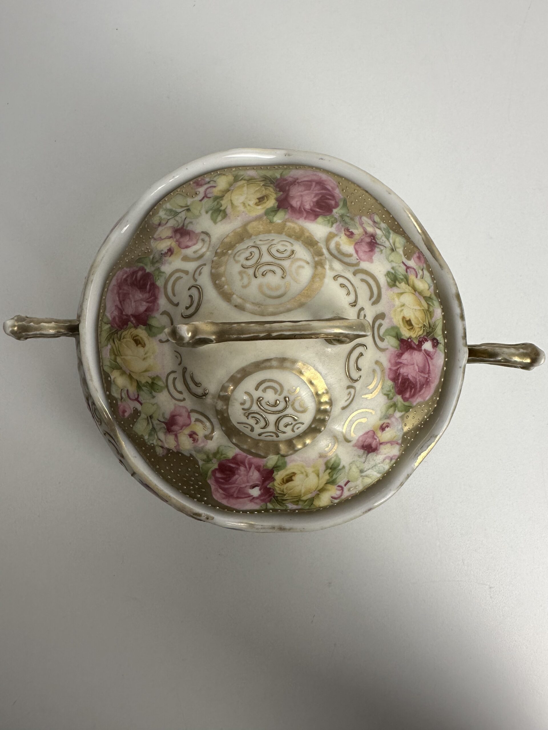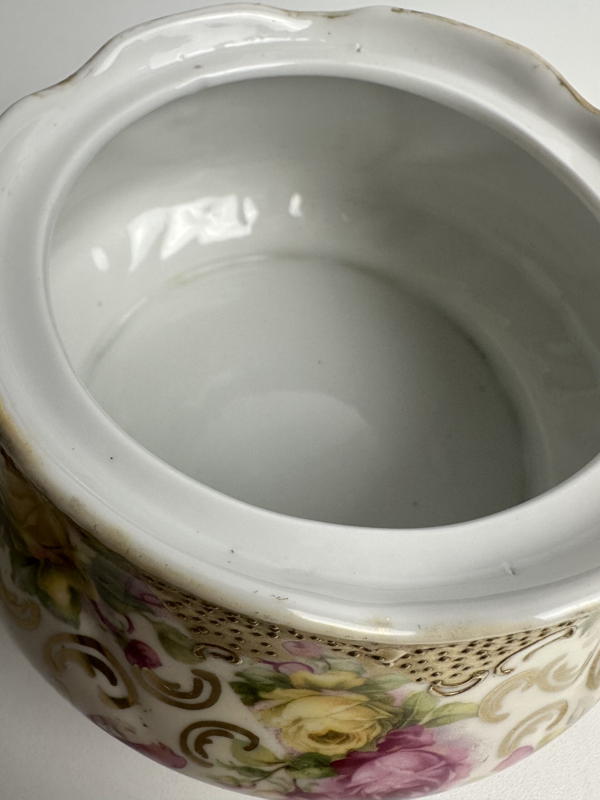 Elle peut être utilisée comme boîte à bijoux, pot à sucre, bonbonnière ou simplement comme élément décoratif dans un intérieur vintage, classique ou shabby chic.