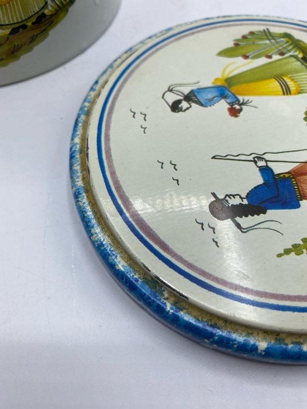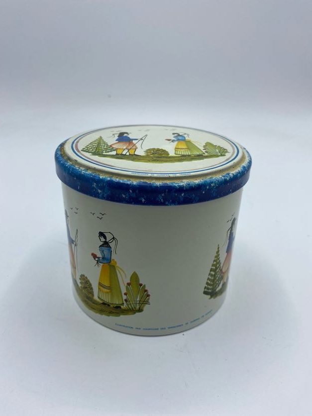 Cette jolie boîte en métal est une boîte à caramels et bonbons. De la marque française Massilly, la boîte couleur beige est décorée d’une reproduction d’illustration de faïences de Quimper de HB Henriot.