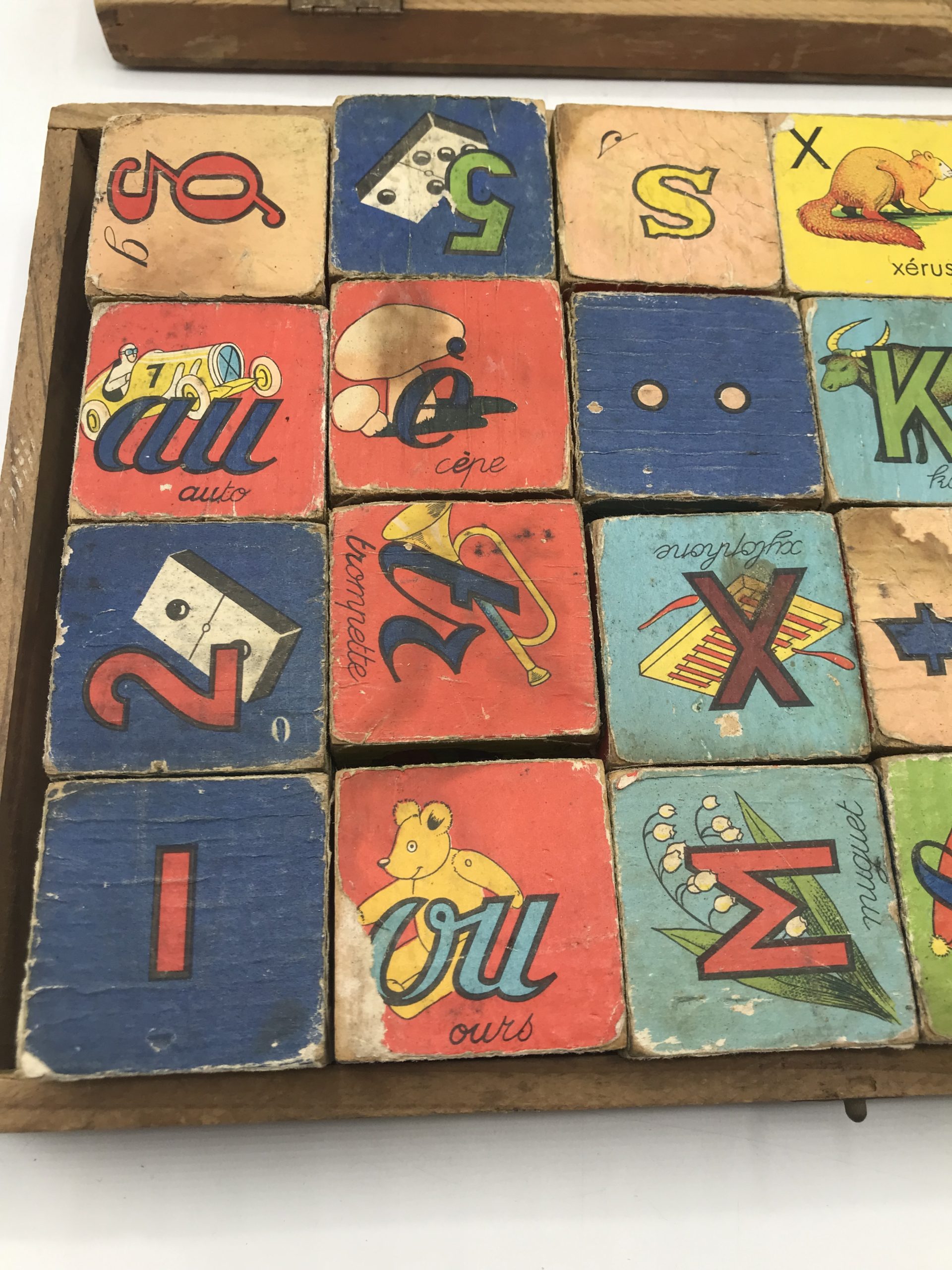 Mallette ancienne en bois des année 50/60 pour apprendre l’alphabet. Le coffret en bois est désolidarisé et ne tien pas ensemble. Les cubes ont subi quelques affres du temps et de la pluie. Voir (cf photos). Mais cela reste un beau petit beau de passé.