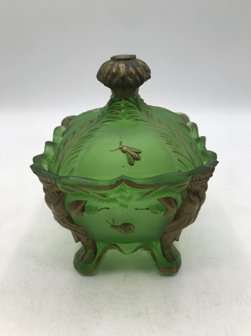 Bonbonnière en verre art nouveau. Très jolie petite bonbonnière en pate de verre de couleur verte. Les décors de cette petite bonbonnière sont de couleur dorée. Elle est ornée de petites cigales, de petits escargots et de personnages aux quatre coins. Elle présente des marques d’usure sur la couleur dorée et un éclat sur un des coins (cf photos). Joli petit bibelot à poser chez pour crée une belle ambiance art nouveau. Un style marqué et affirmé, osez. Surprenez vos amis et invités. Elle peut aussi servir de vide poche dans une entrée. Les idées ne manquent pas.